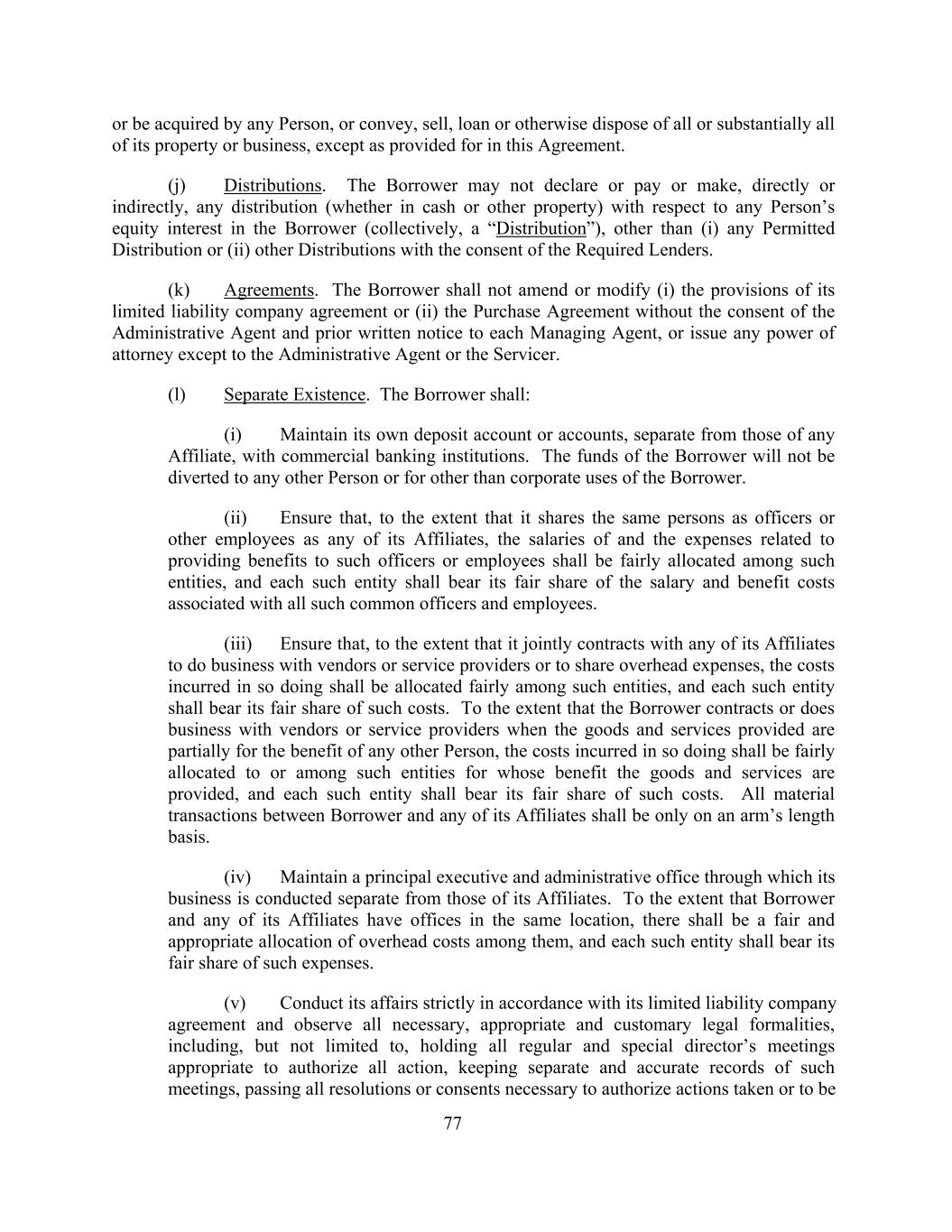 或被任何人收购,或转让、出售、贷款或以其他方式处置其全部或几乎全部财产或业务,但本协议规定的除外。(j)分配。借款人不得直接或间接就任何人在借款人的股权申报或支付或作出任何分配(不论是现金或其他财产)(统称为“分配”),但(i)任何许可分配或(ii)经所需贷款人同意的其他分配除外。(k)协议。未经行政代理人同意并事先书面通知各管理代理人,借款人不得修改或修改(i)其有限责任公司协议或(ii)购买协议的条款,或发出除行政代理人或服务人以外的任何授权委托书。(l)单独存在。借款人应:(i)在商业银行机构保持自己的一个或多个存款账户,与任何关联机构的账户分开。借款人的资金不会转用于任何其他人或借款人的公司以外用途。(二)确保在与其任何附属公司共享与高级职员或其他雇员相同的人员的范围内,向这些高级职员或雇员提供福利的工资和相关费用应在这些实体之间公平分配,并且每个此类实体应承担其与所有这些共同高级职员和雇员相关的工资和福利费用的公平份额。(iii)确保在其与任何关联公司共同签订合同以与供应商或服务提供商开展业务或分摊间接费用的范围内,这样做所产生的成本应在这些实体之间公平分配,并且每个此类实体应承担其公平分担的此类成本。如果借款人在所提供的货物和服务部分为任何其他人的利益时与供应商或服务提供者订立合同或开展业务,则这样做所产生的费用应公平分配给为其利益提供货物和服务的这些实体或在这些实体之间公平分配,并且每个此类实体应承担其公平分担的此类费用。借款人与其任何关联公司之间的所有重大交易应仅在公平基础上进行。(iv)维持一个主要行政和行政办公室,通过该办公室,其业务与其附属公司的业务分开进行。在借款人及其任何关联机构在同一地点设有办事处的范围内,应公平、适当地在它们之间分配间接费用,并且每个此类实体应承担其公平分担的此类费用。(v)严格按照其有限责任公司协议处理其事务,并遵守所有必要、适当和惯常的法律手续,包括但不限于举行所有定期和特别董事会议,以适当授权所有行动,保存此类会议的单独和准确记录,通过所有必要的决议或同意,以授权已采取或将采取的行动77