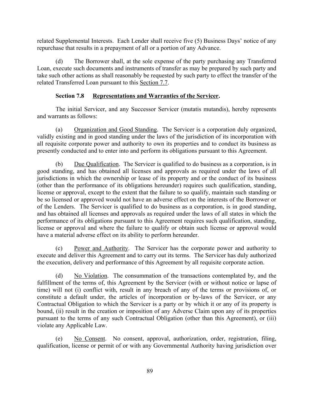 相关的补充利益。每个贷款人应收到五(5)个工作日的回购通知,导致提前偿还全部或部分预付款。(d)借款人须在购买任何已转让贷款的一方的全部费用下,签立该一方可能拟备的转让文件及文书,并采取该一方合理要求的其他行动,以根据本条第7.7条进行有关已转让贷款的转让。第7.8节服务商的陈述和保证。初始服务商,以及任何继任服务商(比照),在此声明和保证如下:(a)组织和良好信誉。服务商是一家正式组织、有效存在并在其公司成立的司法管辖区的法律下具有良好信誉的公司,拥有所有必要的公司权力和权力,以拥有其财产并按目前的方式开展其业务,并根据本协议订立和履行其义务。(b)适当资格。服务人有资格作为公司开展业务,信誉良好,并已按照其财产所有权或租赁和/或其业务的开展(履行其在本协议下的义务除外)所需的所有法域法律的要求获得所有许可和批准,除非未能获得此种资格、保持此种地位或获得此种许可或批准不会对借款人或贷款人的利益产生不利影响。服务商有资格作为一家公司开展业务,信誉良好,并已获得所有州法律规定的所有许可和批准,在这些州履行其根据本协议承担的义务需要此类资格、地位、许可或批准,如果未能获得资格或获得此类许可或批准将对其根据本协议履行的能力产生重大不利影响。(c)权力和权威。服务商拥有执行和交付本协议以及履行其条款的公司权力和权力。服务商已通过所有必要的公司行动正式授权执行、交付和履行本协议。(d)没有违反。服务商完成本协议所设想的交易和履行本协议的条款(无论是否有通知或时间流逝)将不会(i)与服务商的公司章程或附例,或服务商作为一方当事人或其或其任何财产受其约束的任何合同义务发生冲突、导致违反任何条款或规定,或构成违约,(ii)导致依据任何该等合约义务的条款(本协议除外)对其任何财产产生或施加任何不利债权,或(iii)违反任何适用法律。(e)没有同意。没有对89具有管辖权的任何政府当局的同意、批准、授权、命令、登记、备案、资格、许可或许可