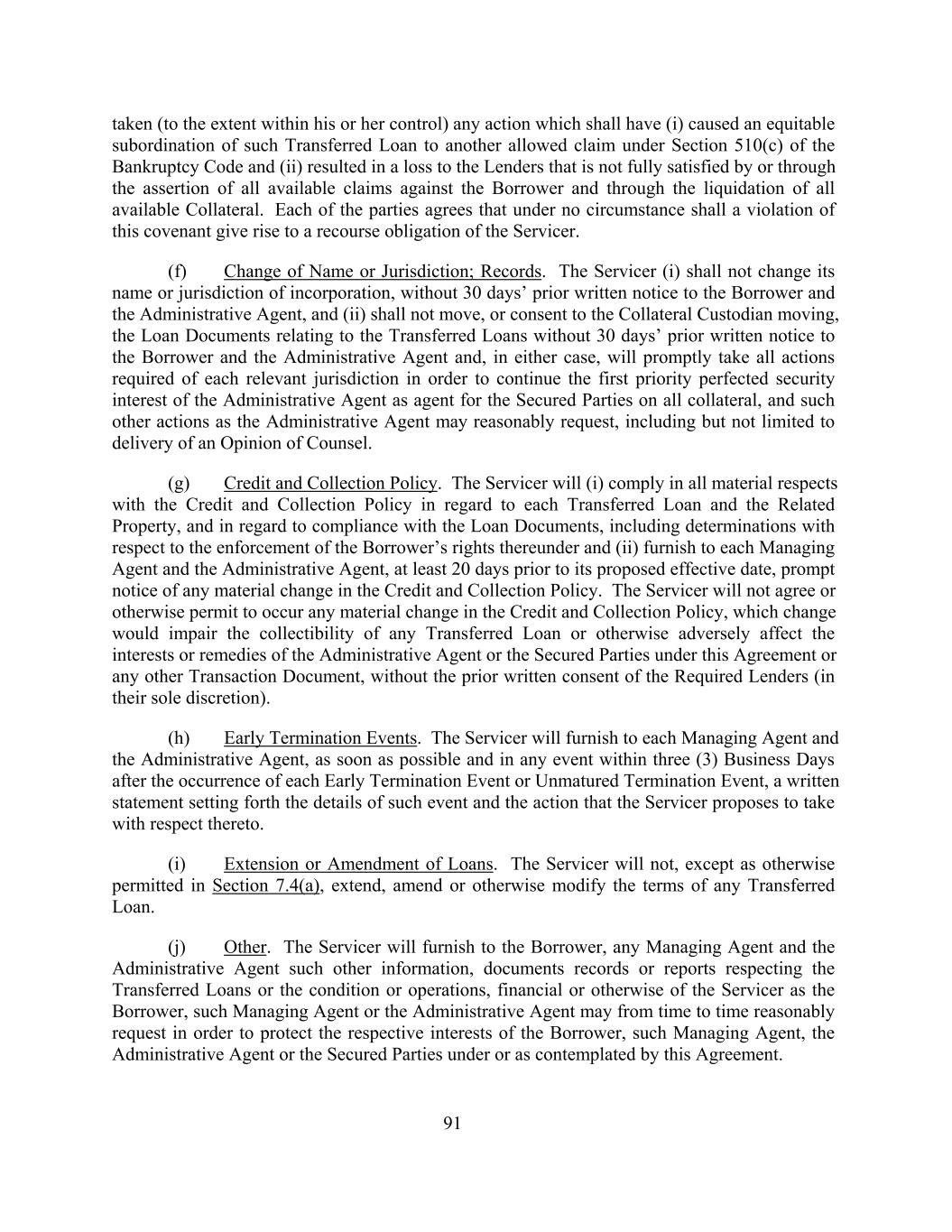 (在其控制范围内)采取的任何行动,如果(i)导致此类转让贷款根据《破产法》第510(c)条公平地从属于另一项允许的债权,以及(ii)导致贷款人的损失,但未能通过或通过对借款人的所有可用债权的主张以及通过清算所有可用抵押品而完全得到满足。各方同意,在任何情况下,违反本盟约的行为均不得引起服务人的追索义务。(f)更改名称或管辖权;记录。服务人(i)不得在未提前30天向借款人和行政代理人发出书面通知的情况下变更其名称或注册地管辖范围,以及(ii)不得在未提前30天向借款人和行政代理人发出书面通知的情况下移动或同意抵押品托管人移动与所转让贷款有关的贷款文件,并且在任何一种情况下,将迅速采取每个相关管辖范围所要求的一切行动,以延续行政代理人作为担保方代理人在所有担保物上的第一优先权完善的担保权益,以及行政代理人可能合理要求的其他行为,包括但不限于送达律师意见。(g)信贷和催收政策。服务商将(i)在所有重大方面遵守关于每笔转让贷款和相关财产的信贷和催收政策,并在遵守贷款文件方面,包括关于强制执行借款人在其下的权利的决定,以及(ii)至少在其提议的生效日期前20天向每一管理代理人和行政代理人提供信贷和催收政策的任何重大变化的及时通知。服务商不会同意或以其他方式允许发生信贷和催收政策的任何重大变更,该变更将损害任何已转让贷款的可收回性或以其他方式对行政代理人或有担保当事人在本协议或任何其他交易文件下的利益或补救措施产生不利影响,而无需获得所需贷款人的事先书面同意(由其自行决定)。(h)提前终止事件。服务商将尽快并无论如何在每个提前终止事件或未成熟终止事件发生后的三(3)个工作日内向每个管理代理和行政代理提供一份书面声明,其中载明该事件的细节以及服务商提议就此采取的行动。(i)延长或修订贷款。除第7.4(a)条另有许可外,服务人将不会延长、修订或以其他方式修改任何转让贷款的条款。(j)其他。服务人将向借款人、任何管理代理人和行政代理人提供关于所转让贷款或作为借款人的服务人的状况或经营、财务或其他方面的其他信息、文件记录或报告,该管理代理人或行政代理人可不时合理要求,以保护借款人、该管理代理人、行政代理人或本协议项下或本协议所设想的有担保当事人的各自利益。91