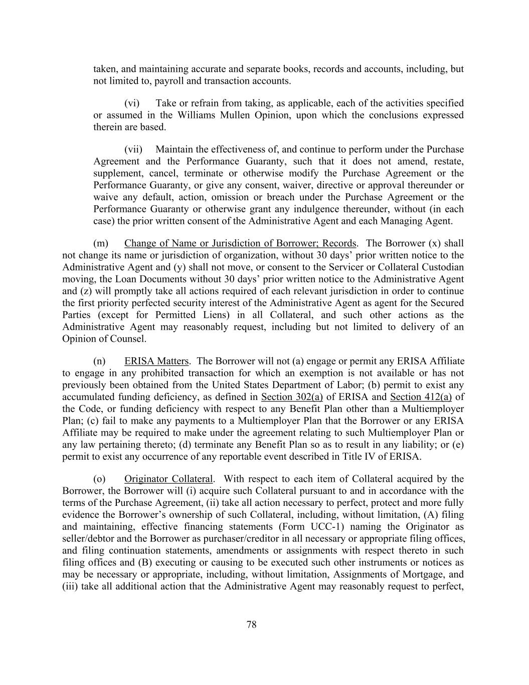 采取,并保持准确和单独的账簿、记录和账户,包括但不限于工资和交易账户。(vi)酌情采取或不采取威廉姆斯 Mullen意见中指明或假定的每一项活动,其中所述结论所依据的是该意见。(vii)维持购买协议及履约保证的有效性并继续履行,以使其不修订、重述、补充、取消、终止或以其他方式修改购买协议或履约保证,或根据该协议给予任何同意、放弃、指示或批准,或放弃购买协议或履约保证项下的任何失责、作为、不作为或违约,或以其他方式授予该协议项下的任何宽免,而无须(在每一情况下)行政代理人及各管理代理人的事先书面同意。(m)变更借款人的名称或管辖权;记录。借款人(x)不得变更其名称或组织管辖权,未提前30天书面通知行政代理人且(y)不得移动,或同意服务人或担保品托管人移动,未提前30天书面通知行政代理人且(z)将迅速采取各相关法域要求的一切行动,以延续行政代理人作为担保方代理人在所有担保物上的第一优先权完善的担保权益(允许的留置权除外),以及行政代理人可能合理要求的其他行为,包括但不限于送达律师意见。(n)ERISA事项。借款人将不会(a)聘用或允许任何ERISA关联公司从事任何无法获得豁免或以前未从美国劳工部获得豁免的禁止交易;(b)允许存在ERISA第302(a)条和《守则》第412(a)条所定义的任何累积资金短缺,或与除多雇主计划以外的任何福利计划有关的资金不足;(c)未能向借款人或任何ERISA关联公司根据与该多雇主计划有关的协议或与其有关的任何法律可能被要求支付的多雇主计划支付任何款项;(d)终止任何福利计划从而导致任何责任;或(e)允许存在ERISA标题IV中描述的任何可报告事件的任何发生。(o)发起人抵押品。就借款人获得的每一项抵押品而言,借款人将(i)根据并根据购买协议的条款获得此类抵押品,(ii)采取一切必要行动,以完善、保护和更充分地证明借款人对此类抵押品的所有权,包括但不限于(a)在所有必要或适当的备案办事处提交和维持有效的融资报表(UCC-1表格),将发起人指定为卖方/债务人,将借款人指定为买方/债权人,并提交延续报表,在该等申报处作出与之有关的修订或转让,以及(b)签立或促使签立可能需要或适当的其他文书或通知,包括但不限于按揭的转让,及(iii)采取行政代理人可能合理要求完善的所有额外行动,78