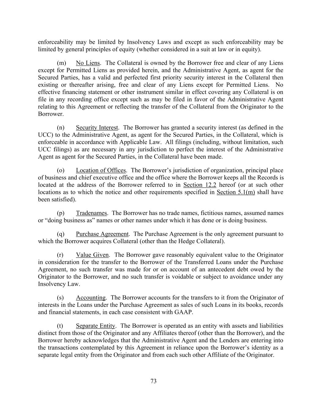 可执行性可能受到破产法的限制,除非这种可执行性可能受到一般公平原则的限制(无论是在法律诉讼中还是在公平中考虑)。(m)没有留置权。担保物归借款人所有,除本协议规定的允许的留置权外,不存在任何留置权,行政代理人作为有担保当事人的代理人,对当时存在或其后产生的担保物享有有效和完善的第一优先担保权益,不存在除允许的留置权外的任何留置权。除可能以有利于与本协议有关的行政代理人或反映担保物从发起人转移至借款人的方式提交的情况外,任何有效的融资报表或其他在效力上涵盖任何担保物的类似文书均不在任何记录处存档。(n)担保权益。借款人已将担保物上的担保权益(定义见UCC)授予行政代理人,作为有担保方的代理人,该担保权益可根据适用法律强制执行。在任何司法管辖区为完善行政代理人作为被担保方代理人的利益所必需的所有备案(包括但不限于此类UCC备案)均已在担保物中备案。(o)办事处的地点。借款人的组织管辖权、主要营业地点和行政总裁办公室以及借款人保存所有记录的办公室位于本条例第12.2条所指的借款人的地址(或第5.1(m)条所指明的通知和其他要求应已得到满足的其他地点)。(p)商标名称。借款人没有商号、虚构名称、假名或“以”名或其他已做或正在做生意的名称。(q)采购协议。购买协议是借款人获得抵押品(对冲抵押品除外)所依据的唯一协议。(r)给予的价值。借款人将购买协议项下转让的贷款转让给借款人作为对价,给予发起人合理等值的价值,没有为或因发起人欠借款人的前项债务而进行此种转让,并且根据任何破产法,此种转让均不可撤销或须予撤销。(s)会计。借款人在其账簿、记录和财务报表中将购买协议项下贷款权益的发起人向其转移的款项作为此类贷款的销售入账,在每种情况下均符合公认会计原则。(t)单独实体。借款人是作为一个资产和负债与发起人及其任何关联公司(借款人除外)的资产和负债不同的实体经营的,借款人在此承认,行政代理人和贷款人是根据借款人作为独立于发起人的法律实体的身份以及与发起人的这类其他关联公司进行本协议所设想的交易。73