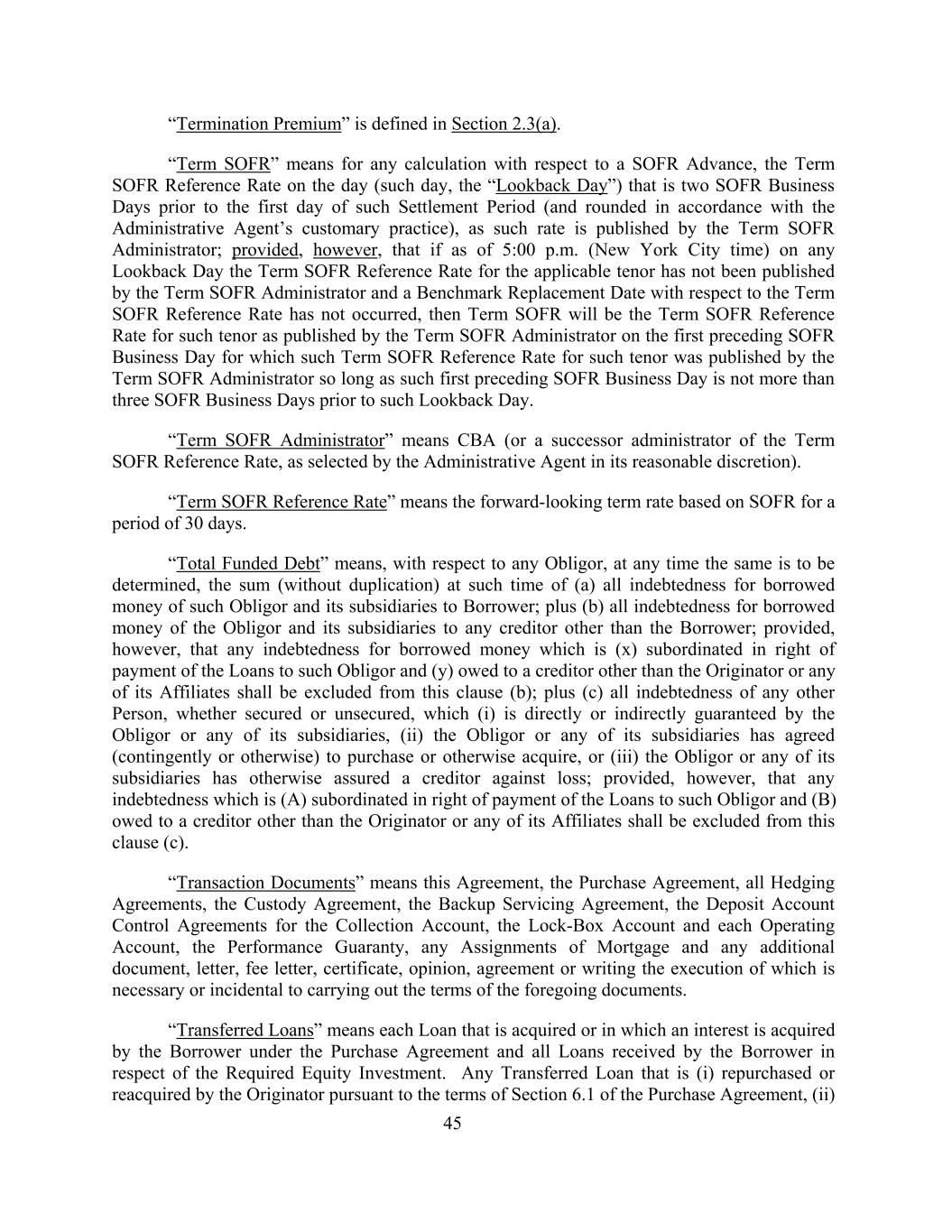 “终止保费”在第2.3(a)节中定义。“Term SOFR”是指就SOFR预付款进行的任何计算,在该结算期第一天之前的两个SOFR工作日当天(该日,“回溯日”)的Term SOFR参考利率(并按照行政代理人的惯例四舍五入),因为该利率由Term SOFR管理员公布;但是,前提是,如截至任何回溯日下午5时(纽约市时间),适用期限的期限SOFR参考利率尚未由期限SOFR管理人公布,且期限SOFR参考利率的基准更换日期尚未发生,则任期SOFR将是任期SOFR管理人在前一个SOFR营业日公布的任期SOFR参考利率,而该任期SOFR营业日之前的第一个任期SOFR参考利率由任期SOFR管理人公布,只要该前一个SOFR营业日不超过该回溯日之前的三个SOFR营业日。“任期SOFR管理员”是指CBA(或任期SOFR参考利率的继任管理员,由行政代理人在其合理酌情权下选择)。“期限SOFR参考利率”是指基于SOFR的前瞻性期限利率,期限为30天。“融资债务总额”是指,就任何债务人而言,在任何时候都将确定(a)该债务人及其附属公司向借款人所借资金的所有债务;加上(b)该债务人及其附属公司向借款人以外的任何债权人所借资金的所有债务的总和(不重复);但是,前提是,借入款项的任何债务,如(x)在向该债务人的贷款受付权上处于次级地位,以及(y)欠发起人或其任何关联公司以外的债权人,应排除在本条(b)项之外;加上(c)任何其他人的所有债务,不论是否有担保,而该债务(i)由债务人或其任何附属公司直接或间接担保,(ii)债务人或其任何附属公司已同意(或有或其他)购买或以其他方式取得,或(iii)债务人或其任何附属公司已以其他方式向债权人保证免受损失;但条件是,任何(a)在向该债务人的贷款受付权中处于从属地位的债务和(b)欠除发起人或其任何关联公司以外的债权人的债务,应排除在本条(c)项之外。“交易文件”指本协议、购买协议、所有套期保值协议、托管协议、备用服务协议、收款账户的存款账户控制协议、锁箱账户和各经营账户、履约保函、抵押的任何转让以及执行上述文件条款所必需或附带的任何附加文件、信函、费用信函、凭证、意见、协议或书面签署。“转让贷款”指借款人根据购买协议获得或获得权益的每笔贷款,以及借款人就所需股权投资收到的所有贷款。(i)由发起人根据购买协议第6.1节的条款回购或重新获得的任何转让贷款,(ii)45