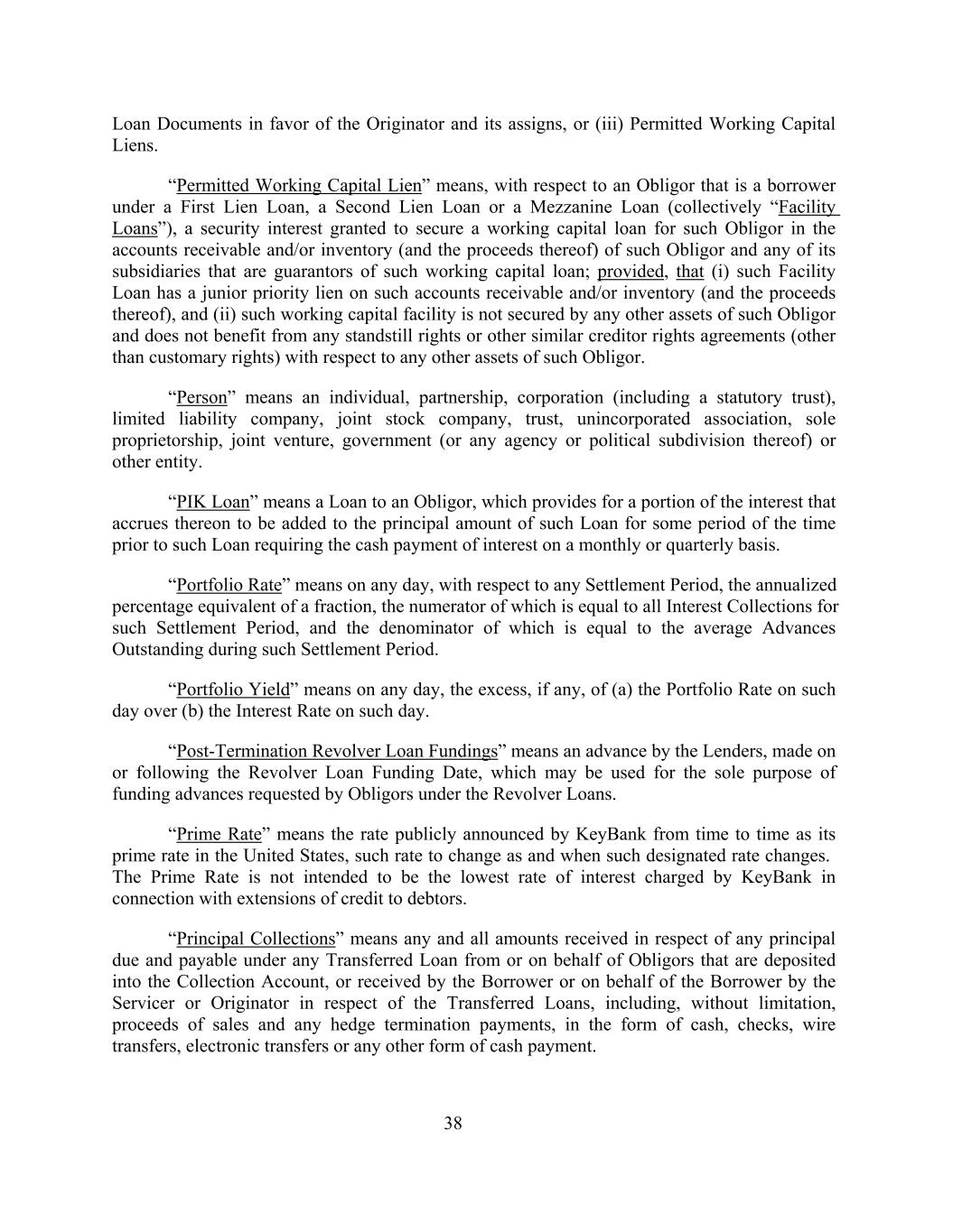 有利于发起人及其受让人的贷款文件,或(iii)许可的营运资金留置权。“许可营运资金留置权”是指,就作为第一留置权贷款、第二留置权贷款或夹层贷款(统称“融资贷款”)下的借款人的债务人而言,为在该债务人及其作为该营运资金贷款担保人的任何子公司的应收账款和/或存货(及其收益)中为该债务人担保营运资金贷款而授予的担保权益;但前提是(i)该融资贷款对该应收账款和/或存货(及其收益)具有次级优先留置权,(ii)该等营运资金融资不以该债务人的任何其他资产作担保,且不受益于与该债务人的任何其他资产有关的任何停顿权利或其他类似债权协议(习惯权利除外)。“人”是指个人、合伙企业、公司(包括法定信托)、有限责任公司、股份有限公司、信托、非法人协会、个人独资企业、合资企业、政府(或其任何机构或政治分支机构)或其他实体。“PIK贷款”是指向债务人提供的贷款,该贷款规定在该贷款需要按月或按季以现金支付利息之前的某段时间内,其所产生的部分利息将被添加到该贷款的本金额中。“投资组合利率”是指在任何一天,就任何结算期而言,相当于一个分数的年化百分比,其分子等于该结算期的所有利息收款,其分母等于该结算期的平均未偿还预付款。“投资组合收益率”是指在任何一天,(a)该日的投资组合利率超过(b)该日利率的部分(如有)。“终止后循环贷款融资”是指贷款人在循环贷款融资日期或之后作出的垫款,可仅用于为债务人根据循环贷款要求的垫款提供资金。“最优惠利率”是指KeyBank不时公开宣布的利率,作为其在美国的最优惠利率,该利率将在该指定利率发生变化时发生变化。Prime Rate并不是KeyBank就向债务人提供信贷而收取的最低利率。“本金催收”是指从债务人或代表债务人收到的任何转让贷款项下到期应付的任何本金,存入催收账户,或由借款人或由服务人或发起人代表借款人收到的有关转让贷款的任何及所有金额,包括但不限于销售收益和任何对冲终止付款,形式为现金、支票、电汇、电子转账或任何其他形式的现金支付。38