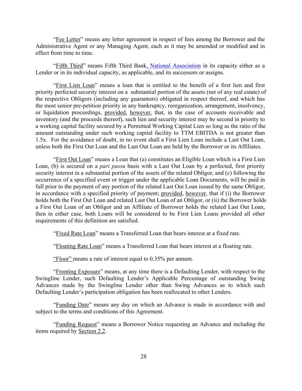 「费用函件」指借款人与行政代理人或任何管理代理人就费用订立的任何函件协议,每份协议均可修订或修改,并不时生效。“五三银行”指五三银行银行、以贷款人身份或以适用的个人身份(如适用)的全国协会及其继任者或受让人。“第一留置权贷款”是指有权对相关债务人(包括任何担保人)的相当大一部分资产(扣除任何不动产)享有第一留置权和第一优先权完善担保权益的贷款,并且在任何破产、重组、安排、无力偿债或清算程序中具有最优先的申请前优先权,但前提是,在应收账款和库存品(及其收益)的情况下,此类留置权和担保权益可以是由允许的营运资金留置权担保的营运资金融资的第二优先权,只要此类营运资金融资下的未偿金额与TTM EBITDA的比率不大于1.5x。为免生疑问,在任何情况下,第一留置权贷款均不得包括最后一笔贷款,除非先出贷款和最后一笔贷款均由借款人或其关联机构持有。“先出贷款”是指(a)构成合格贷款且为第一留置权贷款的贷款,(b)由相关债务人的大部分资产上的完善的第一优先担保权益以与后出贷款同等的基础上提供担保,以及(c)在发生适用贷款文件下的特定事件或触发后,将在同一债务人根据特定的支付优先权支付相关后出贷款的任何部分之前全额支付的贷款;但是,前提是,如果(i)借款人同时持有债务人的先出贷款和相关的后出贷款,或(ii)借款人持有债务人的先出贷款,而借款人的关联公司持有相关的后出贷款,则在任一情况下,只要满足本定义的所有其他要求,这两笔贷款将被视为优先留置权贷款。“固定利率贷款”是指按固定利率计息的转让贷款。“浮动利率贷款”是指以浮动利率计息的转让贷款。“下限”是指年利率等于0.35%的利率。“Fronting Exposure”是指,在任何时候存在违约贷款人时,就Swingline贷款人而言,该违约贷款人的适用百分比为该违约贷款人的参与义务已重新分配给其他贷款人的Swingline贷款人所提供的除Swingline Advances之外的未偿Swingline Advances。“融资日期”是指根据本协议的条款和条件并受其约束进行垫款的任何一天。“资金请求”是指借款人通知,要求提供预付款并包括第2.2节要求的项目。28