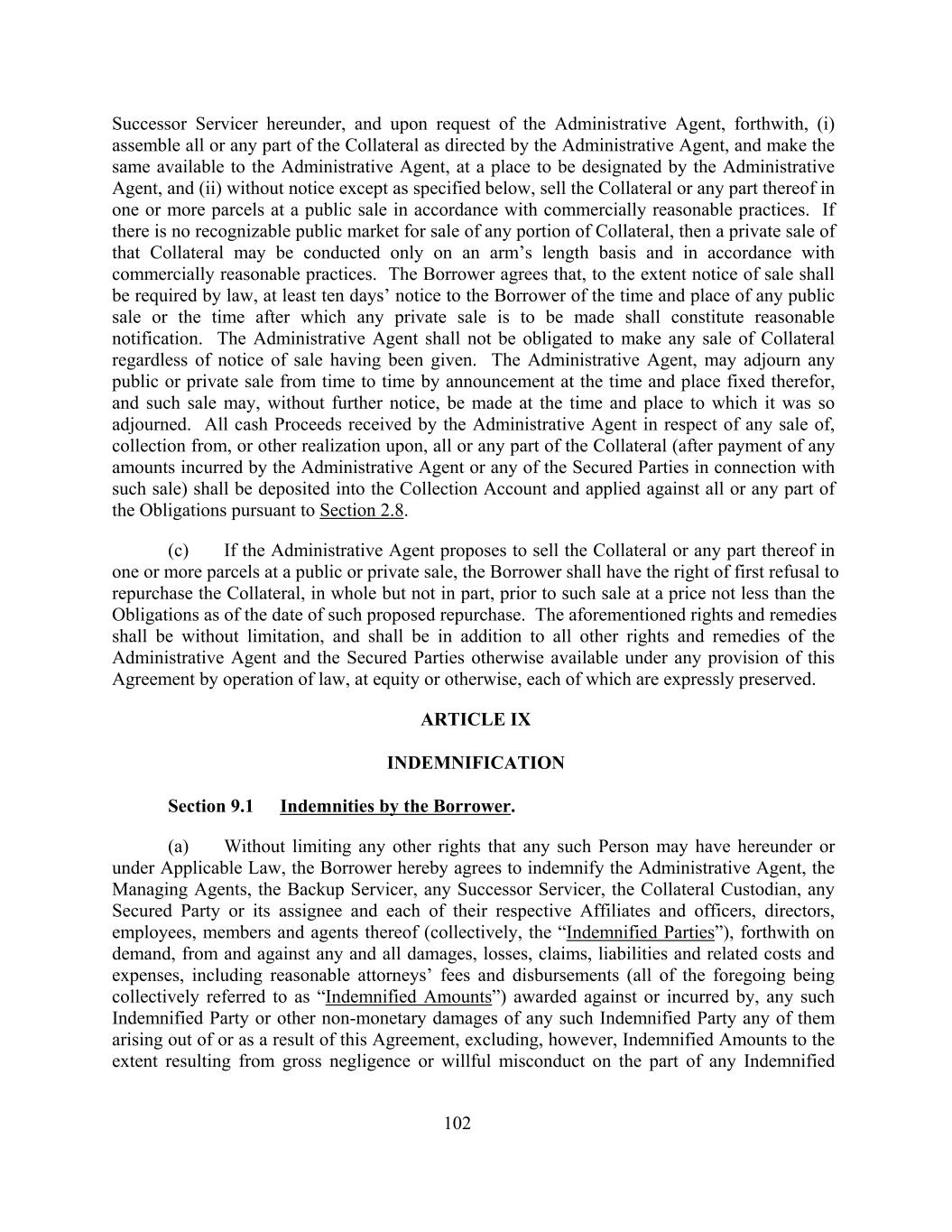 本协议项下的继承服务人,并应行政代理人的要求,随即(i)按行政代理人的指示组装抵押品的全部或任何部分,并将其提供给行政代理人,在行政代理人指定的地点,以及(ii)除下文指明的情况外,不经通知,按照商业上合理的惯例在公开出售一个或多个包裹中出售抵押品或其任何部分。如果没有可供出售任何部分抵押品的可识别的公开市场,那么该抵押品的私人出售只能在公平的基础上并按照商业上合理的做法进行。借款人同意,在法律要求的出售通知范围内,至少提前十天通知借款人任何公开出售的时间和地点或任何私下出售的时间之后,即构成合理通知。无论是否已发出变卖通知,行政代理人均无义务进行任何变卖担保物的变卖。行政代理人,可在为其订定的时间和地点不时以公告方式将任何公开或私下出售押后,而该出售可在如此押后的时间和地点进行,而无须另行通知。行政代理人就抵押物的全部或任何部分的任何出售、收款或以其他方式变现而收到的所有现金收益(在行政代理人或任何有担保当事人因该出售而招致的任何金额得到支付后)应存入收款账户,并根据第2.8节的规定用于抵偿全部或任何部分债务。(c)如果行政代理人提议以公开或私下出售的方式出售一个或多个宗地中的担保物或其任何部分,借款人应有权在出售前以不低于截至提议回购之日的义务的价格回购担保物的全部而非部分。上述权利和补救办法不受限制,应是行政代理人和有担保当事人在本协议任何条款下通过法律实施、衡平法或其他方式可获得的所有其他权利和补救办法之外的补充,每一项权利和补救办法均明确予以保留。第九条赔偿第9.1节借款人的赔偿。(a)在不限制任何该等人根据本协议或根据适用法律可能拥有的任何其他权利的情况下,借款人特此同意根据要求立即向行政代理人、管理代理、后备服务人、任何继任服务人、抵押品托管人、任何有担保方或其受让人及其各自的关联公司和高级职员、董事、雇员、成员及其代理人(统称“受偿方”)作出赔偿,以抵偿任何和所有损害、损失、索赔、责任以及相关成本和费用,包括针对任何该等获弥偿方或任何该等获弥偿方因本协议而产生或因本协议而产生的其他非金钱损害而判给或招致的合理律师费及付款(所有上述统称为“弥偿金额”),但不包括因任何获弥偿102的重大过失或故意不当行为而导致的弥偿金额