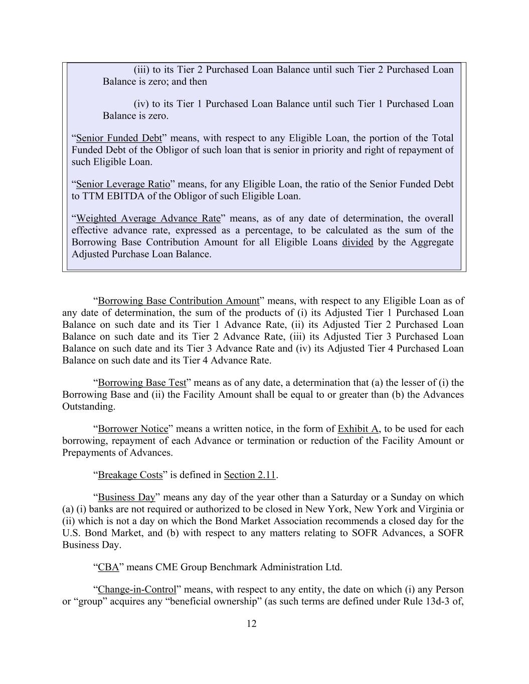 12“借款基础供款金额”是指,就截至任何确定日期的任何合格贷款而言,(i)其在该日期的调整后一级购买贷款余额及其一级预付率,(ii)其在该日期的调整后二级购买贷款余额及其二级预付率,(iii)其在该日期的调整后三级购买贷款余额及其三级预付率,以及(iv)其在该日期的调整后三级购买贷款余额及其四级预付率的乘积之和。“借款基数测试”是指截至任何日期,确定(a)(i)借款基数和(ii)融资金额中的较小者应等于或大于(b)未偿预付款。“借款人通知”是指用于每笔借款、偿还每笔垫款或终止或减少融资金额或预付款的书面通知,形式为附件 A。“破碎费”在第2.11节中有定义。“营业日”是指一年中除星期六或星期日以外的任何一天,其中(a)(i)纽约、纽约和弗吉尼亚州的银行没有被要求或授权关闭,或(ii)不是债券市场协会建议美国债券市场休市的一天,以及(b)就与SOFR垫款有关的任何事项而言,SOFR营业日。“CBA”是指芝加哥商品交易所 Benchmark Administration Ltd.。就任何实体而言,“控制权变更”是指(i)任何个人或“集团”获得任何“实益所有权”(因为这些术语根据规则13d-3定义,(iii)其二级购买贷款余额,直至该二级购买贷款余额为零;然后(iv)其一级购买贷款余额,直至该一级购买贷款余额为零。“优先融资债务”是指,就任何合格贷款而言,该贷款的债务人的总融资债务中优先于该合格贷款的优先权和受偿权的部分。“优先杠杆比率”是指,对于任何符合条件的贷款,优先融资债务与该等符合条件贷款的债务人的TTM EBITDA的比率。“加权平均预付率”是指,截至任何确定日期,以百分比表示的总体有效预付率计算为所有符合条件的贷款的借款基础贡献金额之和除以调整后的购买贷款余额总额。