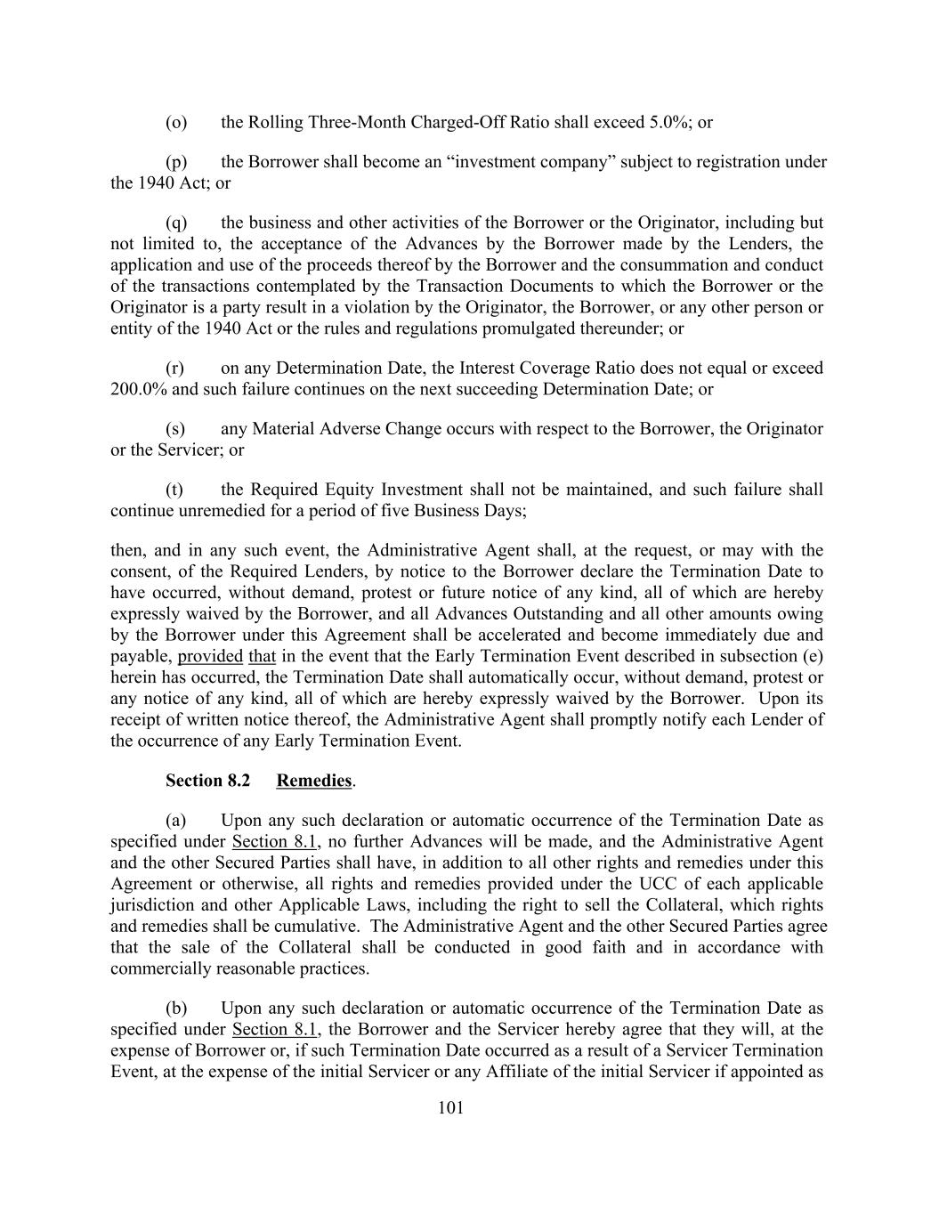 (o)三个月滚动核销比例应超过5.0%;或(p)借款人应成为根据1940年法案进行登记的“投资公司”;或(q)借款人或发起人的业务和其他活动,包括但不限于借款人接受贷款人作出的垫款、借款人申请和使用其收益以及完成和进行借款人或发起人作为一方当事人的交易文件所设想的交易,导致发起人、借款人的违规,或1940年法案或根据该法案颁布的规则和条例的任何其他个人或实体;或(r)在任何确定日期,利息覆盖率不等于或超过200.0%且此种失败在下一个确定日期继续存在;或(s)借款人、发起人或服务人发生任何重大不利变化;或(t)所要求的股权投资不得维持,此种失败应在五个工作日内继续未得到补救;然后,在任何此种情况下,行政代理人应请求,或可经规定贷款人同意,藉向借款人发出的通知,宣布终止日期已发生,而无须要求、抗议或任何种类的未来通知,所有这些均由借款人特此明确放弃,借款人根据本协议欠下的所有垫款和所有其他款项应加速并立即到期应付,但条件是在发生本(e)款所述提前终止事件的情况下,终止日期应自动发生,而无需要求、抗议或任何种类的通知,所有这些都特此由借款人明确放弃。行政代理人收到书面通知后,应当及时将提前终止事件的发生情况通知各出借人。第8.2节补救办法。(a)一旦根据第8.1节规定的任何此类声明或终止日期自动发生,将不再进行垫款,并且除本协议或其他项下的所有其他权利和补救措施外,行政代理人和其他有担保当事人应拥有根据每个适用司法管辖区的UCC和其他适用法律提供的所有权利和补救措施,包括出售抵押品的权利,这些权利和补救措施应是累积的。行政代理人与其他有担保当事人约定,抵押物的出售应当本着善意,按照商业上合理的做法进行。(b)一旦根据第8.1条指明的终止日期发生任何该等声明或自动发生,借款人及服务人特此同意,他们将由借款人承担费用,如该终止日期是由于服务人终止事件而发生,则由初始服务人或初始服务人的任何附属公司承担费用(如获委任为101