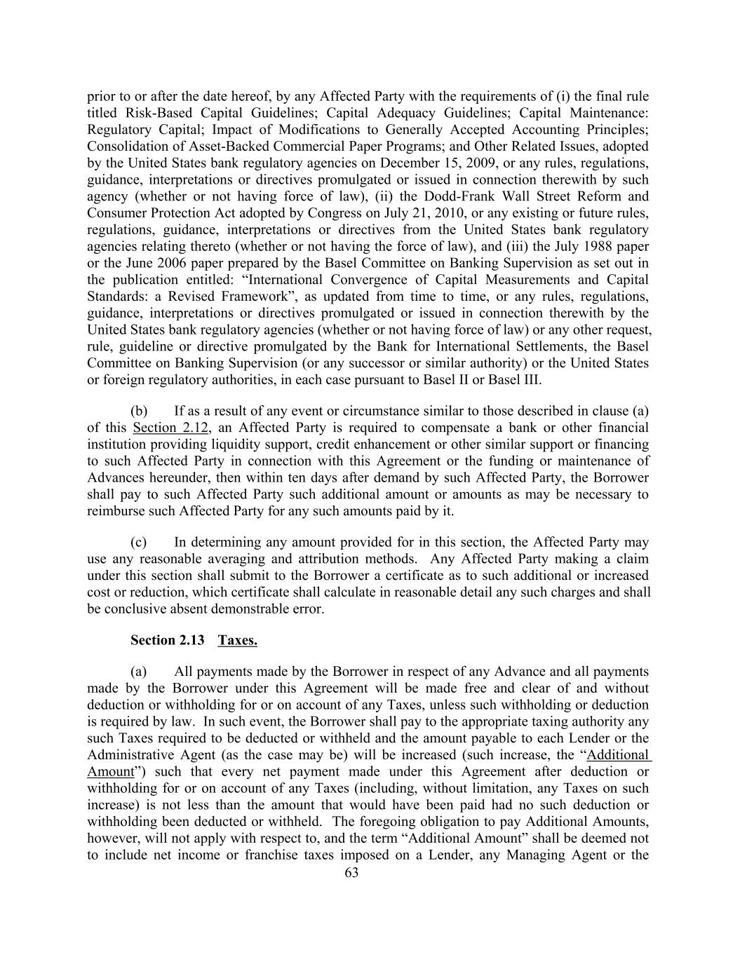 在本协议日期之前或之后,由具有(i)最终规则标题为“基于风险的资本指引”;资本充足率指引;资本维持:监管资本;修改公认会计原则的影响;资产支持商业票据计划的合并;以及其他相关问题的任何受影响方,由美国银行监管机构于2009年12月15日通过,或由该机构颁布或发布的与此相关的任何规则、条例、指南、解释或指令(无论是否具有法律效力),(二)国会于2010年7月21日通过的《多德-弗兰克华尔街改革和消费者保护法》,或美国银行监管机构与之相关的任何现有或未来的规则、条例、指导、解释或指令(无论是否具有法律效力),以及(三)巴塞尔银行监管委员会于1988年7月编写的文件或2006年6月编写的文件,载于题为《资本计量和资本标准的国际趋同:经修订的框架》的出版物中,不时更新,或任何规则、条例、指导,美国银行监管机构(无论是否具有法律效力)颁布或发布的与此相关的解释或指令,或国际清算银行、巴塞尔银行监管委员会(或任何继承或类似机构)或美国或外国监管机构颁布的任何其他请求、规则、指南或指令,在每种情况下均根据巴塞尔协议II或巴塞尔协议III。(b)如因任何与本条第2.12条(a)款所述类似的事件或情况,受影响一方须就本协议或本协议项下垫款的资金或维持向该受影响一方提供流动性支持、信用增级或其他类似支持或融资的银行或其他金融机构作出赔偿,则在该受影响一方提出要求后十天内,借款人应向该受影响方支付可能需要的额外金额或金额,以偿还该受影响方所支付的任何此类金额。(c)在确定本条规定的任何金额时,受影响方可使用任何合理的平均和归属方法。任何受影响的一方根据本条提出索赔,应向借款人提交关于此类额外或增加的成本或减少的证明,该证明应合理详细地计算任何此类费用,并且在没有明显错误的情况下应是结论性的。第2.13节税收。(a)借款人就任何预付款所作的所有付款以及借款人根据本协议所作的所有付款,将免费、清零,且不会因任何税款或因任何税款而扣除或扣缴,除非法律要求此种扣缴或扣缴。在这种情况下,借款人应向适当的税务机关缴纳任何要求扣除或代扣代缴的此类税款,并增加应支付给每个贷款人或行政代理人(视情况而定)的金额(此类增加,“额外金额”),以使根据本协议为任何税款(包括但不限于此类增加的任何税款)扣除或代扣代缴后的每笔净付款不低于如果没有扣除或代扣代缴本应支付的金额。然而,上述支付额外金额的义务将不适用于,“额外金额”一词应被视为不包括对贷款人、任何管理代理或63
