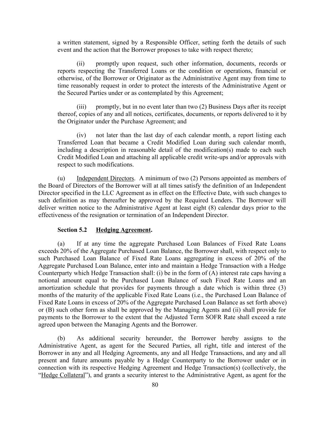 一份书面声明,由一名负责官员签署,载明该事件的详情以及借款人拟就该事件采取的行动;(二)应要求迅速提供行政代理人为保护行政代理人或本协议所设想的有担保当事人根据本协议或在本协议所设想的情况下,不时合理要求的有关所转让贷款或借款人或发起人的财务或其他条件或运作的其他资料、文件、记录或报告;(三)迅速,但在任何情况下,不得迟于其收到后两(2)个营业日,发起人根据购买协议向其交付的任何及所有通知、证书、文件或报告的副本;及(iv)不迟于每个历月的最后一天,一份报告,列出在该历月内成为信用修改贷款的每笔转让贷款,包括对每笔该等信用修改贷款作出的修改的合理详细说明,并附上与该等修改有关的所有适用的信用增记和/或批准。(u)独立董事。至少两(2)名获委任为借款方董事会成员的人士将在任何时候满足有限责任公司协议中规定的在生效日期生效的独立董事的定义,并对定义进行更改,这些更改随后可能会获得所需借款方的批准。借款人将在独立董事辞职或终止任职生效至少八(8)个日历日前向行政代理人送达书面通知。第5.2节套期保值协议。(a)如在任何时候,固定利率贷款的购买贷款余额总额超过购买贷款余额总额的20%,借款人只须就该等购买贷款余额总额超过购买贷款余额总额的20%的固定利率贷款,与对冲交易对手订立并维持对冲交易,该对冲交易应:(i)形式为(a)名义金额等于该等固定利率贷款的已购贷款余额的利率上限,以及规定通过适用的固定利率贷款到期后三(3)个月内的日期付款的摊销时间表(即,固定利率贷款的已购贷款余额超过上述已购贷款总余额的20%)或(b)应由管理代理批准的其他形式和(ii)应规定支付给借款人的款项,但以调整后的定期SOFR利率应超过管理代理与借款人之间商定的利率为限。(b)作为本协议项下的额外担保,借款人特此将借款人在任何和所有套期保值协议、任何和所有套期保值交易中的所有权利、所有权和权益,以及对冲对手方根据或与其各自的套期保值协议和套期保值交易(统称为“套期担保品”)相关的任何和所有当前和未来应付给借款人的金额(统称为“套期担保品”)转让给作为担保方代理人的行政代理人,并授予担保权益,作为80