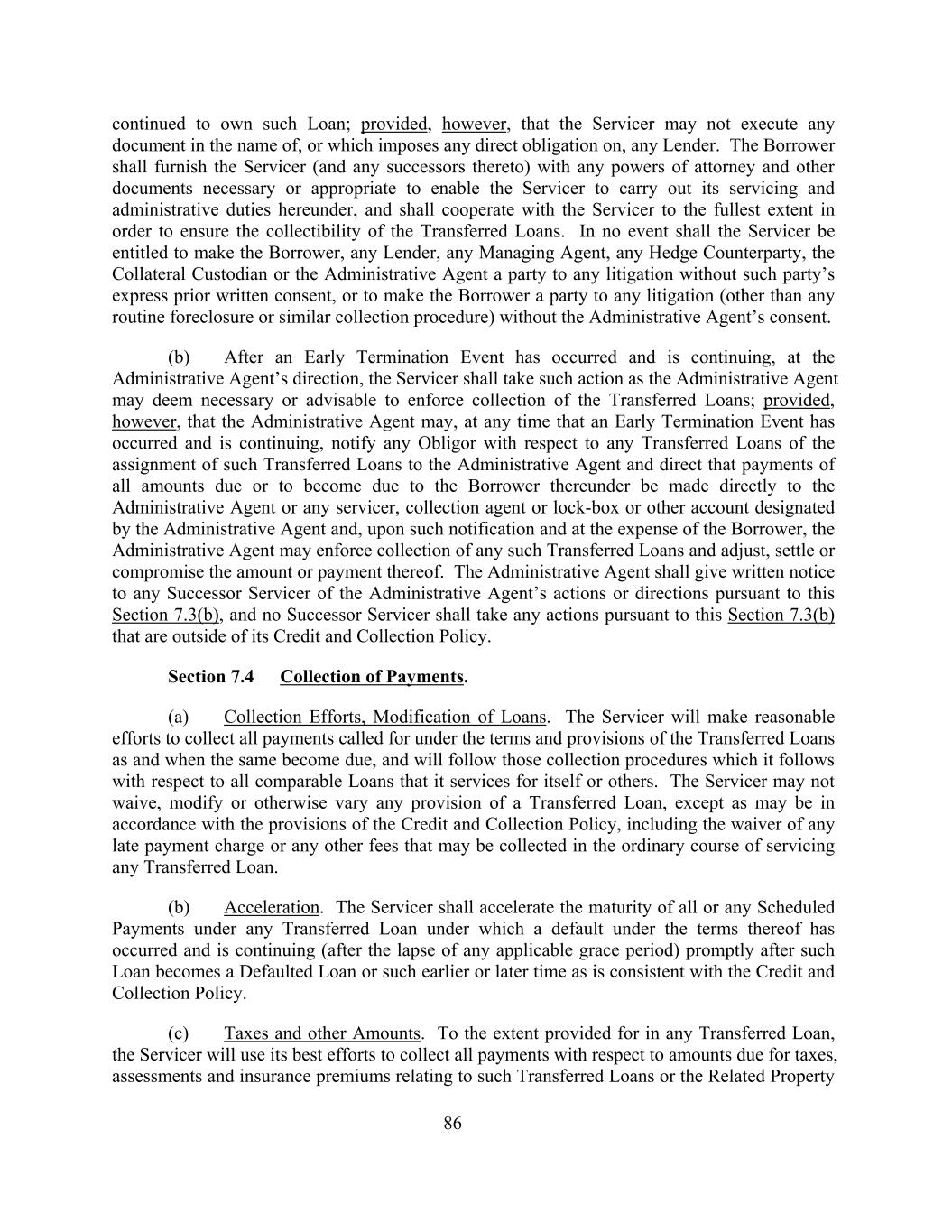 继续拥有此类贷款;但条件是服务商不得以任何贷款人的名义签署任何文件,或对其施加任何直接义务。借款人应向服务人(及其任何继承人)提供任何必要或适当的授权书和其他文件,以使服务人能够履行其在本协议项下的服务和行政职责,并应与服务人进行最大程度的合作,以确保所转让贷款的可收回性。在任何情况下,服务人均无权使借款人、任何贷款人、任何管理代理人、任何对冲对手方、抵押品托管人或行政代理人成为任何诉讼的一方当事人,也无权使借款人成为任何诉讼的一方当事人(任何例行止赎或类似催收程序除外),而无需行政代理人的同意。(b)在提前终止事件已经发生并正在继续的情况下,在行政代理人的指示下,服务人应采取行政代理人认为必要或可取的行动,以强制收取已转让的贷款;但条件是,行政代理人可以在提前终止事件已经发生并正在继续的任何时候,将此种转让贷款转让给行政代理人的情况通知任何转让贷款的债务人,并指示直接向行政代理人或行政代理人指定的任何服务人、托收代理人或锁箱或其他账户支付根据该协议到期或将到期的所有金额,经此通知并由借款人承担费用,行政代理人可强制收取任何此种转让贷款,并调整、结算或妥协其金额或支付。行政代理人应将行政代理人依据本条第7.3(b)款采取的行动或指示书面通知任何继任服务人,任何继任服务人不得依据本条第7.3(b)款采取其信用和收款政策之外的任何行动。第7.4节收款。(a)催收努力,修改贷款。服务商将作出合理努力,在转让贷款的条款和规定到期时收取所要求的所有款项,并将就其为自己或他人服务的所有可比贷款遵循其遵循的收款程序。服务商不得放弃、修改或以其他方式更改转让贷款的任何条款,除非根据信贷和催收政策的规定,包括免除任何滞纳金或在为任何转让贷款提供服务的正常过程中可能收取的任何其他费用。(b)加速。服务商应在任何已转让贷款项下的所有或任何预定付款在其条款下已发生违约并正在继续(在任何适用的宽限期失效后)在该贷款成为违约贷款或与信贷和收款政策一致的更早或更晚时间后迅速加速到期。(c)税款和其他数额。在任何转让贷款中规定的范围内,服务商将尽最大努力收取与此类转让贷款或相关财产有关的应缴税款、评估和保险费的所有款项86