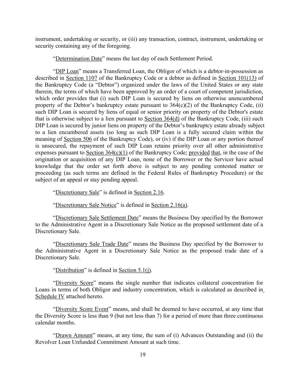 文书、保证或担保,或(iii)任何包含上述任何内容的交易、合约、文书、保证或担保。“确定日”是指每个结算期的最后一天。“DIP贷款”是指转让的贷款,其债务人是《破产法》第1107条所述的债务人占有权或《破产法》第101(13)条所定义的债务人(“债务人”),根据美国或其中任何州的法律组建,其条款已由有管辖权的法院的命令批准,该命令规定(i)此类DIP贷款由根据《破产法》第364(c)(2)条对债务人破产财产的其他未设押财产的留置权担保,(ii)该等DIP贷款以依据《破产法》第364(d)条以其他方式受留置权约束的债务人遗产财产上的同等或优先留置权作担保,(iii)该等DIP贷款以已受留置权担保资产约束的债务人破产财产上的次级留置权作担保(只要该DIP贷款是《破产法》第506条所指的完全担保债权),或(iv)如果DIP贷款或其任何部分是无担保的,根据《破产法》第364(c)(1)条,此类DIP贷款的偿还保留优先于所有其他管理费用的优先权;条件是,在发起或获得任何DIP贷款的情况下,借款人或服务商均不实际知道上述命令受制于任何未决的有争议事项或程序(如联邦破产程序规则中定义的此类条款)或上诉的主体或暂停等待上诉。“全权出售”在第2.16节中有定义。“全权出售通知”在第2.16(a)节中定义。“全权出售结算日”是指借款人在全权出售通知中向行政代理人指定的营业日,作为全权出售的建议结算日。“全权出售交易日”是指借款人在全权出售通知中向行政代理人指定的营业日,作为全权出售的拟议交易日。“分配”在第5.1(j)节中定义。“多样性得分”是指在债务人和行业集中度方面表明贷款抵押品集中度的单一数字,其计算方法见本文件所附附表IV。“多样性得分事件”是指,并应被视为已发生,在任何时候,多样性得分低于9(但不低于7)的持续时间超过三个连续日历月。“提取金额”是指,在任何时候,(i)未偿还的垫款和(ii)循环贷款在该时间未提供资金的承诺金额之和。19