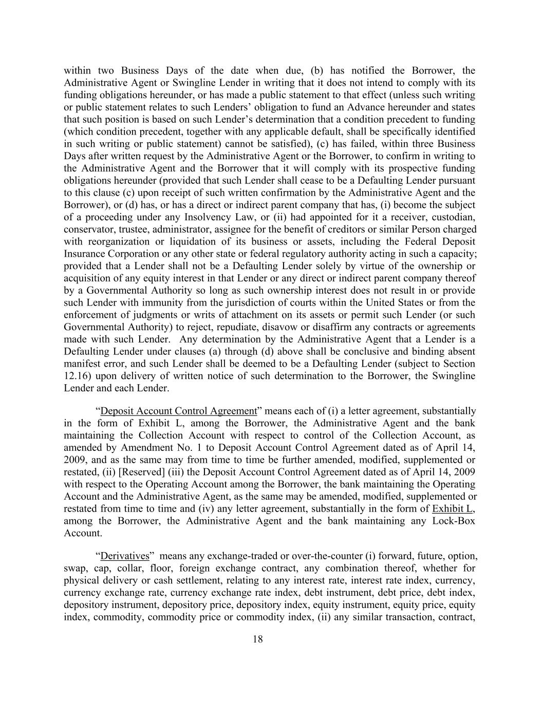 在到期之日起两个营业日内,(b)已书面通知借款人、行政代理人或Swingline贷款人,其不打算遵守其在本协议项下的筹资义务,或已就此作出公开声明(除非该书面或公开声明涉及该等贷款人根据本协议为预付款提供资金的义务,并声明该立场是基于该贷款人确定无法满足筹资的先决条件(该先决条件连同任何适用的违约应在该书面或公开声明中具体指明),(c)在行政代理人或借款人提出书面请求后三个营业日内,未能向行政代理人和借款人书面确认其将遵守本协议项下的预期筹资义务(但该贷款人在收到行政代理人和借款人的书面确认后,即根据本条(c)款不再是违约贷款人),或(d)已有或已有一家直接或间接的母公司,(i)已成为任何破产法下的程序的主体,或(ii)已为其指定接管人,托管人、保管人、受托人、管理人、为债权人或被控对其业务或资产进行重组或清算的类似人的利益受让人,包括联邦存款保险公司或以这种身份行事的任何其他州或联邦监管机构;但贷款人不得仅因拥有或获得任何股权而成为违约贷款人该贷款人或政府当局对其任何直接或间接的母公司,只要该所有权权益不会导致或向该贷款人提供豁免,使其不受美国境内法院的管辖权或对其资产执行判决或扣押令的豁免,或允许该贷款人(或该政府当局)拒绝、否定、否认或否认与该贷款人订立的任何合同或协议。行政代理人根据上述(a)至(d)条作出的关于贷款人为违约贷款人的任何确定,在没有明显错误的情况下,应为结论性的和具有约束力的,而该贷款人在向借款人、Swingline贷款人和每个贷款人交付有关该确定的书面通知时,应被视为违约贷款人(根据第12.16条)。「存款账户管制协议」指(i)借款人、行政代理人及维持托收账户的银行就托收账户的控制权而订立的基本上以附件 L形式订立的函件协议,经日期为二零零九年四月十四日的存款账户管制协议第1号修订,并视其不时进一步修订、修改、补充或重述,(ii)[保留](iii)日期为二零零九年四月十四日的借款人之间就营运账户订立的存款账户管制协议,维护操作账户和行政代理人的银行,因为同样可能会不时修改、修改、补充或重述以及(iv)借款人、行政代理人和维护任何Lock-Box账户的银行之间的任何信函协议,基本上是以附件 L的形式。“衍生工具”是指任何交易所交易或场外交易(i)远期、期货、期权、掉期、上限、项圈、下限、外汇合约、其任何组合,不论是实物交割或现金结算,涉及任何利率、利率指数、货币、货币汇率、货币汇率指数、债务工具、债务价格、债务指数、存款工具、存款价格、存款指数、权益工具、权益价格、权益指数、商品、商品价格或商品指数,(ii)任何类似交易、合约、18