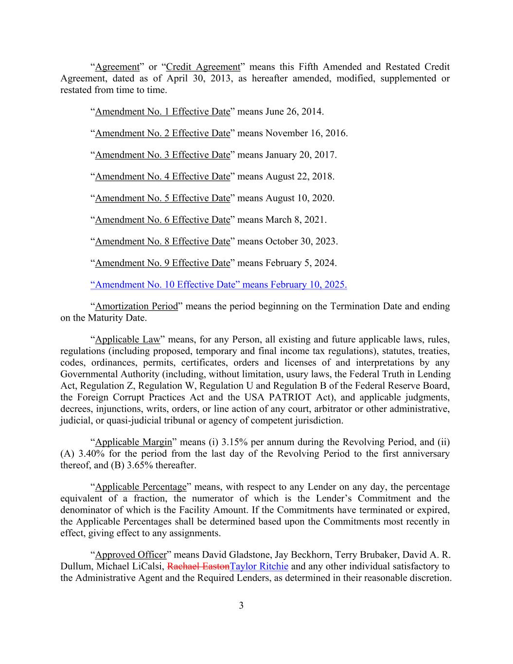 “协议”或“信贷协议”指本第五份经修订及重述的信贷协议,日期为2013年4月30日,以下不时修订、修改、补充或重述。“第1号修正案生效日期”指2014年6月26日。“第2号修正案生效日期”指2016年11月16日。“第3号修正案生效日期”指2017年1月20日。“第4号修正案生效日期”指2018年8月22日。“第5号修正案生效日期”指2020年8月10日。“第6号修正案生效日期”指2021年3月8日。“第8号修正案生效日期”指2023年10月30日。“第9号修正案生效日期”指2024年2月5日。“第10号修正案生效日期”指2025年2月10日。“摊销期”是指自终止日起至到期日止的期间。“适用法律”是指,对任何人而言,任何政府当局的所有现有和未来适用法律、规则、条例(包括拟议的、临时的和最终的所得税条例)、法规、条约、守则、条例、许可证、证书、命令和许可以及解释(包括但不限于高利贷法、联邦贷款真相法、Z条例、W条例、联邦储备委员会的U条例和B条例、《反海外腐败法》和《美国爱国者法》),以及任何法院、仲裁员或其他行政、司法或准司法法庭或有管辖权的机构的适用判决、法令、禁令、令状、命令或直线行动。“适用保证金”指(i)循环期内的年利率为3.15%,(ii)(a)循环期最后一天至其一周年期间的年利率为3.40%,其后为(b)3.65%。“适用百分比”是指,就任何一天的任何贷款人而言,相当于一个零头的百分比,其分子是贷款人的承诺,其分母是融资金额。如果承诺已经终止或到期,则应根据最近有效的承诺确定适用的百分比,从而使任何转让生效。“经批准的官员”是指由行政代理人和规定贷款人满意的任何其他个人,由他们合理酌情决定权确定的David Gladstone、Jay Beckhorn、Terry L. Brubaker、TERM2、David A. R. Dullum、Michael LiCalsi、Rachael EastonTaylor Ritchie。3