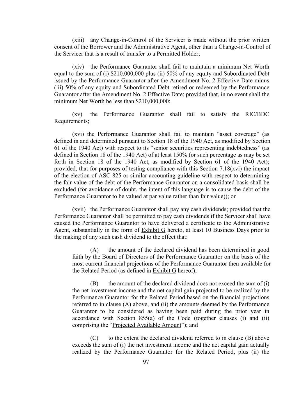 (xiii)服务人的任何控制权变更是在未经借款人和行政代理人事先书面同意的情况下作出的,因转让给许可持有人而导致的服务商控制权变更除外;(xiv)履约担保人不得保持最低净值等于(i)210,000,000美元加上(ii)履约担保人在第2号修订生效日期后发行的任何股权和次级债务的50%减去(iii)履约担保人在第2号修订生效日期后退休或赎回的任何股权和次级债务的50%;但,在任何情况下,最低净值均不得低于210,000,000美元;(xv)履约担保人不得满足RIC/BDC要求;(xvi)履约担保人不得就其“代表债务的优先证券”(定义见1940年法案第18条,经1940年法案第61条修改)保持至少150%(或1940年法案第18条可能规定的百分比)的“资产覆盖率”(定义见1940年法案第18条并根据该条确定,经1940年法案第61条修改);但为测试是否符合本第7.18(xvi)条的规定,应排除就确定履约担保人在合并基础上的债务的公允价值而选择ASC 825或类似会计准则的影响(为免生疑问,这种语言的意图是导致履约担保人的债务按面值估值,而不是按公允价值估值));或(xvii)履约担保人应支付任何现金红利;但如果履约担保人应已导致履约担保人已将证书交付给行政代理人,且基本上以本协议的附件 G形式交付,则应允许履约担保人支付现金红利,在进行任何该等现金股息前至少10个营业日,其大意为:(a)已宣布的股息金额已由履约保证人的董事会根据履约保证人当时可获得的相关期间(定义见本协议的附件 g)的最当前财务预测善意地确定;(b)已宣布的股息金额不超过(i)净投资收益之和及履约保证人根据上文(a)条所指的财务预测预计于相关期间实现的资本收益净额,(ii)履约保证人根据《守则》第855(a)条视为已于上一年度支付的款项(连同第(i)及(ii)条,包括“预计可用金额”);及(c)以上(b)条所指的宣派股息超过(i)相关期间履约保证人实际实现的投资收益净额及资本收益净额之和,加上(ii)97