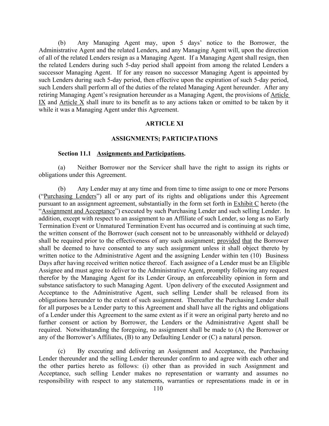 (b)任何管理代理人可在向借款人发出5天通知后,行政代理人及有关贷款人,而任何管理代理人将在所有有关贷款人的指示下辞去管理代理人的职务。管理代理人应当离职的,在该5天期限内的关联出借人应当从关联出借人中指定继任管理代理人。如因任何原因,该等贷款人在该5天期限内未指定继任管理代理人,则自该5天期限届满时生效,该等贷款人应履行本协议项下相关管理代理人的所有职责。任何退任管理代理人在本协议项下辞去管理代理人职务后,其在本协议项下担任管理代理人期间采取或不采取的任何行动,应符合第九条和第十条的规定,对其有利。第一条XI任务;参与第11.1节任务和参与。(a)借款人和服务人均无权转让其在本协议下的权利或义务。(b)任何贷款人可在任何时间及不时根据转让协议将其在本协议下的全部或任何部分权利及义务转让予一名或多于一名人士(“采购贷款人”),其形式大致上由该采购贷款人及该销售贷款人签立的本协议所载的附件 C(“转让及接受”)。此外,除向该贷款人的附属公司作出的转让外,只要没有发生提前终止事件或未成熟的终止事件,且此时仍在继续,在任何该等转让生效前,须取得借款人的书面同意(该同意不得被无理拒绝或延迟);但借款人须当作已同意任何该等转让,除非其在收到书面通知后十(10)个营业日内以书面通知行政代理人及转让贷款人的方式反对。贷款人的每一受让人必须是合格的受让人,并且必须同意在管理代理人为其贷款人集团提出任何要求后立即向行政代理人交付一份形式和实质上令该管理代理人满意的可执行性意见。在将已执行的转让和接受交付给行政代理人时,该出售贷款人应在该转让的范围内解除其在本协议项下的义务。此后,采购贷款人就所有目的而言均应为本协议的贷款方,并应享有贷款人在本协议下的所有权利和义务,其程度与其为本协议的原始当事人相同,且无需借款人、贷款人或行政代理人的进一步同意或行动。尽管有上述规定,不得向(a)借款人或借款人的任何附属公司、(b)任何违约贷款人或(c)自然人作出转让。(c)通过执行和交付转让和接受,根据该转让和接受的采购贷款人和根据该转让和接受的销售贷款人相互确认并同意如下:(i)除该转让和接受中规定的情况外,该销售贷款人不作出任何陈述或保证,也不对在110中或在110中作出的任何陈述、保证或陈述承担任何责任