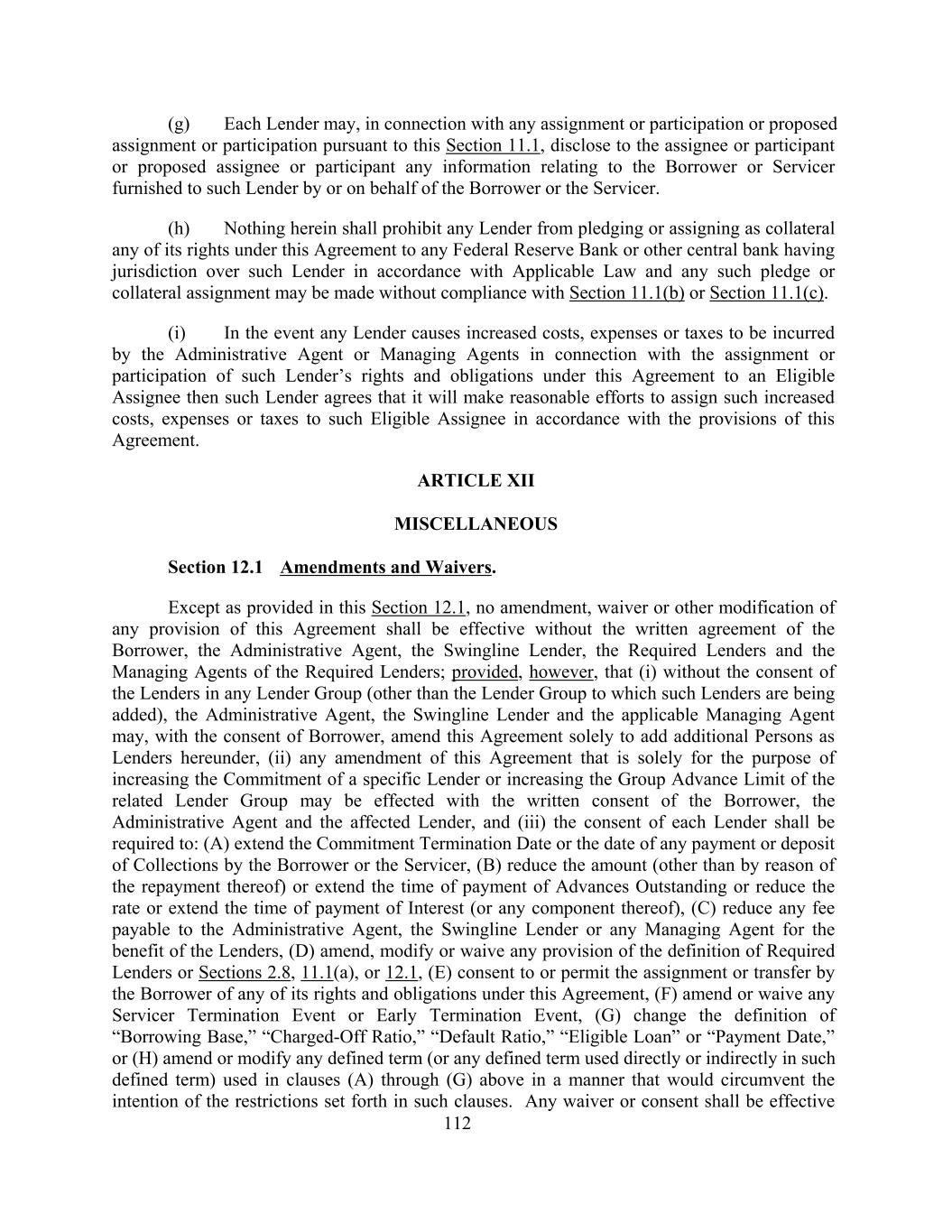 (g)每一贷款人可就依据本条第11.1条进行的任何转让或参与或提议的转让或参与,向受让人或参与人或提议的受让人或参与人披露由借款人或服务人或其代表向该贷款人或服务人提供的与借款人或服务人有关的任何信息。(h)本条款不得禁止任何贷款人将其在本协议下的任何权利作为抵押品质押或转让给根据适用法律对该贷款人具有管辖权的任何联邦储备银行或其他中央银行,任何此类质押或抵押品转让均可在不遵守第11.1(b)节或第11.1(c)节的情况下进行。(i)如任何贷款人导致行政代理人或管理代理人因将该贷款人在本协议下的权利和义务转让或参与转让给合格受让人而招致增加的成本、费用或税款,则该贷款人同意,其将作出合理努力,按照本协议的规定将此种增加的成本、费用或税款转让给该合格受让人。第十二条杂项第12.1节的修正和放弃。除本条第12.1款另有规定外,未经借款人、行政代理人、Swingline贷款人、规定贷款人及规定贷款人的管理代理人的书面同意,对本协议任何条款的任何修改、放弃或其他修改均不具有效力;但(i)未经任何贷款人集团中的贷款人同意(该等贷款人正被加入的贷款人集团除外),行政代理人、Swingline贷款人及适用的管理代理人可经借款人同意,修改本协议仅是为了增加额外的人作为本协议项下的放款人,(ii)本协议的任何修改,如果仅仅是为了增加特定放款人的承诺或增加相关放款人集团的集团垫付限额,则可在借款人、行政代理人和受影响的放款人书面同意的情况下进行,并且(iii)应要求每个放款人的同意:(a)延长承诺终止日期或借款人或服务人支付或存入任何收款的日期,(b)减少未偿还垫款的款额(因偿还而除外)或延长垫款的支付时间或降低利率或延长利息(或其任何组成部分)的支付时间,(c)为贷款人的利益减少应付给行政代理人、Swingline贷款人或任何管理代理人的任何费用,(d)修订、修改或放弃规定贷款人定义的任何条文或第2.8、11.1(a)或12.1条,(e)同意或允许借款人转让或转让其在本协议下的任何权利和义务,(f)修改或放弃任何服务商终止事件或提前终止事件,(g)更改“借款基数”、“冲销比率”、“违约比率”、“合格贷款”或“付款日期”的定义,或(h)修改或修改上述(a)至(g)条中使用的任何定义术语(或在该定义术语中直接或间接使用的任何定义术语),其方式将规避该等条款所载限制的意图。任何放弃或同意须具效力112
