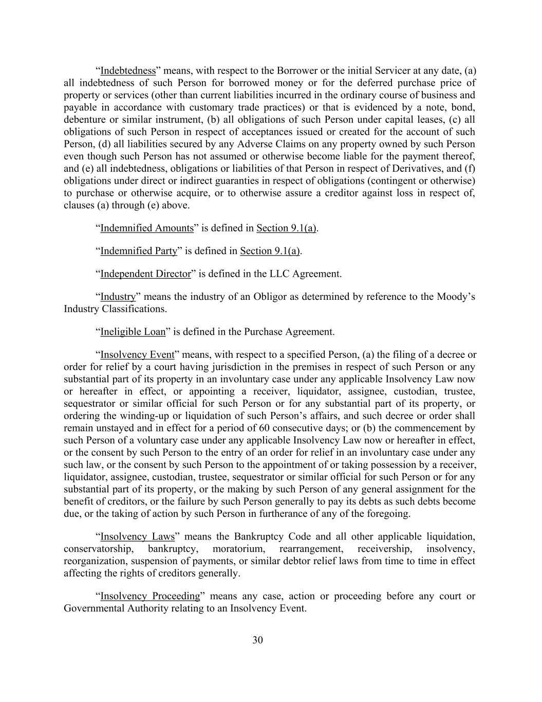 “负债”是指,就借款人或初始服务商而言,在任何日期,(a)该人因借款或财产或服务的递延购买价格(在正常业务过程中发生并根据习惯贸易惯例应付的流动负债除外)或由票据、债券、债权证或类似票据证明的所有债务,(b)该人在资本租赁下的所有义务,(c)该人就为该人的账户发行或创建的接受而承担的所有义务,(d)由该人所拥有的任何财产的任何不利债权所担保的所有法律责任,即使该人并未承担或以其他方式成为偿付该财产的法律责任,及(e)该人在衍生工具方面的所有债务、义务或法律责任,及(f)根据直接或间接担保就购买或以其他方式取得或以其他方式向债权人保证不受上述(a)至(e)条所涉损失的义务而承担的义务。第9.1节(a)中对“赔偿金额”进行了定义。第9.1节(a)中对“受偿方”进行了定义。LLC协议中对“独立董事”进行了定义。“行业”是指参照穆迪行业分类确定的债务人的行业。购买协议中定义了“不合格贷款”。“破产事件”是指,就某特定人士而言,(a)根据现行或以后生效的任何适用的破产法,在非自愿案件中,由在处所内具有管辖权的法院就该人士或其财产的任何实质部分提交法令或命令要求救济,或为该人士或其财产的任何实质部分指定接管人、清盘人、受让人、托管人、受托人、扣押人或类似官员,或命令对该人士的事务进行清盘或清算,而该等判令或命令须在连续60天期间内保持不受中止及有效;或(b)该等人根据现时或以后生效的任何适用的破产法启动自愿案件,或该等人同意根据任何该等法律在非自愿案件中输入救济令,或该等人同意接管人、清盘人、受让人、保管人、受托人、扣押人或类似官员为该等人或其财产的任何实质部分指定或占有,或该等人为债权人的利益作出任何一般转让,或该等人一般未能在该等债务到期时偿付其债务,或该等人为促进上述任何一项而采取行动。“破产法”是指《破产法》和所有其他适用的清算、监管、破产、暂停、重新安排、接管、破产、重组、暂停付款,或不时生效的、对债权人权利产生普遍影响的类似债务人救济法律。“破产程序”是指任何法院或政府当局就破产事件提起的任何案件、诉讼或程序。30