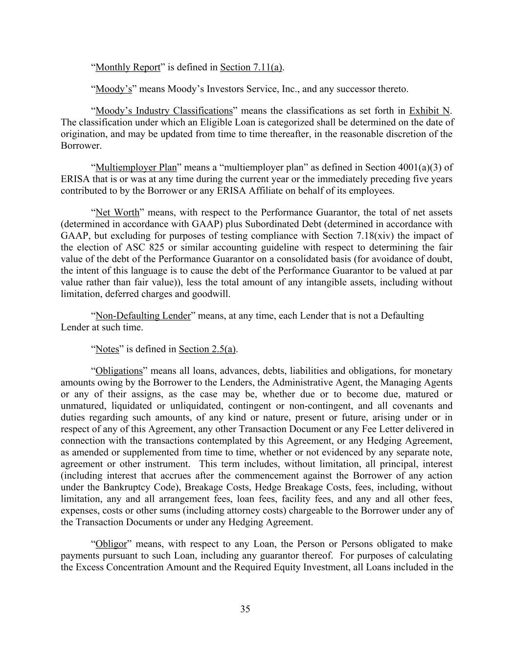 “月度报告”在第7.11(a)节中定义。“穆迪”是指穆迪投资者服务公司及其任何继任者。“穆迪行业分类”是指附件 N中所述的分类。合格贷款所依据的分类应在发起日期确定,并可在此后由借款人合理酌情决定不时更新。“多雇主计划”是指ERISA第4001(a)(3)节中定义的“多雇主计划”,该计划是或曾经在本年度或紧接前五年的任何时间由借款人或任何ERISA关联公司代表其雇员提供。“净值”是指,就履约担保人而言,净资产(根据公认会计原则确定)加上次级债务(根据公认会计原则确定,但为测试是否符合第7.18(xiv)节的规定,不包括选择ASC 825或类似会计准则对确定履约担保人在合并基础上的债务公允价值的影响(为免生疑问,这种语言的意图是使履约担保人的债务按面值而不是公允价值估值),减去任何无形资产的总额,包括但不限于递延费用和商誉。“非违约贷款人”是指,在任何时候,每个不是违约贷款人的贷款人在这种时候。“注释”在第2.5(a)节中定义。“义务”是指借款人欠放款人、行政代理人、管理代理人或其任何受让人(视情况而定)的所有贷款、垫款、债务、负债和义务,无论是否到期或即将到期、到期或未到期、已清算或未清算、或有或非或有,以及与根据本协议、任何其他交易文件或就本协议所设想的交易交付的任何费用函或任何对冲协议产生的任何种类或性质的此类金额有关的所有契诺和义务,经不时修订或补充,不论是否有任何单独的票据、协议或其他文书证明。该条款包括但不限于所有本金、利息(包括根据《破产法》对借款人提起的任何诉讼开始后产生的利息)、破产成本、对冲破产成本、费用,包括但不限于任何和所有安排费用、贷款费用、设施费用,以及根据任何交易文件或任何对冲协议应向借款人收取的任何和所有其他费用、开支、成本或其他款项(包括律师费用)。“债务人”是指,就任何贷款而言,根据此类贷款有义务付款的个人或个人,包括其任何担保人。为计算超额集中金额和所需的股权投资,35项中包含的所有贷款