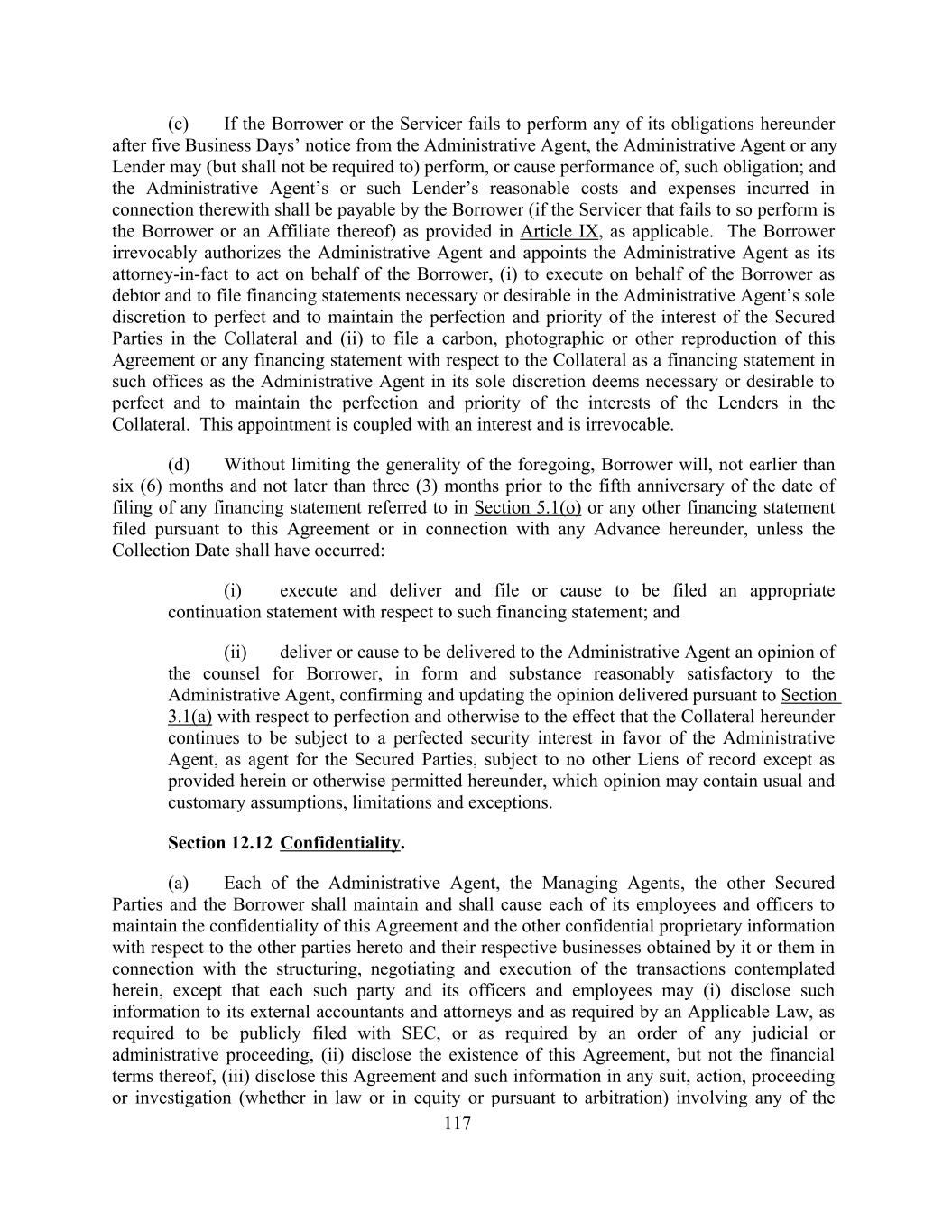 (c)如借款人或服务人在行政代理人发出五个营业日的通知后仍未履行其在本协议项下的任何义务,则行政代理人或任何贷款人可(但不得被要求)履行或促使履行该义务;而行政代理人或该贷款人与此有关而招致的合理费用及开支,须由借款人(如未能如此履行的服务人是借款人或其附属公司)按适用的第九条规定支付。借款人不可撤销地授权行政代理人并指定行政代理人作为其事实上的代理人代表借款人行事,(i)作为债务人代表借款人执行并提交必要或可取的融资报表,由行政代理人全权酌情决定,以完善并维护担保方在担保物上的利益的完善性和优先权,以及(ii)提交碳,将本协议或与抵押品有关的任何融资报表的相片或其他复制品作为融资报表在行政代理人全权酌情认为必要或可取的办事处进行完善并保持出借人在抵押品上的利益的完善性和优先权。这项任命附带利益,不可撤销。(d)在不限制前述一般性的情况下,借款人将不早于第5.1(o)节所提述的任何融资报表或根据本协议提交的任何其他融资报表或与本协议项下的任何预付款有关的任何融资报表提交日期的第五周年之前的六(6)个月且不迟于三(3)个月,除非收款日期应已发生:(i)就该融资报表签立和交付并归档或安排归档适当的延续报表;(ii)向行政代理人交付或安排交付借款人大律师的意见,其形式和实质合理地令行政代理人满意,确认和更新根据第3.1(a)节就完善性或其他方面所交付的意见,大意是本协议项下的担保物继续受制于有利于行政代理人的完善的担保权益,作为有担保方的代理人,除本协议规定或本协议另有许可外,不受其他记录留置权的约束,该意见可能包含通常和习惯的假设、限制和例外。第12.12节保密。(a)每一行政代理人、管理代理人、其他有担保方和借款人均应保持并应促使其每一雇员和高级管理人员保持本协议的机密性,以及与本协议其他当事方及其各自在本协议所设想的交易的结构、谈判和执行中获得的业务有关的其他机密专有信息,但每一此种当事方及其高级管理人员和雇员可(i)向其外部会计师和律师披露此类信息并根据适用法律的要求,根据向SEC公开提交的要求,或根据任何司法或行政程序的命令的要求,(ii)披露本协议的存在,但不披露其财务条款,(iii)在涉及117中任何一项的任何诉讼、诉讼、程序或调查(无论是在法律或股权或根据仲裁)中披露本协议和此类信息