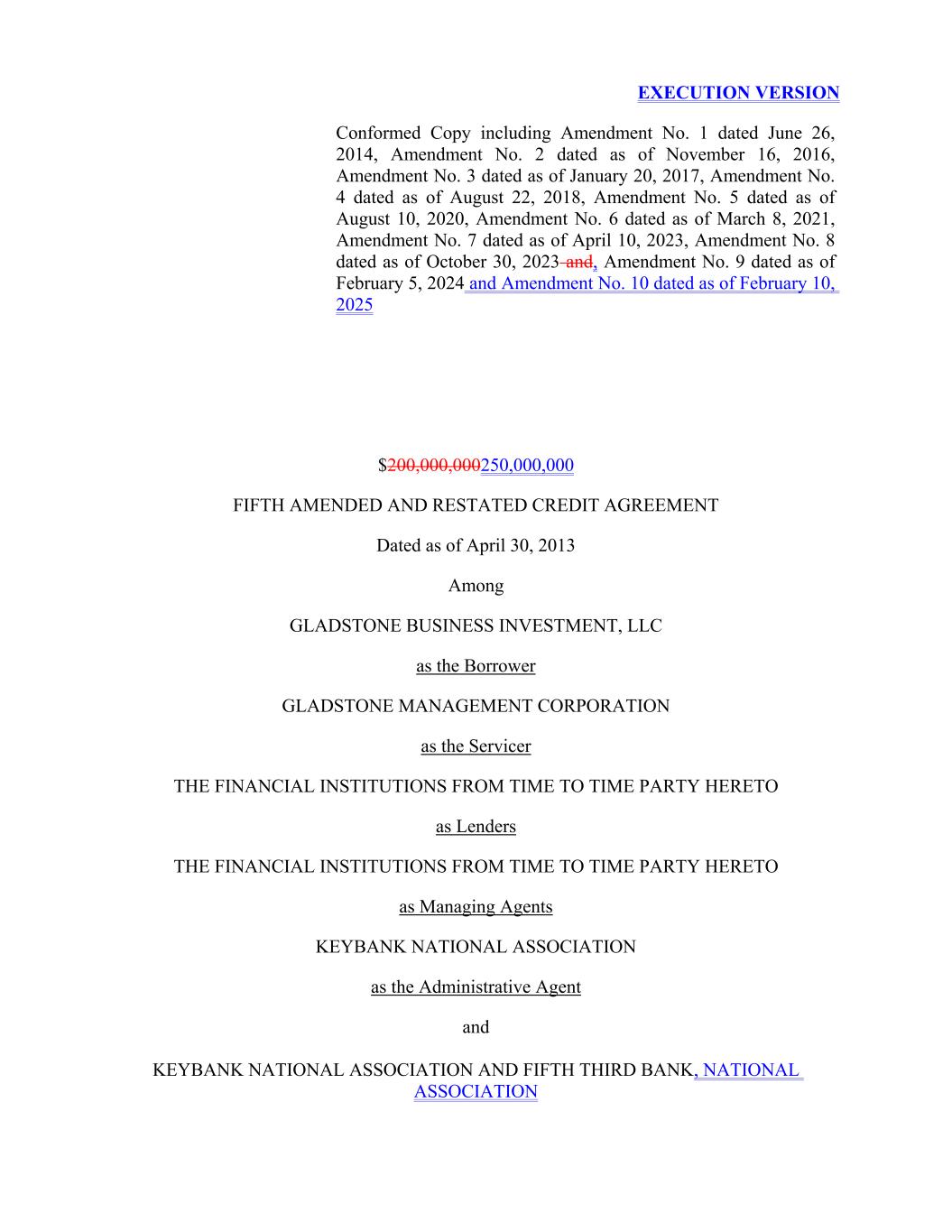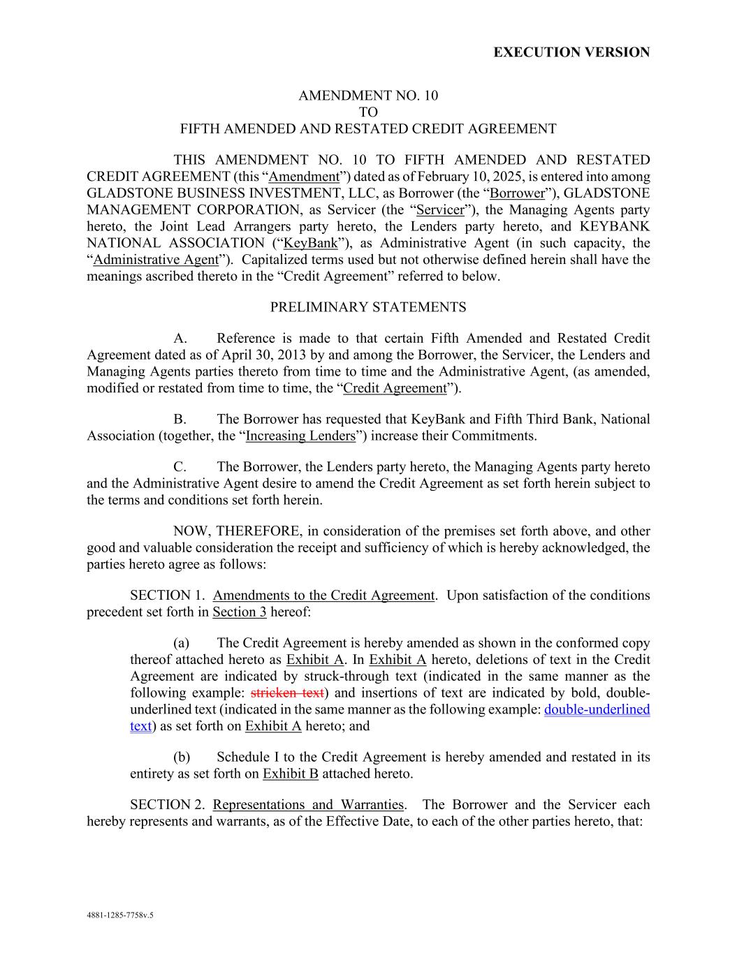执行版本第10至5号修订并重述的信贷协议本第10至5号修订并重述的信贷协议(本“修订”)日期为2025年2月10日,由Gladstone BusinessInvestment,LLC作为借款人(“借款人”)、Gladstone Management Corporation作为服务商(“服务商”)、管理代理方、联合牵头安排方、贷款方、KEYBANK国家协会之间订立此处使用但未另行定义的大写术语应具有下文提及的“信用协议”中赋予的含义。A.初步声明兹提述借款人、服务人、贷款人及不时与之订立的管理代理各方及行政代理人于2013年4月30日订立的若干第五份经修订及重述的信贷协议(经不时修订、修订或重述,“信贷协议”)。B.借款人已要求KeyBank和五三银行银行、National Association(统称“增加贷款人”)增加其承诺。C.借款人、本协议的贷款方、本协议的管理代理方和行政代理人希望根据本协议规定的条款和条件对本协议规定的信贷协议进行修订。现据此,考虑到上述前提条件,以及其他收到并充分性确认的良好、有价值的对价,双方约定如下:第一节。信贷协议的修订。在满足本协议第3节中规定的先决条件后:(a)兹对信用协议进行修订,如作为附件 A随附的一致副本所示,在本协议的附件 A中,信用协议中的文字删除部分以穿透文本表示(以与以下示例相同的方式表示:删除文本),插入的文字以粗体表示,双下划线文本(以与以下示例相同的方式表示:双下划线文本),载于本协议的附件 A;及(b)信贷协议附表I现予以修订,并按本协议所附的附件 B所载的全文重列。第2节。申述及保证。借款人和服务商在此各自声明并保证,自生效之日起,本协议的其他各方:4881-1285-7758v.5