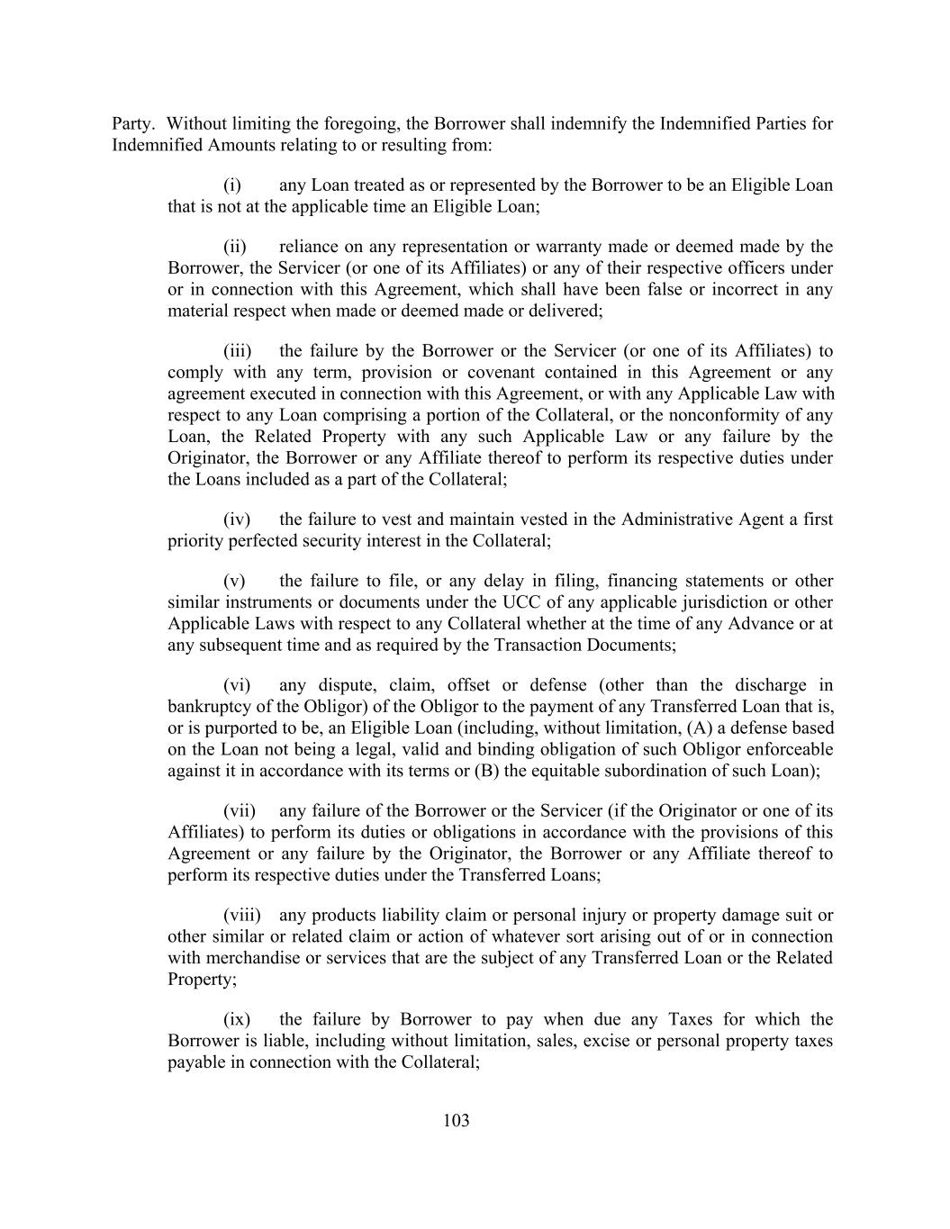 派对。在不限制前述规定的情况下,借款人应就与以下相关或由此产生的受弥偿金额向受弥偿方作出赔偿:(i)被借款人视为或代表为合资格贷款的任何贷款,但在适用时间不是合资格贷款;(ii)依赖借款人、服务人(或其关联公司之一)或其各自的任何高级职员根据本协议作出或视为作出的任何陈述或保证,在作出或当作作出或交付时,在任何重要方面均属虚假或不正确;(iii)借款人或服务商(或其关联公司之一)未能遵守本协议所载的任何条款、规定或契诺或与本协议有关而签立的任何协议,或与构成抵押品的一部分的任何贷款有关的任何适用法律,或任何贷款、相关财产与任何该等适用法律不一致或发起人的任何失败,借款人或其任何关联机构履行其在作为抵押品一部分的贷款下各自的职责;(iv)未能归属和维持归属于行政代理人的第一优先权完善了抵押品的担保权益;(v)未能根据任何适用司法管辖区的UCC或其他适用法律就任何抵押品提交融资报表或其他类似文书或文件,无论是在任何垫款时还是在随后的任何时间,以及按照交易文件的要求;(vi)任何争议、索赔、抵销或抗辩(债务人破产时解除债务除外)债务人支付的任何转让贷款,即属于或看来是合资格贷款(包括但不限于(a)基于贷款不合法的抗辩,该等债务人根据其条款可对其强制执行的有效及具约束力的义务或(b)该等贷款的衡平法从属地位);(vii)借款人或服务人(如发起人或其关联公司之一)未能按照本协议的规定履行其职责或义务或发起人未能履行其任何义务,借款人或其任何关联机构履行其在转让贷款项下的各自职责;(viii)任何产品责任索赔或人身伤害或财产损失诉讼或其他类似或相关的任何类型的索赔或诉讼,这些索赔或诉讼产生于或与任何转让贷款或相关财产标的的商品或服务有关;(ix)借款人未能在到期时支付借款人应承担的任何税款,包括但不限于与抵押品有关的销售、消费税或个人财产税;103