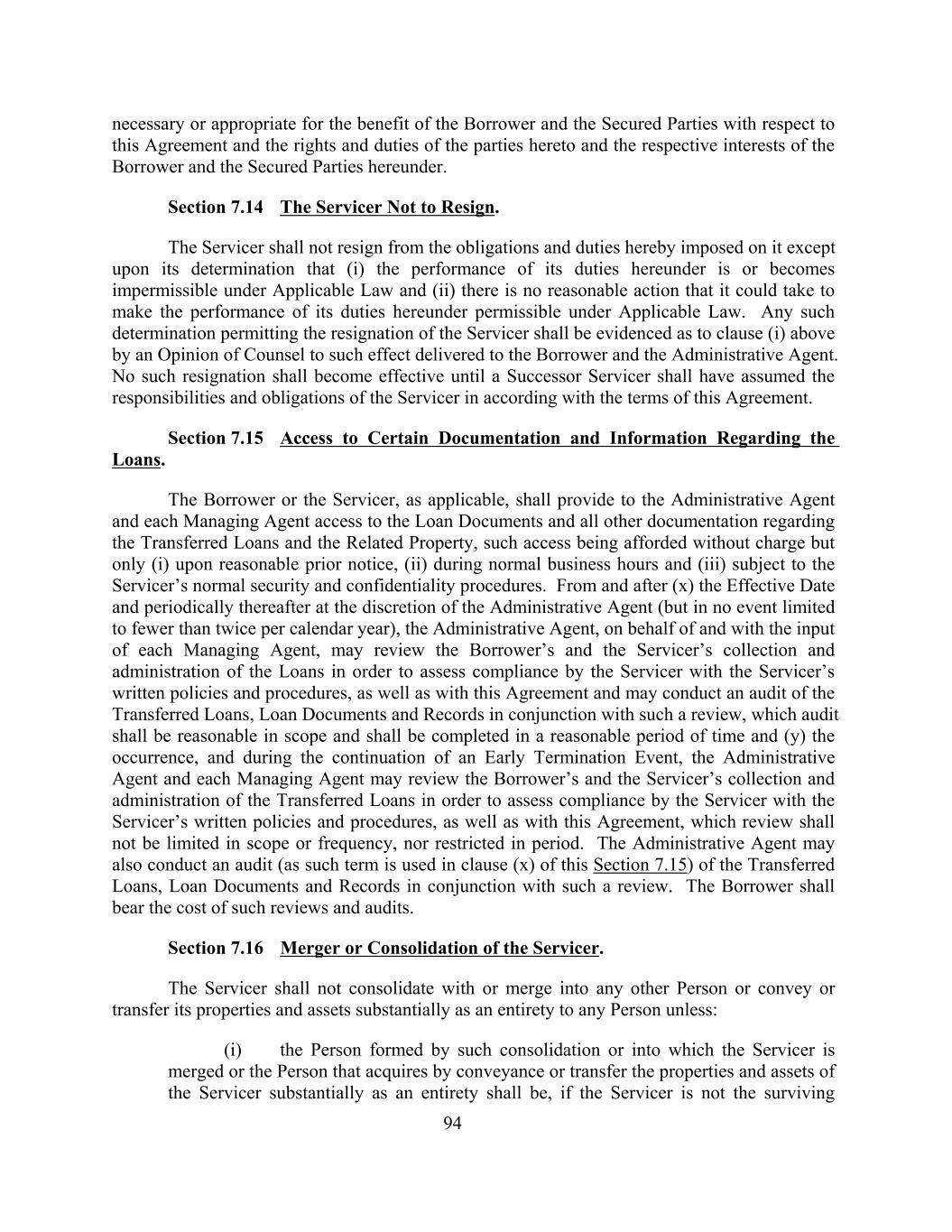 为借款人和担保方在本协议方面的利益以及本协议各方的权利和义务以及借款人和担保方在本协议项下各自的利益所必需或适当的。第7.14节服务人不辞职。服务人不得辞去在此对其施加的义务和职责,除非其确定(i)根据适用法律履行其在本协议项下的职责是或成为不允许的,以及(ii)其无法采取合理行动以使根据适用法律履行其在本协议项下的职责是允许的。任何允许服务人辞职的该等裁定,须以律师向借款人及行政代理人交付的大意如此的意见作为上述第(i)款的证据。在继任服务人根据本协议条款承担服务人的责任和义务之前,此种辞职不得生效。第7.15节查阅有关贷款的某些文件和信息。借款人或服务人(如适用)应向行政代理人和每个管理代理人提供查阅贷款文件和有关转让的贷款及相关财产的所有其他文件的权限,这种权限是免费提供的,但仅限于(i)在合理的事先通知下,(ii)在正常营业时间内,以及(iii)在服务人的正常安全和保密程序的前提下。自生效日期(x)起及之后,并在其后由行政代理人酌情决定(但在任何情况下均不限于每个历年少于两次),行政代理人可代表各管理代理人并根据其意见,审查借款人和服务商对贷款的收取和管理,以评估服务商遵守服务商的书面政策和程序以及本协议的情况,并可结合此类审查对转让的贷款、贷款文件和记录进行审计,该审计应在范围上合理,并应在合理的时间内和(y)发生时完成,并且在提前终止事件持续期间,行政代理人和各管理代理人可审查借款人和服务商对转让贷款的收取和管理情况,以评估服务商遵守服务商的书面政策和程序以及本协议的情况,审查不受范围或频率限制,也不受期限限制。行政代理人还可以结合此类审查对转让的贷款、贷款文件和记录进行审计(本条第7.15条(x)款中使用了该术语)。借款人应承担此类审查和审计的费用。第7.16节服务商的合并或合并。服务商不得与任何其他人合并或合并为任何其他人,或将其财产和资产实质上作为一个整体转让或转让给任何人,除非:(i)由该合并所组成的人或该服务商被合并为其中的人或以转易方式取得或实质上作为一个整体转让该服务商的财产和资产的人,如该服务商不是尚存的94