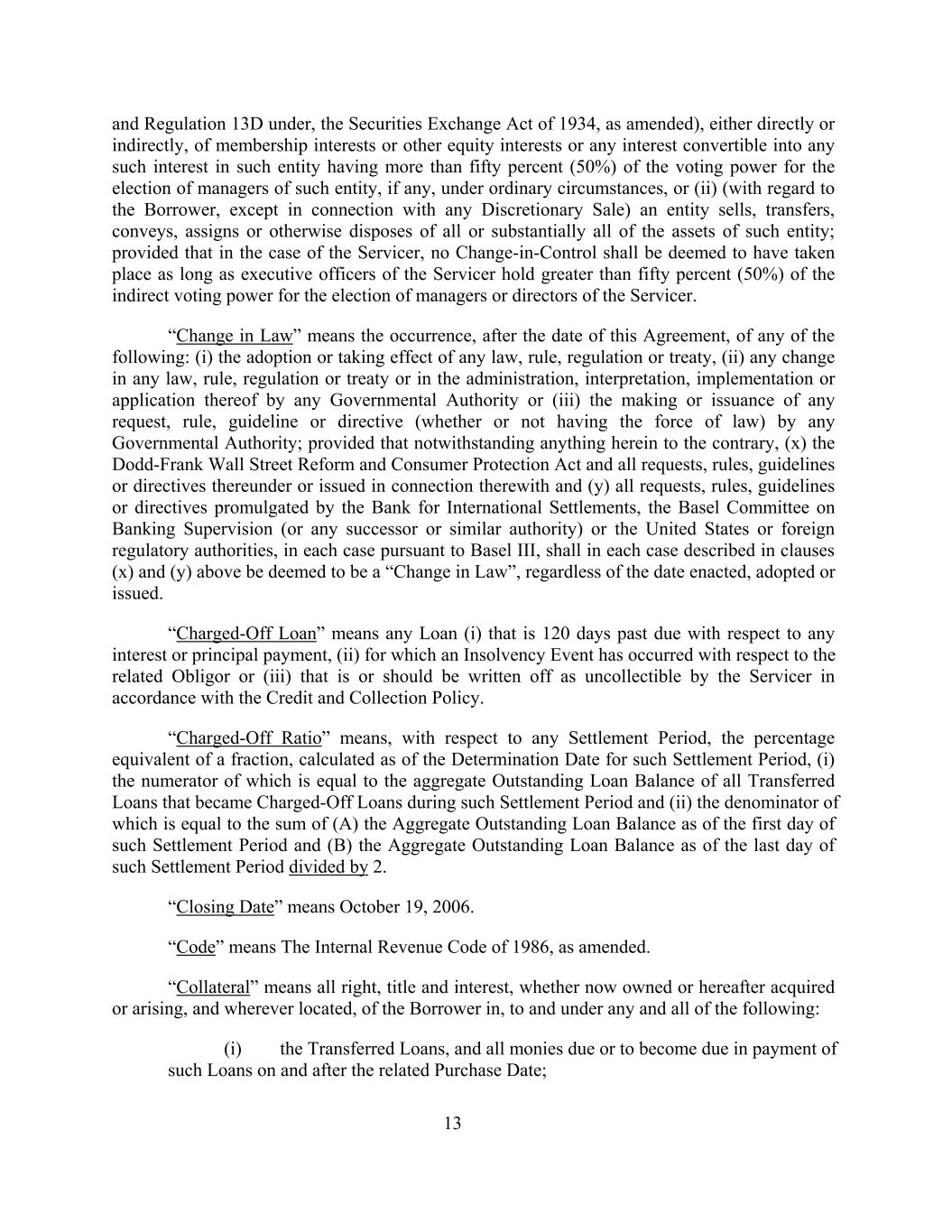 根据《1934年证券交易法》(经修订)的第13D条,直接或间接地将会员权益或其他股权权益或任何可转换为此类实体的任何此类权益的权益,在一般情况下有超过50%(50%)的投票权选举此类实体的经理人(如果有的话),或(ii)(就借款人而言,与任何全权出售有关的除外)一实体出售、转让、转让或以其他方式处置该实体的全部或几乎全部资产;但就服务商而言,只要服务商的执行官在选举服务商的经理或董事方面拥有超过百分之五十(50%)的间接投票权,就不应被视为已发生控制权变更。“法律变更”是指在本协定日期之后发生以下任何情况:(i)任何法律、规则、条例或条约的通过或生效,(ii)任何法律、规则、条例或条约的任何变更或任何政府当局对其行政、解释、实施或适用的任何变更,或(iii)任何政府当局提出或发出任何请求、规则、准则或指令(无论是否具有法律效力);条件是,尽管本协定有任何相反的规定,(x)《多德-弗兰克华尔街改革和消费者保护法》及其下或与之相关发布的所有请求、规则、指南或指令,以及(y)国际清算银行、巴塞尔银行监管委员会(或任何后续或类似机构)或美国或外国监管机构颁布的所有请求、规则、指南或指令,在每种情况下均应根据巴塞尔协议III,在上述(x)和(y)条所述的每种情况下均应被视为“法律变更”,无论颁布、通过或发布的日期如何。“已注销贷款”是指任何贷款(i)就任何利息或本金支付逾期120天,(ii)已就相关债务人发生破产事件,或(iii)已或应根据信贷和催收政策被注销为无法由服务商收回。“核销比例”是指,就任何结算期而言,截至该结算期的确定日期计算的相当于零头的百分比,(i)其分子等于在该结算期内成为核销贷款的所有转让贷款的未偿还贷款余额总额,以及(ii)其分母等于(a)截至该结算期第一天的未偿还贷款余额总额和(b)截至该结算期最后一天的未偿还贷款余额总额除以2的总和。“截止日”是指2006年10月19日。“法典”是指经修订的1986年《国内税收法典》。“抵押品”是指借款人在以下任何和所有情况下、在以下情况下以及在以下情况下获得或产生的所有权利、所有权和利息,无论是现在拥有的还是以后产生的,以及位于何处:(i)转让的贷款,以及在相关购买日期及之后支付此类贷款的所有到期或将要到期的款项;13