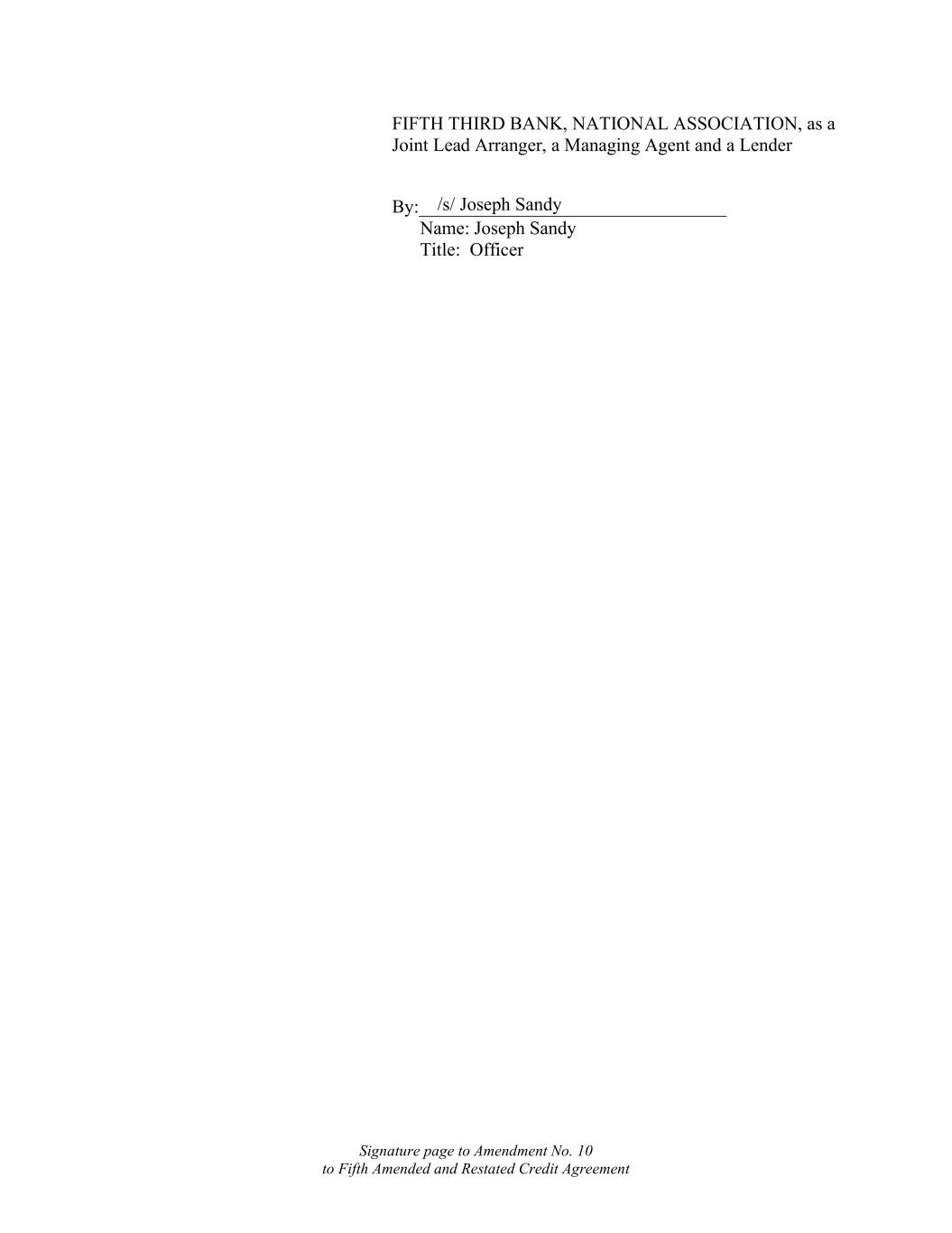 第10号至第5号修正案签署页经修订和重述的信贷协议/s/Joseph Sandy Fifth Third Bank,National Association,作为联席牵头安排人、管理代理人和贷款人:______________________________姓名:Joseph Sandy职务:干事