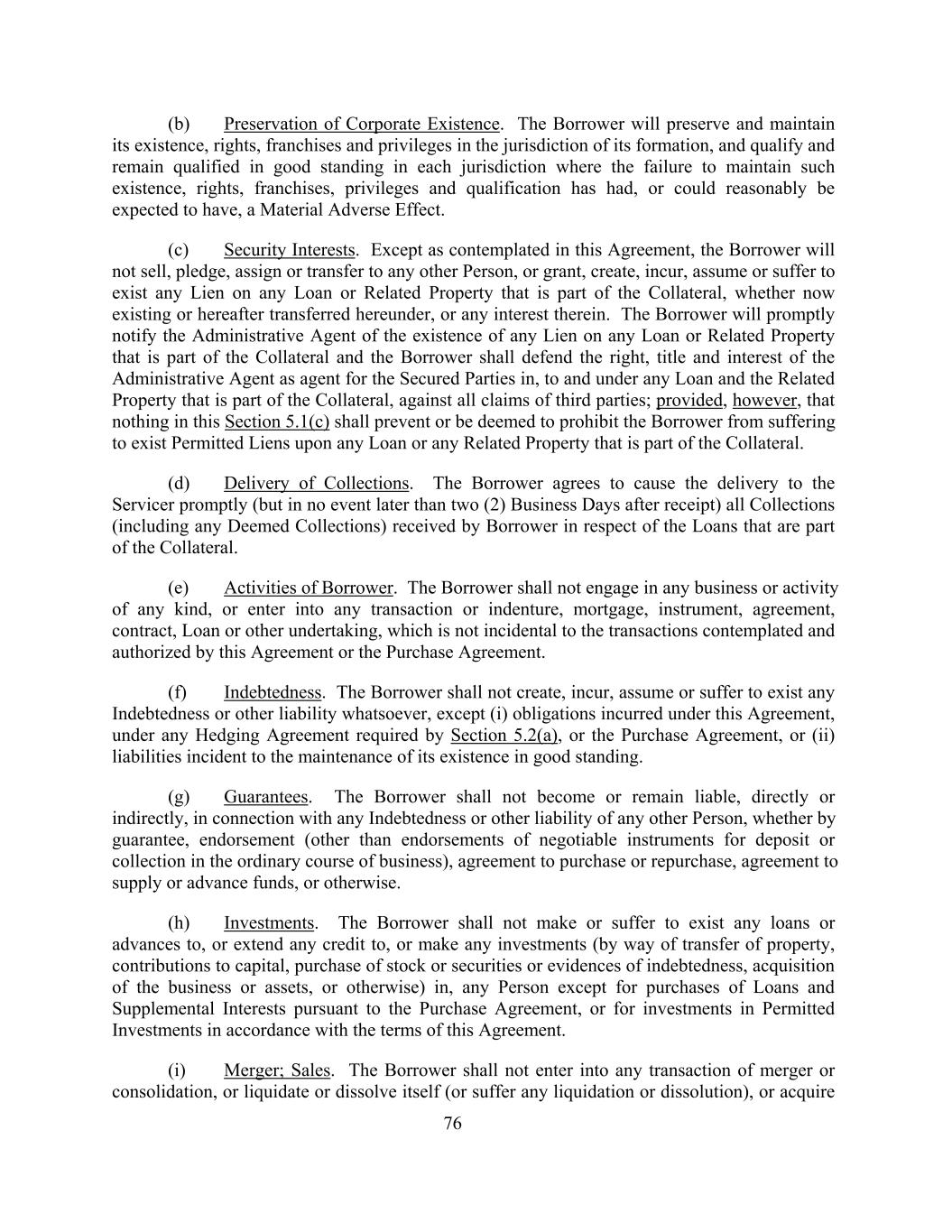 (b)维护公司存在。借款人将保留和维持其在其成立的司法管辖区内的存在、权利、专营权和特权,并在未能维持此类存在、权利、专营权、特权和资格已经或可以合理预期会产生重大不利影响的每个司法管辖区内具有良好信誉的资格和保持资格。(c)担保权益。除本协议所设想的情况外,借款人将不会出售、质押、转让或转让给任何其他人,或授予、创建、招致、承担或容忍对作为抵押品一部分的任何贷款或相关财产的任何留置权,无论是现在存在的还是以后根据本协议转让的,或其中的任何权益。借款人将作为担保物一部分的任何贷款或相关财产存在任何留置权的情况及时通知行政代理人,借款人应针对第三方的所有债权,捍卫作为担保方代理人的行政代理人在任何贷款中、在任何贷款中以及在其下的权利、所有权和利益以及作为担保物一部分的相关财产;但前提是,本条第5.1(c)款的任何规定均不得阻止或当作禁止借款人对作为抵押品一部分的任何贷款或任何相关财产存在许可留置权。(d)交付藏品。借款人同意促使迅速(但在任何情况下不得迟于收到后两(2)个工作日)将借款人就作为抵押品一部分的贷款收到的所有收款(包括任何视为收款)交付给服务商。(e)借款人的活动。借款人不得从事任何业务或任何种类的活动,或订立任何交易或契约、抵押、票据、协议、合同、贷款或其他承诺,而这与本协议或采购协议所设想和授权的交易无关。(f)负债。除(i)根据本协议、根据第5.2(a)节要求的任何套期保值协议或购买协议发生的义务,或(ii)因维持其良好信誉而发生的责任外,借款人不得设定、招致、承担或承受任何债务或其他责任。(g)担保。借款人不得因任何其他人的任何债务或其他责任而直接或间接承担或继续承担责任,不论是通过担保、背书(正常经营过程中存放或托收的可转让票据背书除外)、协议购买或回购、协议供应或垫付资金或其他方式。(h)投资。除根据购买协议购买贷款和补充权益,或根据本协议条款对许可投资进行投资外,借款人不得向任何人提供或允许存在任何贷款或垫款,或向任何人提供任何信贷,或对任何人进行任何投资(通过转让财产、出资、购买股票或证券或债务证据、收购业务或资产,或其他方式)。(i)合并;销售。借款人不得进行任何合并或合并的交易,或自行清算或解散(或遭受任何清算或解散),或取得76