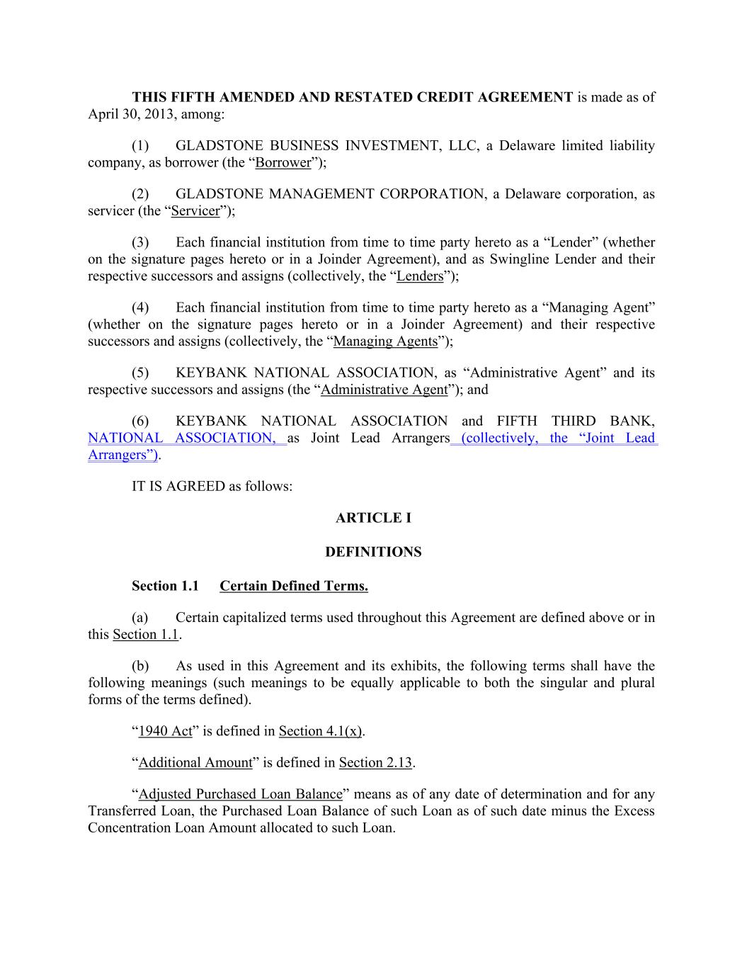 本第五份经修订和重述的信贷协议于2013年4月30日订立,其中:(1)Gladstone BusinessInvestment,LLC,一家特拉华州有限责任公司,作为借款人(“借款人”);(2)Gladstone Management CORPORATION,一家特拉华州公司,作为服务商(“服务商”);(3)每一金融机构不时作为“贷款人”(无论是在本协议的签字页上还是在共同协议中),以及作为Swingline贷款人及其各自的继任者和受让人(统称,“出借人”);(4)每一金融机构不时作为“管理代理人”(无论是在本协议的签字页上还是在联合协议中)及其各自的继任者和受让人(统称“管理代理人”);(5)KEYBANK国民协会作为“行政代理人”及其各自的继任者和受让人(“行政代理人”);(6)KEYBANK国民协会和Fifth Third BANK国民协会作为联合牵头安排人(统称“联合牵头安排人”)。议定如下:第一条定义第1.1节某些定义术语。(a)本协定通篇使用的某些大写术语在上文或本第1.1节中定义。(b)本协定及其证物中使用的下列术语应具有以下含义(这些含义应同样适用于所定义术语的单数和复数形式)。第4.1(x)节对“1940年法案”进行了定义。“额外金额”在第2.13节中定义。“调整后的已购买贷款余额”是指截至任何确定日期,对于任何已转让的贷款,截至该日期该贷款的已购买贷款余额减去分配给该贷款的超额集中贷款金额。