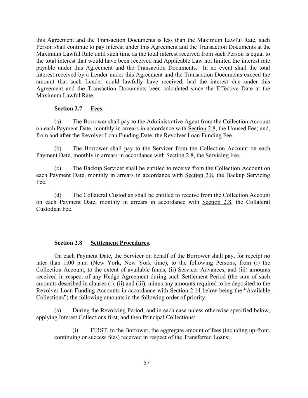 本协议和交易文件低于最高法定利率,该人应继续按最高法定利率支付本协议和交易文件项下的利息,直至从该人收到的利息总额等于如果适用法律不限制本协议和交易文件项下应支付的利率总额。在任何情况下,贷款人根据本协议和交易文件收到的总利息均不得超过该贷款人可以合法收到的金额,前提是本协议和交易文件项下到期的利息自生效之日起按最高法定利率计算。第2.7节费用。(a)借款人应在每个付款日期从收款账户向行政代理人支付未使用的费用,每月按第2.8节拖欠;以及自循环贷款供资日期起及之后的循环贷款供资费用。(b)借款人须于每个付款日期,按照第2.8节的规定,按月从收款帐户向服务人支付服务费。(c)根据第2.8节的规定,备用服务商有权在每个付款日期从收款账户每月收取备用服务费。(d)抵押品托管人有权在每个付款日期从收款账户收取抵押品托管费,按照第2.8节按月拖欠。第2.8节结算程序。在每个付款日期,代表借款人的服务商应在不迟于下午1:00(纽约、纽约时间)之前从(i)收款账户(以可用资金为限)向以下人员付款,(ii)服务商预付款,以及(iii)在该结算期内就任何对冲协议收到的金额(第(i)、(ii)和(iii)条所述的此类金额的总和,减去根据下文第2.14节要求存入循环贷款资金账户的任何金额,即“可用收款”)以下金额,按以下优先顺序排列:(a)在循环期内,除下文另有规定外,在每种情况下,先收取利息,然后收取本金:(i)首先,向借款人,就转让的贷款收取的费用总额(包括预付、持续或成功费用);57