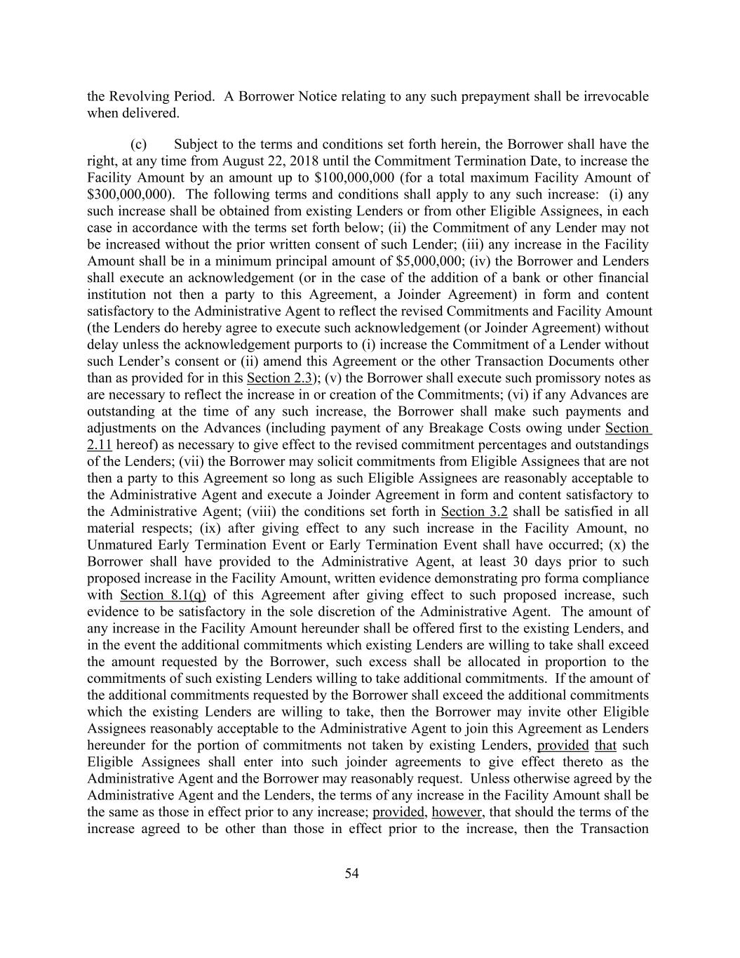 循环期。与任何此类提前还款有关的借款人通知在交付时不可撤销。(c)在符合本协议规定的条款和条件的情况下,借款人有权在2018年8月22日至承诺终止日期的任何时间将融资金额增加至多100,000,000美元(融资总额最高为300,000,000美元)。以下条款及条件适用于任何该等增加:(i)任何该等增加须向现有贷款人或其他合资格受让人取得,在每种情况下均按照下述条款;(ii)未经任何贷款人的事先书面同意,不得增加该贷款人的承诺;(iii)融资金额的任何增加,最低本金金额应为5,000,000美元;(iv)借款人和贷款人应签署确认书(或在增加当时并非本协议缔约方的银行或其他金融机构的情况下,a合并协议)的形式和内容令行政代理人满意,以反映经修订的承付款项和融资金额(贷款人在此同意毫不拖延地执行该确认(或合并协议),除非该确认旨在(i)未经贷款人同意而增加贷款人的承诺或(ii)修订本协议或除本2.3节规定以外的其他交易文件);(v)借款人应执行必要的本票,以反映承诺的增加或创设;(vi)如果在任何此类增加时有任何未偿还的预付款,借款人应对垫款(包括支付根据本协议第2.11条所欠的任何破碎费用)进行必要的付款和调整,以使贷款人的修订承诺百分比和未偿债务生效;(vii)借款人可向合格受让人征求承诺只要该等合资格受让人合理地为行政代理人所接受,并以行政代理人所满意的形式和内容签立合并协议,即不是本协议的一方;(viii)第3.2节所述条件在所有重大方面均应得到满足;(ix)在任何该等增加融资金额生效后,不得发生未到期的提前终止事件或提前终止事件;(x)借款人应已向行政代理人提供,至少在该提议增加融资金额的30天前,证明在实施该提议的增加后符合本协议第8.1节(q)的形式上的书面证据,该等证据由行政代理人全权酌情决定是否令人满意。本协议项下任何增加融资金额的金额应首先提供给现有贷款人,如果现有贷款人愿意承担的额外承诺超过借款人要求的金额,则应按愿意承担额外承诺的现有贷款人的承诺比例分配该超额部分。如果借款人要求的额外承付款项数额超过现有贷款人愿意承担的额外承付款项,则借款人可就现有贷款人未承担的部分承付款项邀请行政代理人合理接受的其他合资格受让人作为本协议项下的贷款人加入本协议,但该等合资格受让人应订立行政代理人和借款人合理要求的合并协议以使其生效。除非行政代理人和贷款人另有约定,任何增加融资额度的条款应与任何增加前有效的条款相同;但如果同意的增加条款不是增加前有效的条款,则交易54