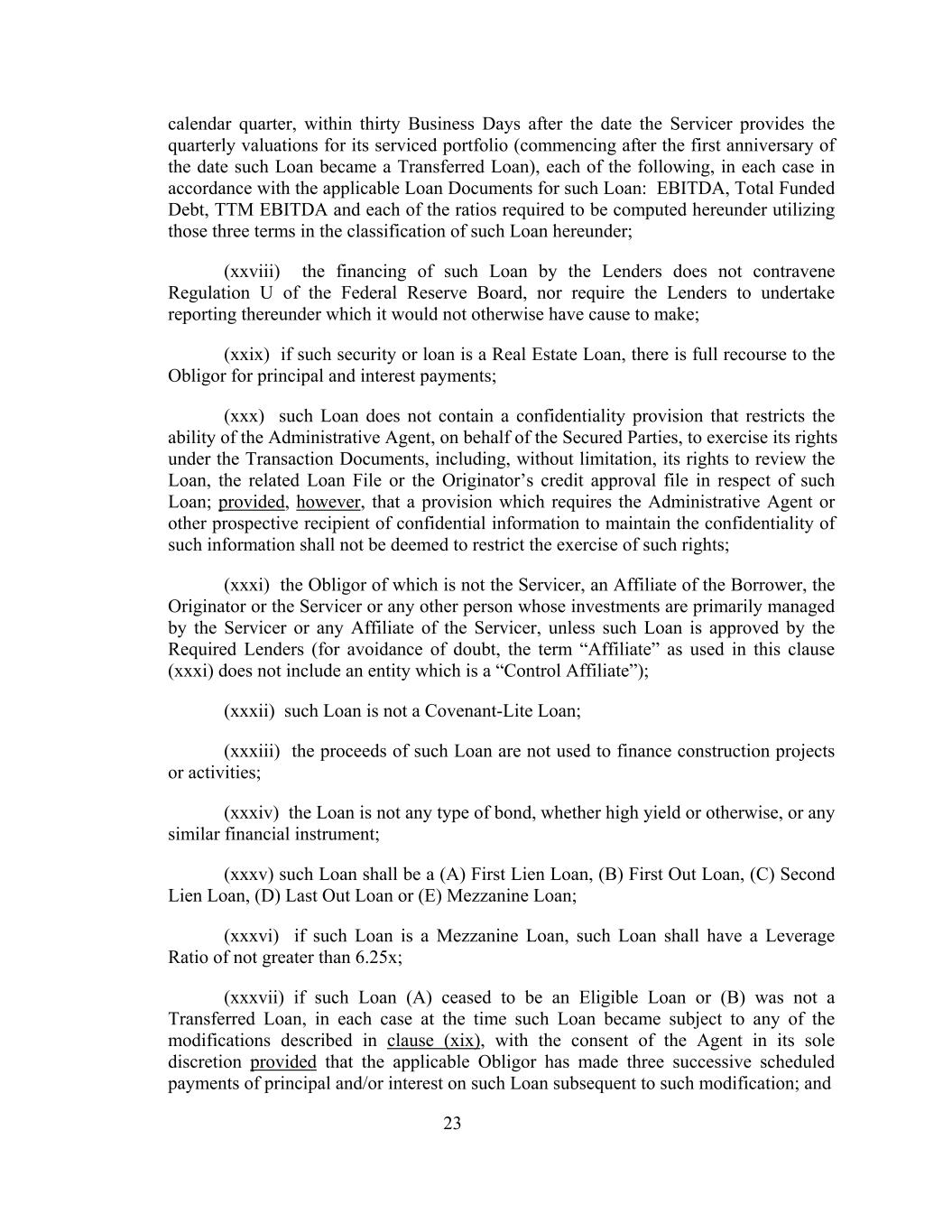 日历季度,自服务商提供其服务组合的季度估值之日起三十个工作日内(从该贷款成为转让贷款之日起一周年之后开始),在每种情况下,根据该贷款的适用贷款文件,分别执行以下各项:EBITDA、已融资债务总额、TTM EBITDA以及在此项下使用该三个术语在此项下对该贷款进行分类时需要计算的每一个比率;(二十八)贷款人为该贷款提供的融资不违反联邦储备委员会的U条例,也不要求贷款人承担其原本没有理由作出的报告;(xxix)如果此类担保或贷款是房地产贷款,则对债务人的本金和利息支付有充分的追索权;(xxx)此类贷款不包含限制行政代理人代表有担保当事人行使其在交易文件下权利的保密规定,包括但不限于其就此类贷款审查贷款、相关贷款档案或发起人的信贷批准档案的权利;但前提是,规定保密资料的行政代理人或其他潜在接收人须对该等资料保密的条文,不得视为限制行使该等权利;(二十三十一)该等义务人并非服务人、借款人的附属公司、发起人或服务人或其投资主要由服务人或服务人的任何附属公司管理的任何其他人,除非该等贷款已获规定贷款人批准(为免生疑问,本条款(xxxi)中使用的“关联公司”一词不包括属于“控制关联公司”的实体);(xxxii)此类贷款不是Covenant-Lite贷款;(xxxiii)此类贷款的收益不用于为建设项目或活动提供资金;(xxxiv)该贷款不是任何类型的债券,无论是高收益还是其他,或任何类似的金融工具;(xxxv)此类贷款应为(a)第一留置权贷款、(b)先出贷款、(c)第二留置权贷款、(d)后出贷款或(e)夹层贷款;(xxxvi)如果此类贷款是夹层贷款,该贷款的杠杆比率不应高于6.25x;(xxxvii)如果该贷款(a)不再是合格贷款或(b)不是转让贷款,在每种情况下,在该贷款成为第(xix)条所述任何修改的约束时,经代理人全权酌情同意,条件是适用的债务人已在该修改后连续三次按计划支付该贷款的本金和/或利息;以及23