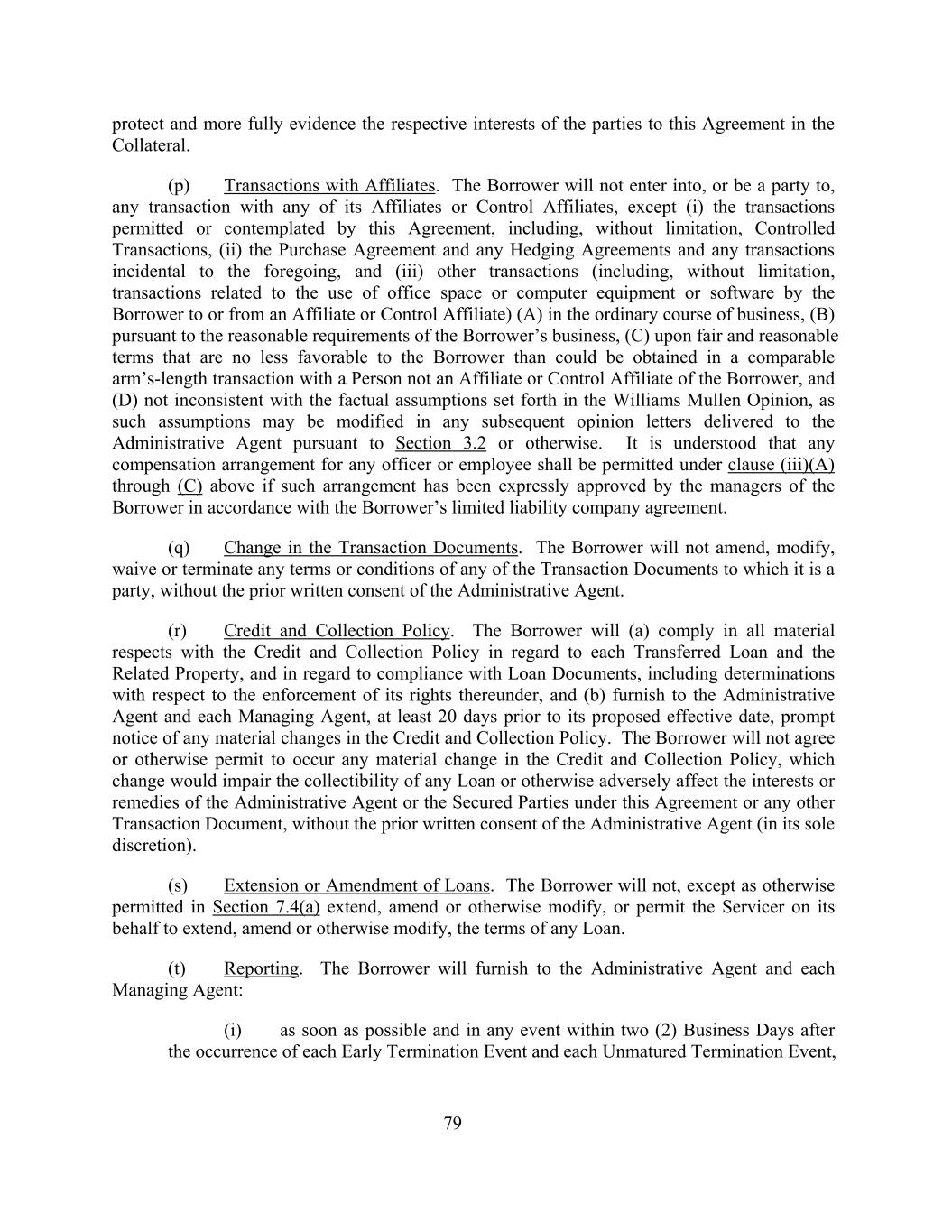 保护并更充分地证明本协议各方在担保物中的各自利益。(p)与关联公司的交易。借款人将不会与其任何关联公司或控制关联公司进行任何交易或成为其一方,但(i)本协议允许或设想的交易,包括但不限于受控交易,(ii)购买协议和任何套期保值协议以及前述附带的任何交易,以及(iii)其他交易(包括但不限于借款人与关联公司或控制关联公司或控制关联公司使用办公空间或计算机设备或软件有关的交易)(a)在正常业务过程中,(b)根据借款人业务的合理要求,(c)以公平合理的条款对借款人不低于在与非借款人的关联公司或控制关联公司的人进行的可比公平交易中可能获得的优惠,以及(d)不与威廉姆斯 Mullen意见中所述的事实假设不一致,因为这些假设可能会在随后根据第3.2节或其他方式交付给行政代理人的任何意见函中进行修改。据了解,任何高级人员或雇员的任何补偿安排,如已获借款人的经理人根据借款人的有限责任公司协议明确批准,则根据上文第(iii)(a)至(c)条,应予准许。(q)交易文件的变更。未经行政代理人事先书面同意,借款人不会修改、修改、放弃或终止其作为当事人的任何交易文件的任何条款或条件。(r)信贷和催收政策。借款人将(a)在所有重大方面遵守关于每笔转让贷款和相关财产的信贷和催收政策,并在遵守贷款文件方面,包括关于强制执行其在贷款文件下的权利的决定,以及(b)至少在其提议的生效日期前20天向行政代理人和每个管理代理人提供信贷和催收政策的任何重大变化的及时通知。未经行政代理人事先书面同意(全权酌情决定),借款人不会同意或以其他方式允许发生信贷和催收政策的任何重大变更,该变更将损害任何贷款的可收回性或以其他方式对行政代理人或有担保当事人在本协议或任何其他交易文件下的利益或补救措施产生不利影响。(s)延长或修订贷款。除第7.4(a)条另有许可外,借款人将不会延长、修订或以其他方式修改任何贷款的条款,或允许服务人代表其延长、修订或以其他方式修改任何贷款的条款。(t)报告。借款人将向行政代理人和各管理代理人提供:(i)在每项提前终止事件和每项未到期终止事件发生后的两(2)个营业日内尽快并在任何情况下,79