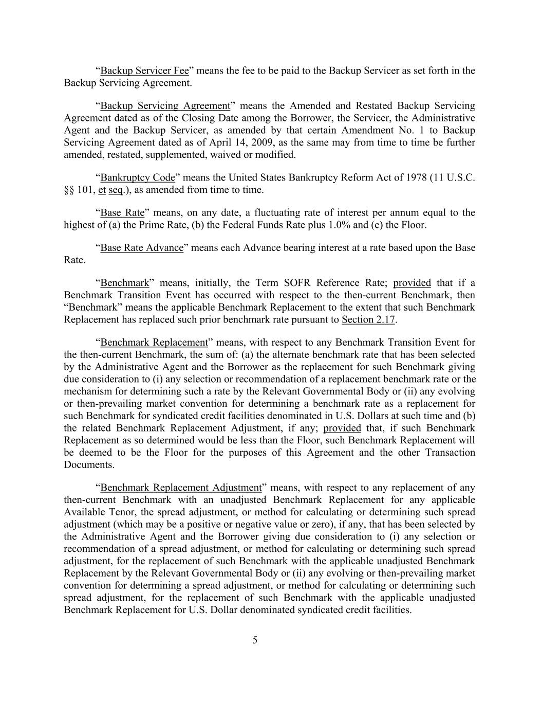 “备份服务商费用”是指备份服务协议中规定的向备份服务商支付的费用。「备份服务协议」指借款人、服务人、行政代理人及备份服务人于截止日订立的经修订及重述的备份服务协议,并经截至二零零九年四月十四日的备份服务协议的若干修订第1号修订而不时作出进一步修订、重述、补充、豁免或修改。“破产法”是指1978年《美国破产改革法》(11 U.S.C. § 101等),不时修订。“基准利率”是指在任何日期,浮动的年利率等于(a)最优惠利率、(b)联邦基金利率加上1.0%和(c)最低利率中的最高值。“基准利率预付款”是指每笔预付款按基于基准利率的利率计息。“基准”最初是指术语SOFR参考利率;前提是,如果就当时的基准发生了基准过渡事件,那么“基准”是指适用的基准替换,只要此种基准替换已根据第2.17节取代了此种先前的基准利率。“基准替换”是指,对于当时的基准的任何基准转换事件,(a)由行政代理人和借款人选定的替代基准利率,并适当考虑到(i)相关政府机构对替代基准利率或确定此类利率的机制的任何选择或建议,或(ii)任何正在演变或当时盛行的确定基准利率以替代当时以美元计价的银团信贷融资的此类基准的市场惯例,以及(b)相关的基准替代调整(如有);但,如果如此确定的基准替换将低于下限,则就本协议和其他交易文件而言,该基准替换将被视为下限。“基准置换调整”是指,就任何当时的基准以未经调整的基准置换任何适用的可用期限而言,由行政代理人和借款人在适当考虑(i)任何利差调整的选择或建议、或计算或确定该利差调整的方法(可能是正值或负值或零)而选择的利差调整或计算或确定该利差调整的方法,用于由相关政府机构以适用的未调整基准替代替代此类基准或(ii)任何正在演变或当时盛行的确定价差调整的市场惯例,或计算或确定此类价差调整的方法,以美元计价银团信贷额度的适用的未调整基准替代此类基准。5