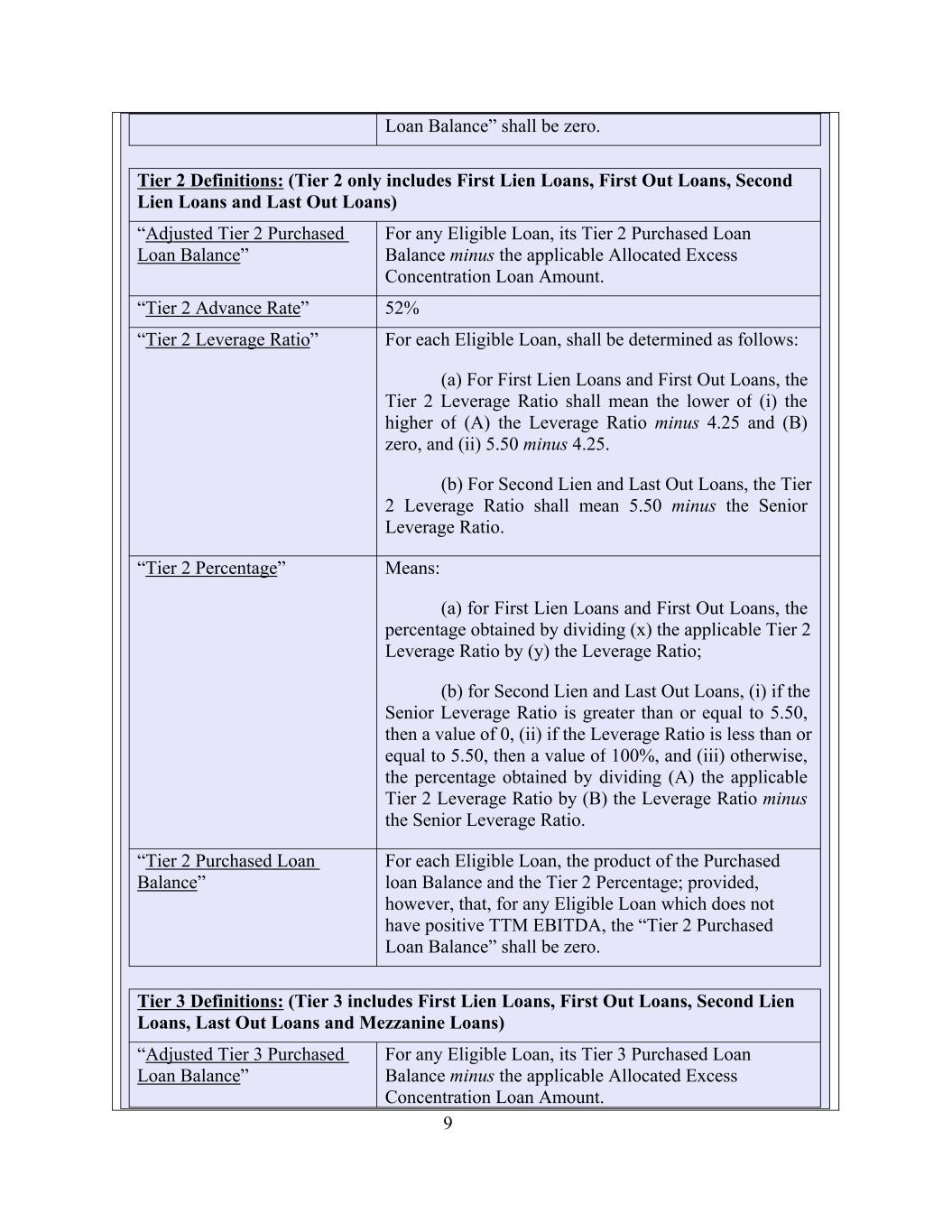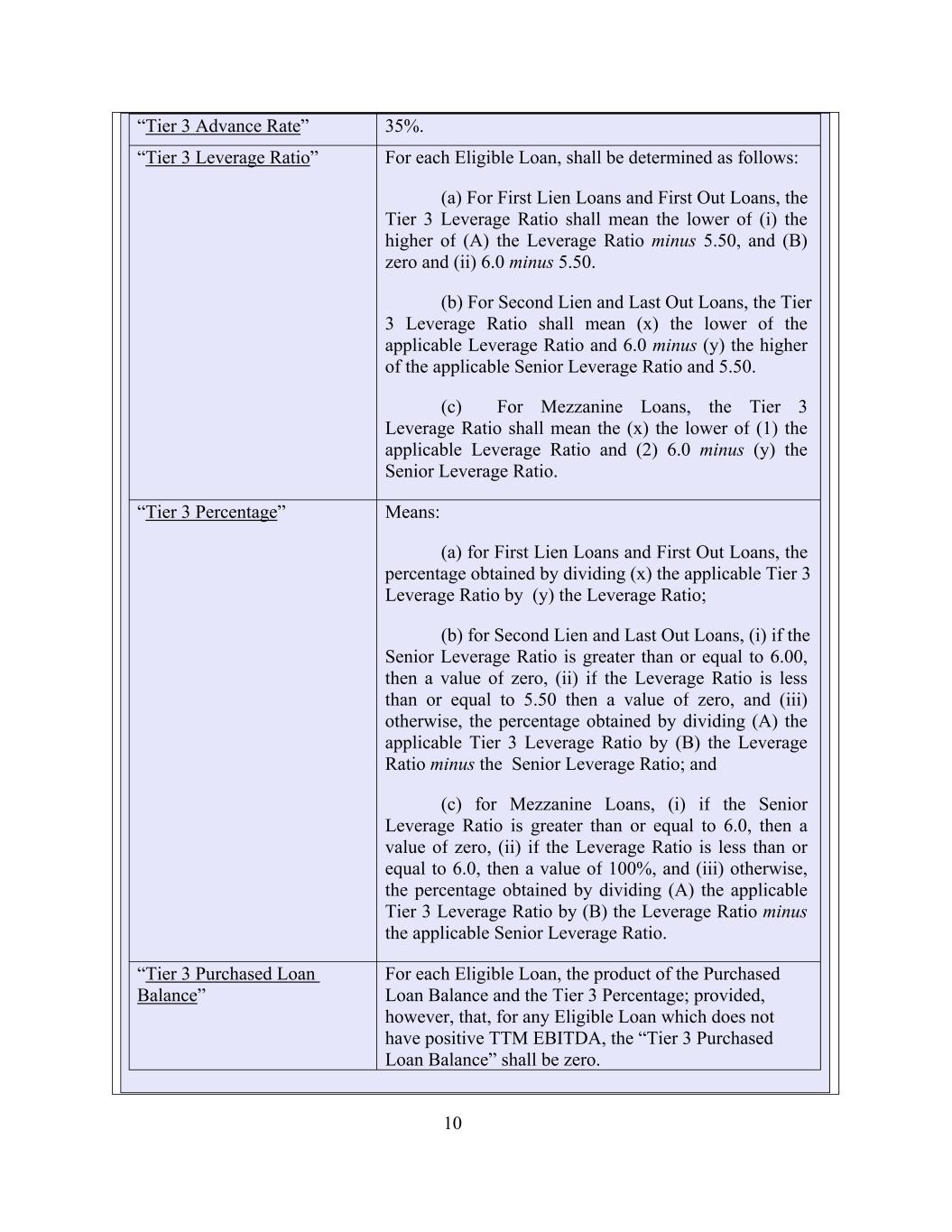10“Tier 3 Advance Rate”“Tier 3 Percentage”是指:(a)对于第一留置权贷款和先出贷款,通过(x)适用的第三级杠杆率除以(y)杠杆率得到的百分比;(b)对于第二留置权和后出贷款,(i)如果优先杠杆率大于或等于6.00,则取值为零,(ii)如果杠杆率小于或等于5.50,则取值为零,以及(iii)否则,(a)适用的三级杠杆比率除以(b)杠杆比率减去高级杠杆比率所得的百分比;(c)对于夹层贷款,(i)如果高级杠杆比率大于或等于6.0,则取值为零,(ii)如果杠杆比率小于或等于6.0,则取值为100%,(iii)否则,将(a)适用的三级杠杆比率除以(b)杠杆比率减去适用的高级杠杆比率所得的百分比。“三级杠杆率”35%。每笔符合条件的贷款的“Tier 3 Purchased Loan Balance”,应按以下方式确定:(a)对于第一留置权贷款和先出贷款,Tier 3杠杆率是指(i)(a)杠杆率减去5.50的较高者,以及(b)零和(ii)6.0减去5.50的较低者。(b)对于第二留置权和最后一笔贷款,第三级杠杆比率是指(x)适用的杠杆比率和6.0中的较低者减去(y)适用的高级杠杆比率和5.50中的较高者。(c)对于夹层贷款,第三级杠杆率是指(x)(1)适用杠杆率和(2)6.0中的较低者减去(y)高级杠杆率。对于每笔符合条件的贷款,购买的贷款余额与Tier3百分比的乘积;但前提是,对于任何不存在正的TTM EBITDA的符合条件的贷款,“Tier3购买的贷款余额”应为零。