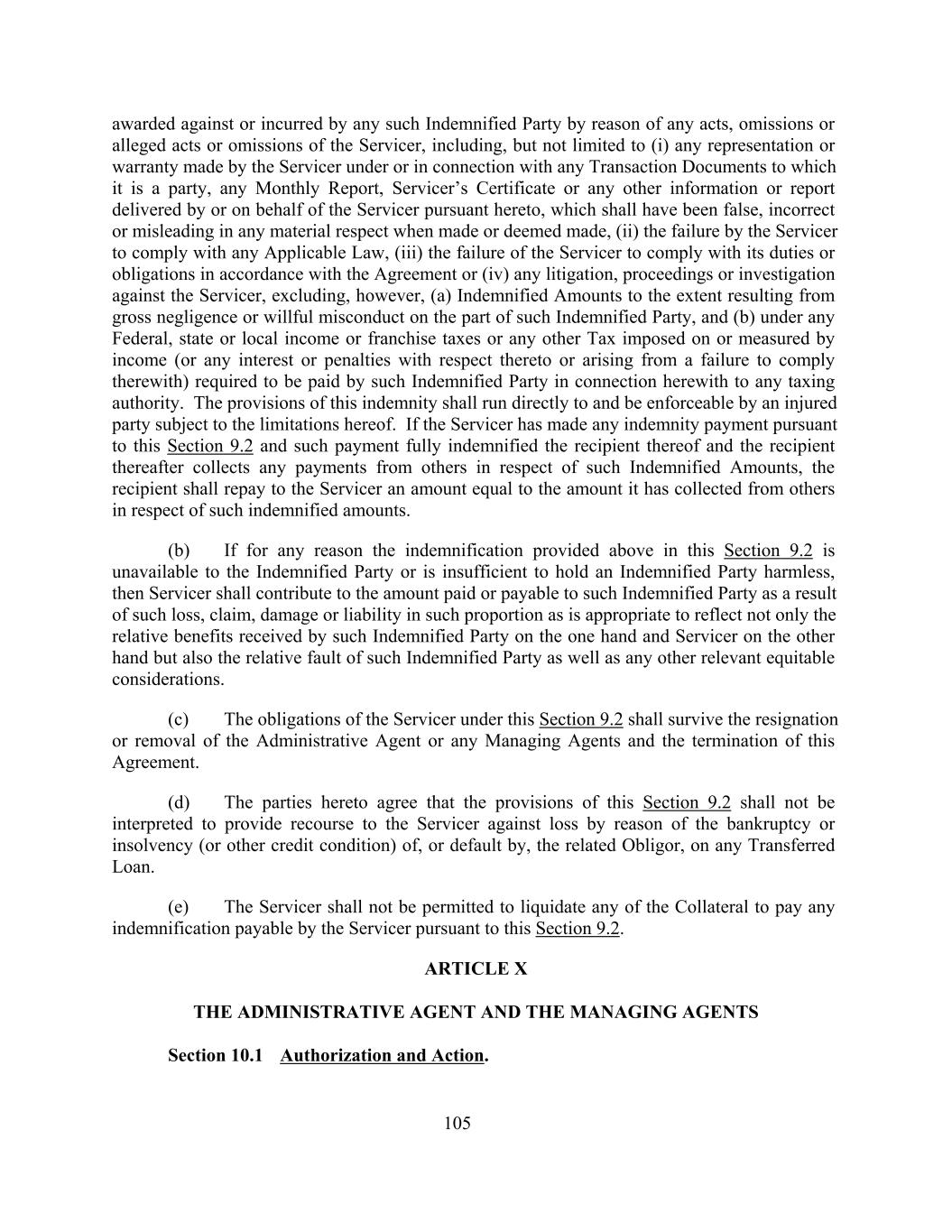 任何该等获弥偿方因服务商的任何作为、不作为或指称的作为或不作为而被判给或招致,包括但不限于(i)服务商根据或与其作为一方的任何交易文件、任何月度报告、服务商证书或由或代表该服务商根据本协议交付的任何其他资料或报告有关而作出的任何陈述或保证,而该等陈述或保证在作出或被视为作出时在任何重要方面均属虚假、不正确或具有误导性,(ii)服务人未能遵守任何适用法律,(iii)服务人未能按照协议遵守其职责或义务,或(iv)针对服务人的任何诉讼、法律程序或调查,但不包括(a)因该受弥偿方的重大过失或故意不当行为而导致的弥偿金额,及(b)根据任何联邦,州或地方所得税或特许经营税或任何其他由收入征收或计量的税款(或与此相关或因未能遵守而产生的任何利息或罚款)要求该受赔方就此向任何税务机关支付。本赔偿的规定应在受本赔偿时效限制的情况下直接运行并可由受害方强制执行。如服务人已依据本条第9.2条作出任何弥偿付款,而该等付款已全数向收款人作出弥偿,而收款人其后就该等弥偿金额向他人收取任何款项,则收款人须向服务人偿还与其就该等弥偿金额向他人收取的款额相等的款额。(b)如因任何理由,本条例第9.2条中上述规定的赔偿不能提供予受弥偿方或不足以使受弥偿方免受损害,则服务人须按适当的比例分摊因该损失、申索、损害或赔偿责任而支付或应付予该受弥偿方的款额,以不仅反映该受弥偿方一方和服务方一方所获得的相对利益,而且反映该受弥偿方的相对过失以及任何其他相关衡平法考虑。(c)服务人根据本条第9.2款承担的义务,在行政代理人或任何管理代理人辞职或被撤职以及本协议终止后仍然有效。(d)本协议各方同意,本条第9.2条的规定不得解释为就任何转让贷款向服务人提供追索权,以对抗因相关债务人的破产或无力偿债(或其他信用条件)或违约而造成的损失。(e)不得准许服务人清算任何抵押品,以支付服务人依据本条第9.2条须支付的任何弥偿。第十条行政代理和管理代理第10.1节授权和行动。105