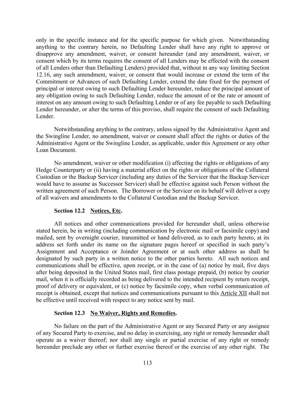 仅在特定情况下和为特定目的而给定。尽管有任何与此相反的规定,任何违约贷款人均无权批准或不批准本协议项下的任何修订、放弃或同意(以及根据其条款需要所有贷款人同意的任何修订、放弃或同意,可在除违约贷款人之外的所有贷款人同意的情况下进行),但在不以任何方式限制第12.16条的情况下,任何此类修订、放弃或同意将增加或延长该违约贷款人的承诺或垫款的期限,延长根据本协议向该违约贷款人支付本金或利息的固定日期,减少欠该违约贷款人的任何债务的本金金额,减少欠该违约贷款人的任何金额的利息金额或利率或金额,或根据本协议向该违约贷款人支付的任何费用,或更改本但书的条款,均须征得该违约贷款人的同意。尽管有任何相反的规定,除非经行政代理人与Swingline贷款人签署,否则任何修订、放弃或同意均不影响行政代理人或Swingline贷款人(如适用)在本协议或任何其他贷款文件下的权利或义务。任何修订、放弃或其他修改(i)影响任何对冲交易对手的权利或义务,或(ii)对抵押品托管人或备用服务商的权利或义务(包括备用服务商作为继任服务商必须承担的任何义务)均不得在未经该人书面同意的情况下对该人具有效力。借款人或代其提供服务者将向抵押品托管人和备用服务者交付所有豁免和修订的副本。第12.2节通知等。除本协议另有规定外,本协议项下规定的所有通知和其他通信均应以书面形式(包括以电子邮件或传真副本进行的通信),并就本协议每一方而言,按本协议签字页上其名下所列地址或该方转让和接受或共同协议中指明的地址或按该方在给本协议其他方的书面通知中指定的其他地址邮寄、隔夜快递、传送或专人递送。所有这类通知和通信均应在收到时生效,或在(a)邮寄通知的情况下,在寄存于美国邮件五天后,预付一等邮资,(b)快递邮件通知,当正式记录为通过回执、交付证明或同等证明方式交付给预定收件人时,或(c)通过传真副本发出通知,当获得口头收到通知时,但根据本条第十二条发出的通知和通信在收到任何邮寄通知之前不生效。第12.3节没有放弃、权利和补救。行政代理人或任何有担保方或任何有担保方的任何受让人未行使、也未迟延行使本协议项下的任何权利或补救办法,均应作为对其放弃而运作;也不应因单独或部分行使本协议项下的任何权利或补救办法而排除任何其他或进一步行使该权利或行使任何其他权利。113号