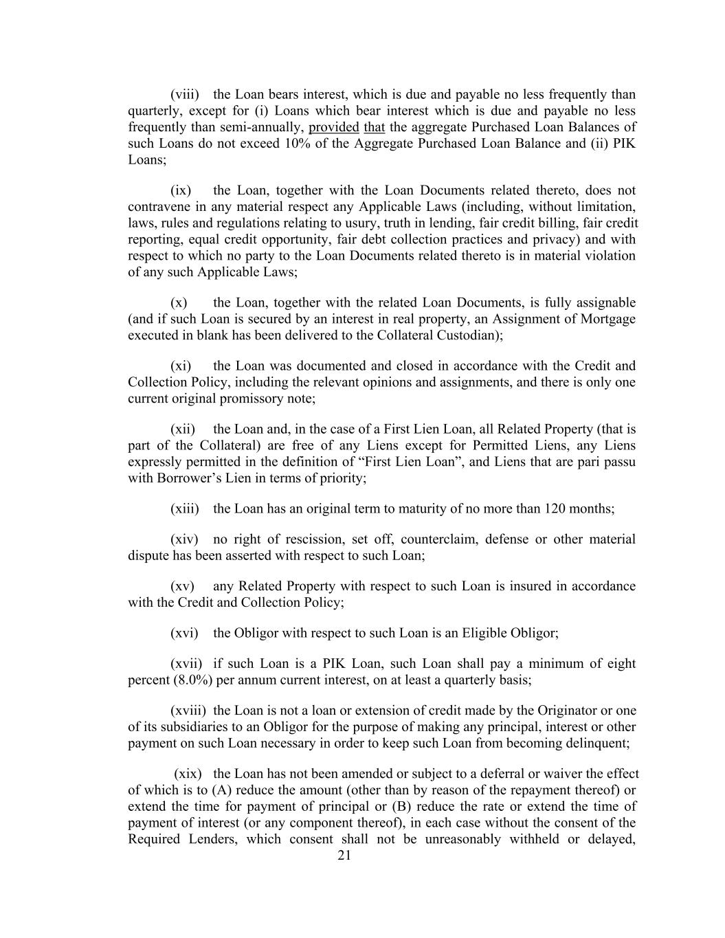 (viii)贷款有利息,到期应付的频率不低于季度,但(i)贷款有利息,到期应付的频率不低于半年,但该等贷款的已购贷款余额总额不超过已购贷款余额总额的10%及(ii)PIK贷款;(ix)该贷款连同与其有关的贷款文件,在任何重大方面均不违反任何适用的法律(包括但不限于与高利贷有关的法律、规则和条例、放贷的真实性、公平的信贷账单、公平的信贷报告、平等的信贷机会,公平的债务催收做法和隐私),并且与此相关的贷款文件的任何一方均未严重违反任何此类适用法律;(x)贷款连同相关贷款文件是完全可转让的(如果此类贷款是由不动产权益担保的,则已将空白执行的抵押转让交付给抵押托管人);(xi)贷款是根据信贷和催收政策(包括相关意见和转让)记录和结清的,且目前只有一张原始本票;(xii)贷款,以及在第一留置权贷款的情况下,所有相关财产(即抵押品的一部分)除允许的留置权、“第一留置权贷款”定义中明确允许的任何留置权以及在优先权方面与借款人的留置权同等的留置权外,不存在任何留置权;(xiii)贷款的原始到期期限不超过120个月;(xiv)没有撤销、抵销、反索赔的权利,已就该贷款提出抗辩或其他重大争议;(xv)与该贷款有关的任何相关财产均已按照信贷和催收政策投保;(xvi)该贷款的债务人为合格债务人;(xvii)如果该贷款为PIK贷款,则该贷款应支付最低年利率百分之八(8.0%)的当期利息,至少每季度一次;(xviii)该贷款并非由发起人或其附属公司之一为取得任何本金而向债务人作出的贷款或提供信贷,为避免此类贷款拖欠所必需的此类贷款的利息或其他付款;(xix)该贷款未被修改或受到延期或豁免,其影响是(a)减少金额(由于偿还本金的原因除外)或延长支付本金的时间或(b)降低利率或延长支付利息(或其任何组成部分)的时间,在每种情况下,未经所需贷款人同意,不得无理拒绝或延迟同意,21