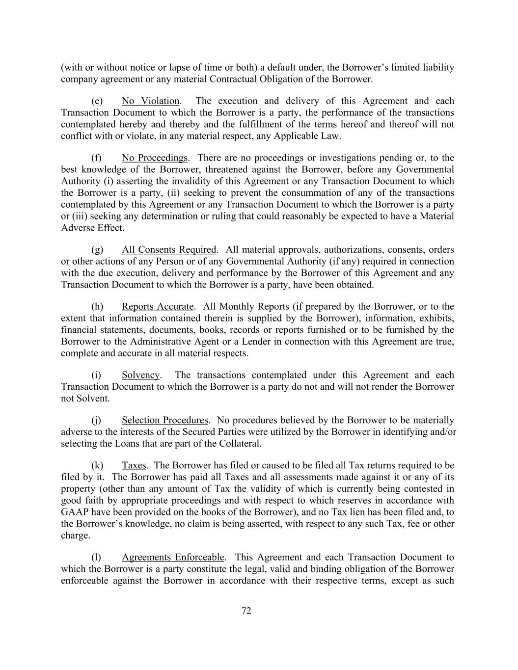 (无论是否通知或时间流逝或两者兼而有之)违约,借款人的有限责任公司协议或借款人的任何重大合同义务。(e)没有违反。本协议及借款人作为一方当事人的每份交易文件的执行和交付、本协议及由此设想的交易的履行以及本协议及其条款的履行,在任何重大方面均不会与任何适用法律发生冲突或违反。(f)无程序。在任何政府当局(i)断言本协议或借款人作为当事方的任何交易文件无效之前,(ii)寻求阻止本协议或借款人作为当事方的任何交易文件所设想的任何交易的完成,或(iii)寻求可合理预期会产生重大不利影响的任何确定或裁决之前,没有任何程序或调查待决或据借款人所知对借款人构成威胁。(g)所需的所有同意。任何人或任何政府当局(如有的话)就借款人适当执行、交付和履行本协议和借款人作为当事方的任何交易文件所需的所有重要批准、授权、同意、命令或其他行动均已获得。(h)报告准确。所有月度报告(如由借款人编制,或在其中所载信息由借款人提供的范围内)、信息、证物、财务报表、文件、簿册、记录或借款人就本协议向行政代理人或贷款人提供或将提供的报告在所有重大方面均为真实、完整和准确的。(i)偿付能力。本协议项下拟进行的交易以及借款人作为当事方的每份交易文件不会也不会使借款人无法解决。(j)甄选程序。借款人在确定和/或选择作为抵押品一部分的贷款时,没有使用借款人认为对有担保当事人的利益有重大不利影响的程序。(k)税收。借款人已提交或促使提交其要求提交的所有纳税申报表。借款人已支付对其或其任何财产作出的所有税款和所有评估(目前正通过适当程序善意质疑其有效性的任何税额除外,并且已在借款人的账簿上提供了根据公认会计原则提供的准备金),并且没有提出任何税务留置权,而且据借款人所知,没有就任何此类税款、费用或其他费用提出索赔。(l)可强制执行的协议。本协议和借款人作为一方当事人的每份交易文件构成借款人根据各自条款可对借款人强制执行的合法、有效和具有约束力的义务,但作为例外的72