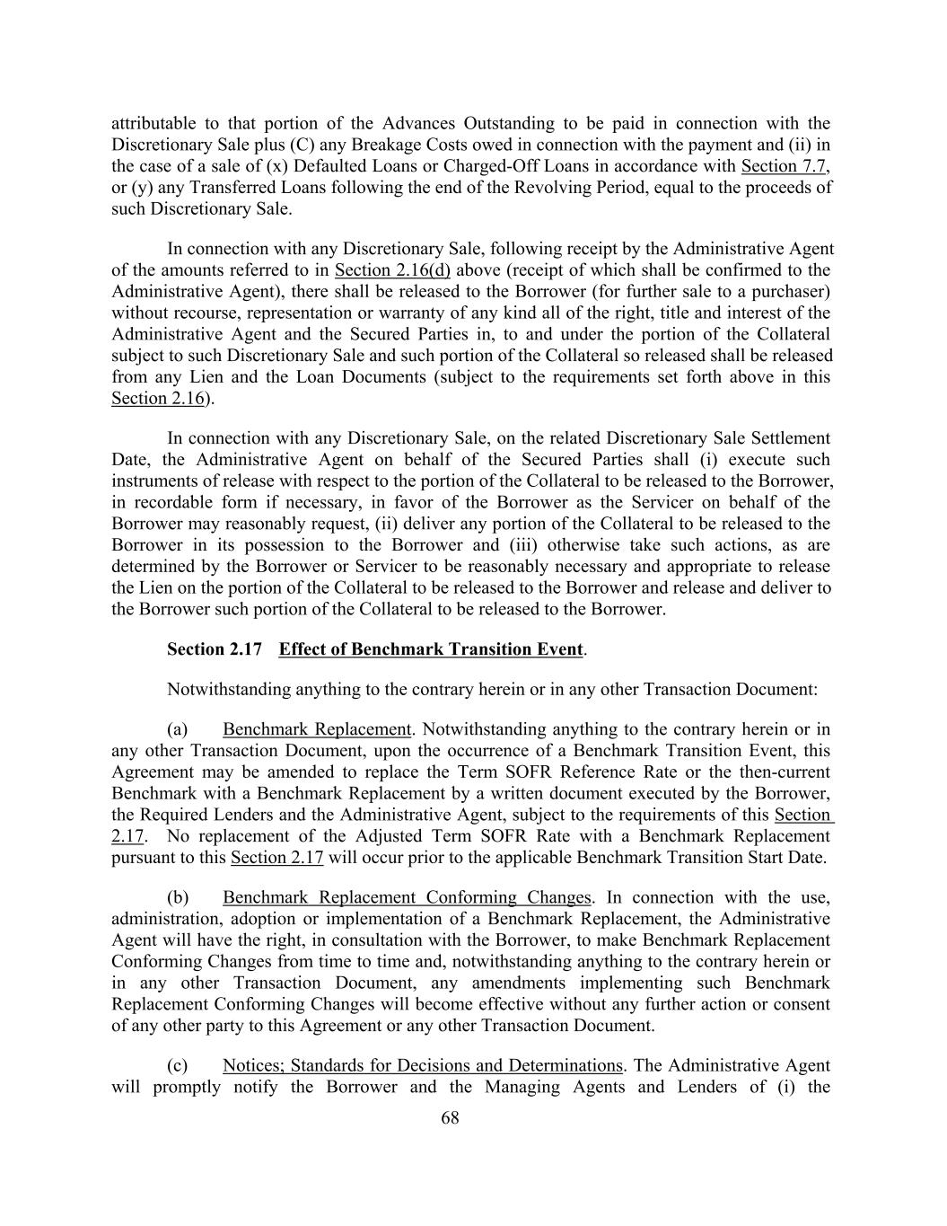 归属于与全权出售有关的未偿还预付款的那部分加上(c)与付款有关的任何违约费用和(ii)在出售(x)根据第7.7节违约贷款或已注销贷款的情况下,或(y)循环期结束后的任何转让贷款的情况下,等于此种全权出售的收益。就任何酌情出售而言,在行政代理人收到上述第2.16(d)节所指的金额(其收到应向行政代理人确认)后,应将行政代理人和有担保当事人的所有权利、所有权和利益在没有任何追索权、陈述或保证的情况下释放给借款人(供进一步出售给买方),受该等酌情出售规限的抵押品的部分及其项下,以及如此解除的抵押品的该部分,须解除任何留置权及贷款文件(但须符合本条第2.16条的上述规定)。就任何酌情出售而言,在相关的酌情出售结算日,代表有担保当事人的行政代理人应(i)就将向借款人解除的担保物部分签署必要时以可记录形式有利于借款人的解除文书,这是代表借款人的服务人可能合理要求的,(ii)将将将解除的担保物的任何部分交付给其管有的借款人,并(iii)以其他方式采取此类行动,由借款人或服务人确定为合理必要和适当的,以解除对将解除给借款人的抵押品部分的留置权,并解除和向借款人交付将解除给借款人的抵押品部分。第2.17节基准转换事件的效果。尽管本文或任何其他交易文件中有任何相反的规定:(a)基准替换。尽管在此或任何其他交易文件中有任何相反的规定,在发生基准过渡事件时,本协议可进行修订,以由借款人、所需贷款人和行政代理人签署的书面文件以基准取代定期SOFR参考利率或当时的基准,但须符合本节2.17的要求。在适用的基准过渡开始日期之前,不会发生根据本节2.17以基准更替取代调整后的定期SOFR费率的情况。(b)基准更换符合变化。就基准替换的使用、管理、采用或实施而言,行政代理人将有权与借款人协商,不时进行基准替换符合性变更,尽管本文或任何其他交易文件中有任何相反的规定,但实施此类基准替换符合性变更的任何修订将生效,而无需本协议或任何其他交易文件的任何其他方采取任何进一步行动或同意。(c)通知;决定和裁定的标准。行政代理人将及时通知借款人和经理人及出借人(i)第68