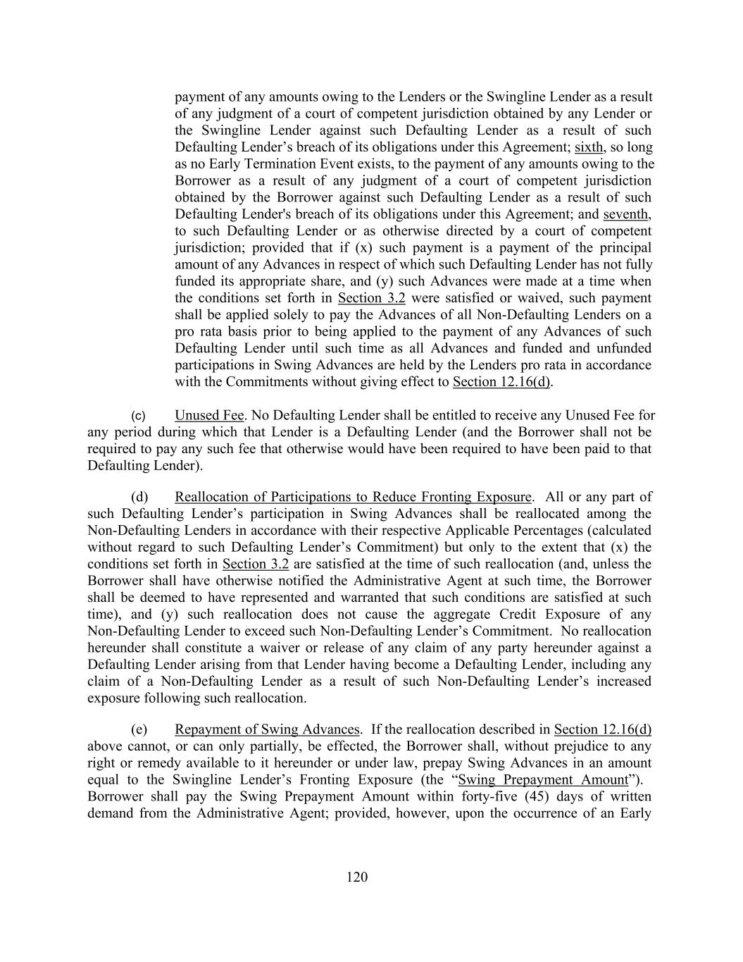 支付任何贷款人或Swingline贷款人因该违约贷款人违反其在本协议下的义务而针对该违约贷款人获得的任何有管辖权的法院的任何判决而欠该贷款人或Swingline贷款人的任何款项;第六,只要不存在提前终止事件,支付借款人因该违约贷款人违反其在本协议下的义务而对该违约贷款人作出的任何有管辖权的法院的判决而欠该借款人的任何款项;第七,支付给该违约贷款人或根据有管辖权的法院的其他指示;但如果(x)该等付款是该违约贷款人尚未为其适当份额提供全部资金的任何垫款的本金金额的支付,(y)该等垫款是在满足或放弃第3.2节所列条件时作出的,该等付款应仅用于在适用于支付该违约贷款人的任何垫款之前按比例支付所有非违约贷款人的垫款,直至所有垫款以及周转垫款的有资金和无资金参与均由贷款人按照承诺按比例持有,而不影响第12.16(d)节。(c)未使用费用。任何违约贷款人均无权在该贷款人为违约贷款人的任何期间收取任何未使用的费用(且借款人无需支付任何本应被要求支付给该违约贷款人的此类费用)。(d)重新分配参与以减少前沿暴露。该等违约贷款人参与周转垫款的全部或任何部分应在非违约贷款人之间按照其各自适用的百分比(计算时不考虑该违约贷款人的承诺)重新分配,但仅限于(x)在该重新分配时满足第3.2节中规定的条件(并且,除非借款人当时已另行通知行政代理人,否则借款人应被视为已代表并保证该等条件在当时得到满足),(y)此类重新分配不会导致任何非违约贷款人的总信用敞口超过该非违约贷款人的承诺。本协议项下的任何重新分配均不构成对本协议项下任何一方针对已成为违约贷款人的违约贷款人提出的任何债权的放弃或解除,包括非违约贷款人因此类重新分配后该非违约贷款人的风险敞口增加而提出的任何债权。(e)偿还周转预付款。如果上述第12.16(d)节所述的重新分配不能或只能部分实现,则借款人应在不损害其根据本协议或根据法律可获得的任何权利或补救的情况下,预付相当于Swingline贷款人的前期风险敞口的金额(“周转预付款金额”)的周转预付款。借款人应在行政代理人提出书面要求后的四十五(45)天内支付周转预付款金额;但前提是,一旦发生早期120