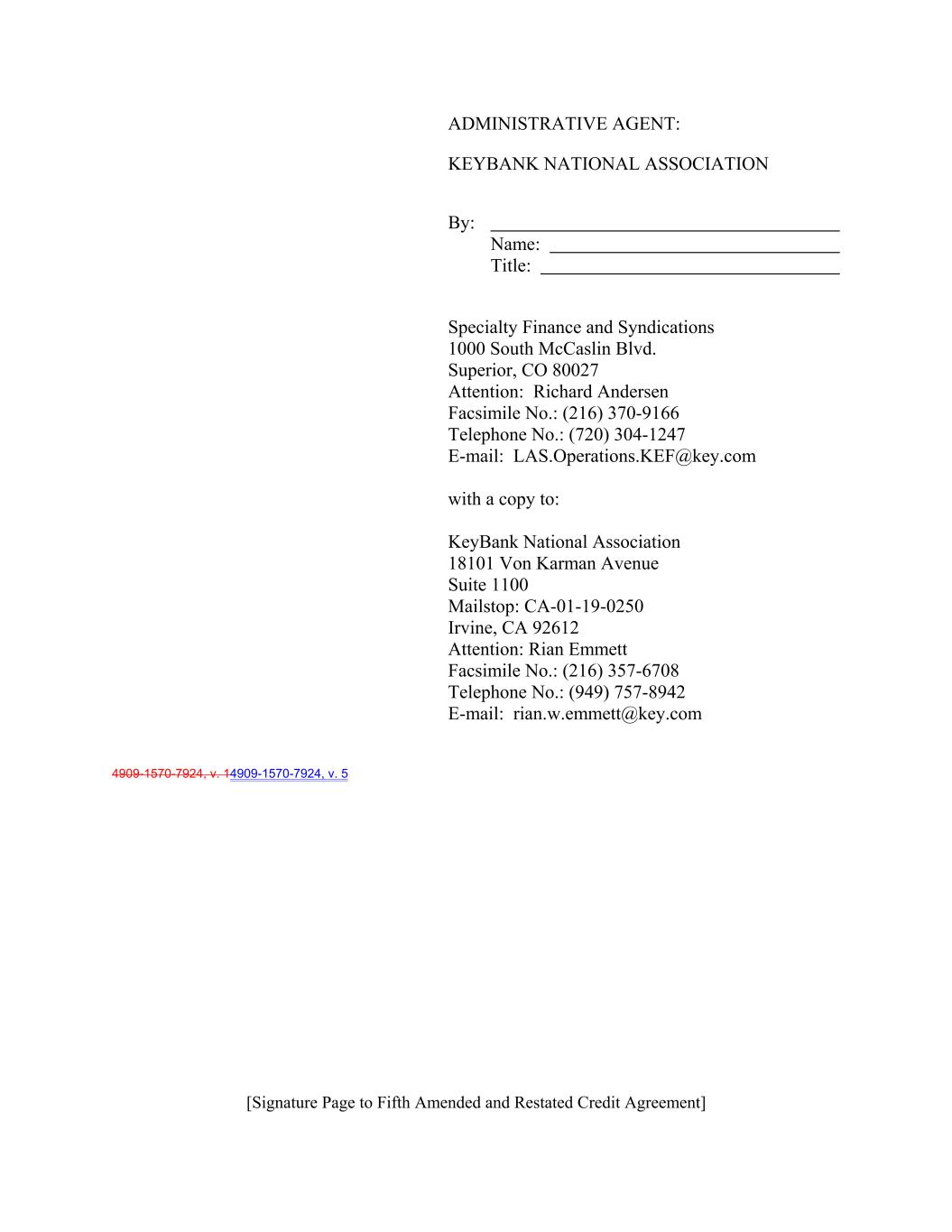 行政代理:KEYBANK National Association by:Name:Title:Specialty Finance and Syndications 1000 South McCaslin Blvd. Superior,CO 80027收件人:Richard Andersen传真号码:(216)370-9166电话号码:(720)304-1247邮箱:LAS.Operations.KEF@key.com并抄送:KeyBank National Association 18101 Von Karman Avenue Suite 1100邮箱:CA-01-19-0250 Irvine,加利福尼亚州 92612收件人:Rian Emmett传真号码:(216)357-6708电话号码:(949)757-8942邮箱:rian.w.emmett@key.com 4909-1570-7912邮箱:CA-01-19-0250 Irvine,