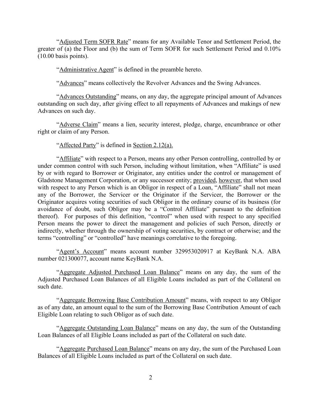 “调整后期限SOFR率”是指对于任何可用的期限和结算期,(a)下限和(b)该结算期的期限SOFR之和与0.10%(10.00个基点)中的较大者。“行政代理人”定义于本协议序言部分。“前进”是指左轮式前进和摇摆式前进的统称。“未偿还垫款”是指,在任何一天,在该日所有偿还垫款和在该日进行新的垫款后,在该日未偿还垫款的本金总额。“反向债权”是指任何人的留置权、担保权益、质押、押记、产权负担或其他权利或债权。“受影响方”在第2.12(a)节中定义。就某人而言,“关联关系”是指控制、控制或与该人共同控制的任何其他人,包括但不限于当“关联关系”被借款人或发起人、Gladstone Management Corporation控制或管理下的任何实体或任何继承实体使用或与之相关时;但是,就任何就贷款而言是义务人的人而言,“关联关系”不是指借款人、服务商或发起人中的任何一人,如果服务商,借款人或发起人在其正常业务过程中获得该债务人的有表决权证券(为免生疑问,该债务人可根据其定义为“控制关联公司”)。就本定义而言,“控制”(control)在用于任何特定人员时,是指直接或间接地指导该人员的管理和政策的权力,无论是通过投票证券的所有权、通过合同或其他方式;“控制”或“受控”等术语具有与上述相关的含义。“代理账户”是指KeyBank N.A. ABA编号021300077的账号329953020917,账户名称KeyBank N.A.“调整后购买贷款余额总额”是指在任何一天,在该日期作为部分抵押品包括的所有合格贷款的调整后购买贷款余额之和。“总借款基础缴款金额”是指,就截至任何日期的任何债务人而言,金额等于截至该日期与该债务人有关的每笔合格贷款的借款基础缴款金额之和。“未偿还贷款余额总额”是指在任何一天,在该日期作为部分抵押品包括的所有合格贷款的未偿还贷款余额之和。“总购买贷款余额”是指在任何一天,在该日期作为抵押品的一部分包括在内的所有合格贷款的已购买贷款余额之和。2