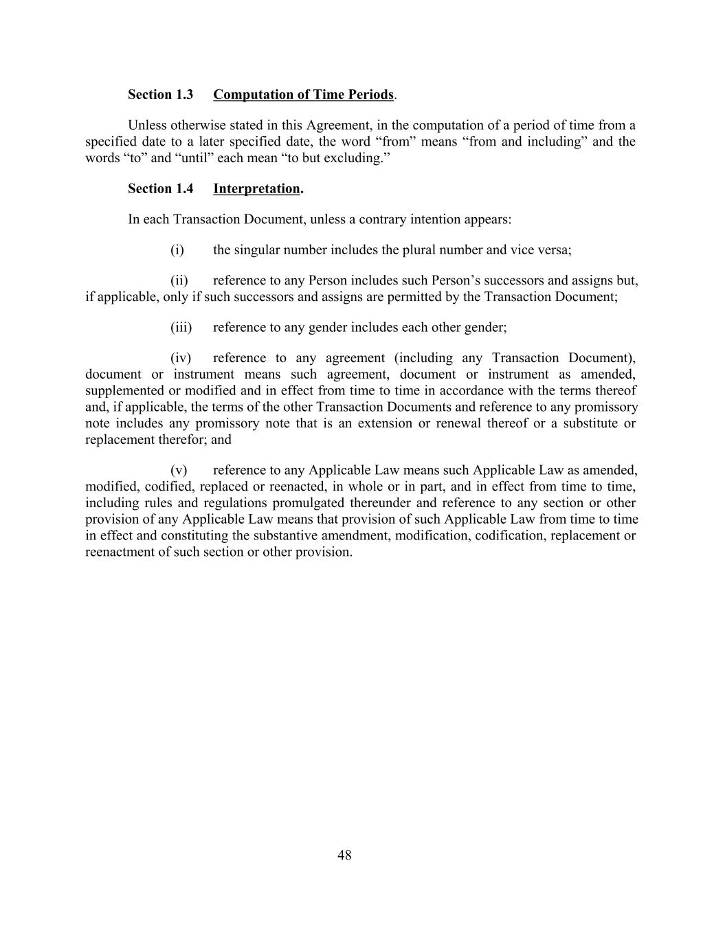 第1.3节时间周期的计算。除非本协议另有规定,在计算从指定日期到以后指定日期的一段时间时,“从”一词表示“从并包括”,“到”和“直到”各表示“到但不包括”。第1.4节解释。在每份交易文件中,除非出现相反的意图:(i)单数包括复数,反之亦然;(ii)对任何人的提述包括该人的继承人和受让人,但(如适用)仅在该等继承人和受让人获得交易文件允许的情况下;(iii)对任何性别的提述包括彼此性别;(iv)对任何协议(包括任何交易文件)、文件或文书的提述是指根据协议条款修订、补充或修改并不时生效的协议、文件或文书,如适用,其他交易单证的条款和对任何本票的提述,包括作为其延期或续期或替代或替代的任何本票;(v)提述任何适用法律是指经修订、修改、编纂、取代或重新制定的全部或部分并不时生效的适用法律,包括据此颁布的规则和条例以及对任何适用法律的任何章节或其他规定的提述,是指该等适用法律不时生效并构成实质性修订、修改、编纂的规定,取代或重新制定该等条文或其他条文。48