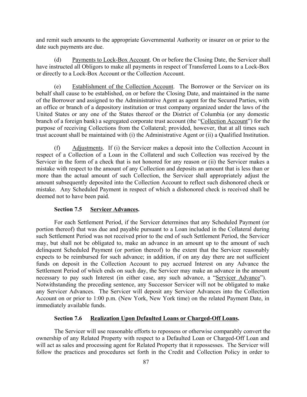 并在此类款项到期之日或之前将此类款项汇给适当的政府当局或保险人。(d)对Lock-Box账户的付款。在截止日或之前,服务人应已指示所有义务人将有关转让贷款的所有款项支付至锁箱或直接支付至锁箱账户或收款账户。(e)建立收款账户。借款人或代其服务人应安排在截止日期或之前以借款人的名义设立并维持并作为有担保当事人的代理人分配给行政代理人,与根据美国或其任何一国法律组建的存款机构或信托公司的办事处或分支机构或哥伦比亚特区(或外国银行的任何国内分支机构)建立独立的公司信托账户(“收款账户”),以接收抵押品的收款;但前提是,在任何时候,该信托账户应与(i)行政代理人或(ii)合格机构保持一致。(f)调整。(i)如(i)服务人就抵押品中的贷款的收款向收款账户存入款项,而该收款是由服务人以支票形式收取,但因任何理由而未予兑现,或(ii)服务人就任何收款的金额作出错误,并存入少于或多于该收款的实际金额,服务人须适当调整其后存入收款账户的金额,以反映该等未予兑现的支票或错误。收到拒付支票的任何预定付款应被视为未支付。第7.5节服务商垫款。对于每个结算期,如果服务商确定在该结算期内根据包含在抵押品中的贷款到期应付的任何预定付款(或其部分)在该结算期结束之前没有收到,则该服务商可以但不应承担义务,在该服务商合理预期将就该预付款获得偿还的范围内,以不超过该拖欠的预定付款(或其部分)的金额为限进行预付款;此外,如果在任何一天,收款账户中没有足够的存款来支付结算期在该日结束的任何预付款的应计利息,服务商可以预付支付该利息所需的金额(在任何一种情况下,任何此类预付款,“服务商预付款”)。尽管有前一句,任何继任服务商将没有义务进行任何服务商垫款。服务商将在相关付款日期的下午1:00(纽约、纽约时间)或之前,以立即可用的资金将任何服务商预付款存入收款账户。第7.6节违约贷款或核销贷款时的变现。服务商将尽合理努力收回或以其他方式比较转换与违约贷款或已核销贷款有关的任何相关财产的所有权,并将作为其收回的相关财产的销售和处理代理。服务商将遵循信贷和催收政策中规定的做法和程序,以便87
