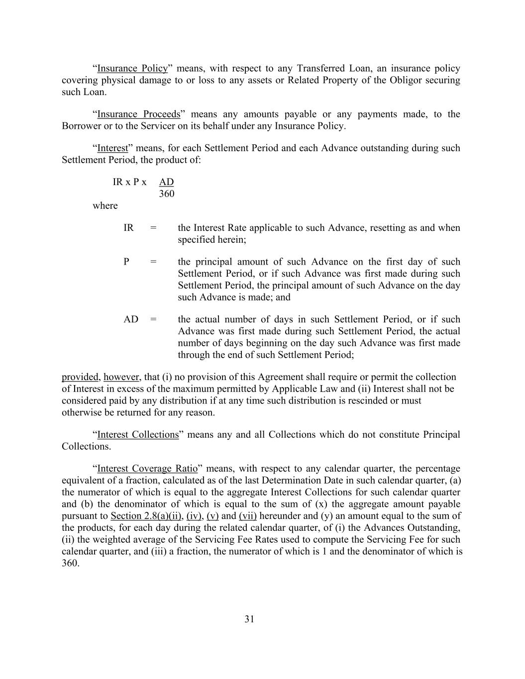 31 IR x P x“保险单”就任何转让的贷款而言,是指涵盖担保此类贷款的债务人的任何资产或相关财产的物理损坏或损失的保险单。“保险收益”是指根据任何保险单向借款人或代其向服务商支付的任何应付金额或已支付的任何款项。“利息”是指,对于该结算期内的每个结算期和每笔未偿还的预付款,乘积为:AD 360,其中IR =适用于该预付款的利率,在此处指定时重置;P =该结算期第一天该预付款的本金金额,或者如果该预付款是在该结算期内首次支付的,则该预付款在该预付款支付当日的本金金额;而AD =该结算期内的实际天数,或者如果该预付款是在该结算期内首次支付的,自首次预付款项之日起至该结算期结束的实际天数;但前提是(i)本协议的任何条款均不得要求或允许收取超过适用法律允许的最高限额的利息,以及(ii)如果在任何时候此类分配被撤销或必须以其他方式因任何理由而返还,则不应将利息视为通过任何分配支付。“利息催收”是指不构成本金催收的任何和所有催收。“利息覆盖率”是指,就任何日历季度而言,截至该日历季度的最后确定日期计算的相当于零头的百分比,(a)其分子等于该日历季度的利息收取总额,以及(b)其分母等于(x)根据本协议第2.8(a)(ii)、(iv)、(v)和(vii)节应付的总额和(y)在相关日历季度的每一天等于(i)未偿预付款的产品总和的金额,(ii)用于计算该日历季度服务费的服务费率的加权平均数,及(iii)一个分数,其分子为1,分母为360。