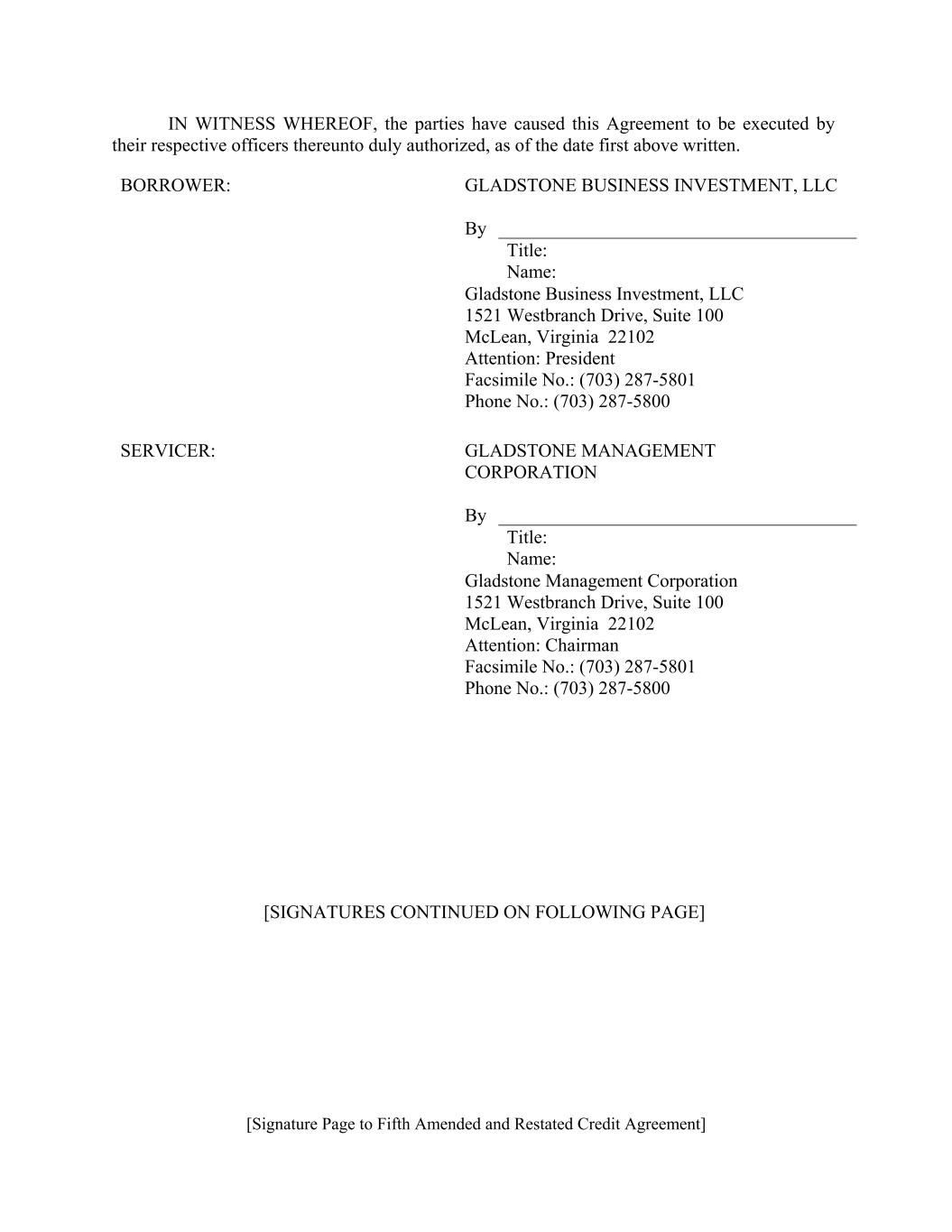 【签署页至第五份经修订和重述的信贷协议】借款人:服务商:Gladstone Management CORPORATION Gladstone BUSINESS INVESTMENT,LLC作为证人,双方已促使本协议由各自的高级管理人员正式授权签署,截至上述首次书面日期。标题:Name:Title:Name:Gladstone Management Corporation 1521 Westbranch Drive,Suite 100 McLean,Virginia 22102 Attention:主席传真号码:(703)287-5801电话号码:(703)287-5800 [ SIGNATURES continued on following page ] Gladstone Business Investment,LLC 1521 Westbranch Drive,Suite 100 McLean,Virginia 22102 Attention:President传真号码:(703)287-5801电话号码:(703)287-5800 by