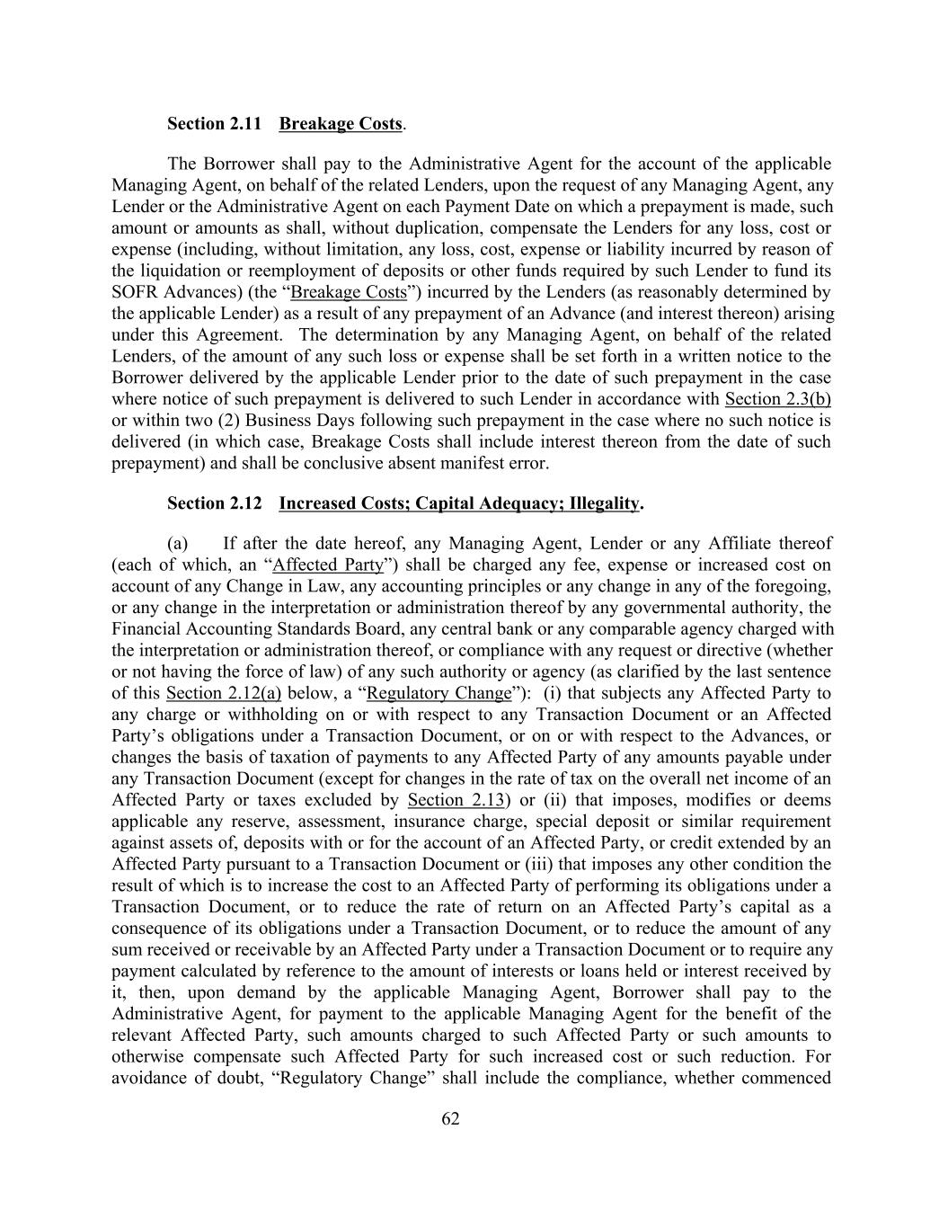 第2.11款破碎费。借款人应在提前还款的每个付款日,应任何管理代理人、任何贷款人或行政代理人的要求,代表相关贷款人向适用的管理代理人账户的行政代理人支付一笔或多笔金额,不得重复,以补偿贷款人的任何损失、成本或费用(包括但不限于任何损失、成本、因清算或重新雇用该贷款人为其SOFR垫款提供资金所需的存款或其他资金而产生的费用或负债(“破产成本”)由贷款人(由适用的贷款人合理确定)因根据本协议产生的任何预付款(及其利息)而产生。任何管理代理人代表相关贷款人确定任何该等损失或费用的金额,须在适用贷款人根据第2.3(b)条向该贷款人交付该等提前还款通知的情况下,或在该等提前还款通知未交付的情况下,在该提前还款通知后两(2)个营业日内(在该情况下,破碎费应包括自该预付款项之日起的利息),且无明显错误为结论性的。第2.12节增加成本;资本充足;违法。(a)如在本协议日期后,任何管理代理人、贷款人或其任何关联机构(每一方均为“受影响方”)应因任何法律变更、任何会计原则或上述任何一项的变更,或任何政府当局、财务会计准则委员会、任何中央银行或负责解释或管理其解释或管理的任何类似机构对其解释或管理的任何变更而被收取任何费用、开支或增加的成本,或遵守任何此类当局或机构的任何请求或指示(无论是否具有法律效力)(如下文第2.12(a)节最后一句所澄清,“监管变更”):(i)使任何受影响方对任何交易文件或受影响方在交易文件下的义务或对垫款或对垫款承担任何费用或预扣,或更改根据任何交易文件向任何受影响方支付的任何应付款项的征税基础(受影响方整体净收益的税率变化或第2.13节排除的税款除外)或(ii)对受影响方的资产、存放于或为受影响方账户的存款征收、修改或认为适用的任何准备金、评估、保险费、特别存款或类似要求,或受影响方根据交易文件或(iii)施加任何其他条件而提供的信贷,其结果是增加受影响方履行其在交易文件下的义务的成本,或因受影响方在交易文件下的义务而降低其资本回报率,或减少受影响方根据交易文件收到或应收的任何款项的金额或要求参照其持有的利息或贷款的金额或收到的利息计算的任何付款,则根据适用的管理代理人的要求,借款人应向行政代理人支付为相关受影响方的利益向适用的管理代理人支付的向该受影响方收取的金额或以其他方式补偿该受影响方的此类增加的成本或此类减少的金额。为免生疑问,“监管变更”应包括合规性,是否已开始62