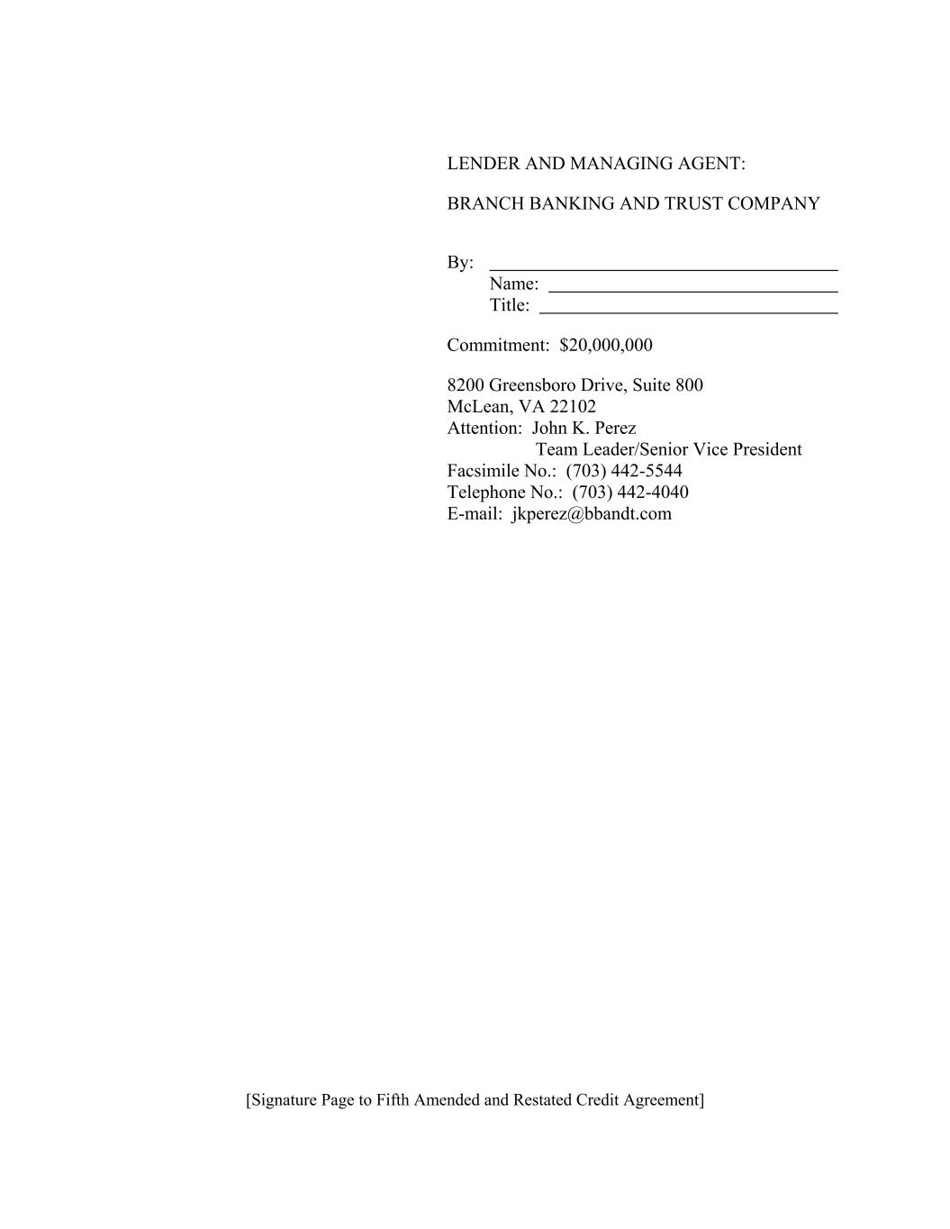 贷款人和管理代理人:分支银行和信托公司:姓名:标题:承诺:20,000,000美元8200 Greensboro Drive,Suite 800 McLean,VA 22102收件人:John K. Perez团队负责人/高级副总裁传真号码:(703)442-5544电话号码:(703)442-4040电子邮件:jkperez@bbandt.com [签署页至第五次修订和重述的信贷协议]